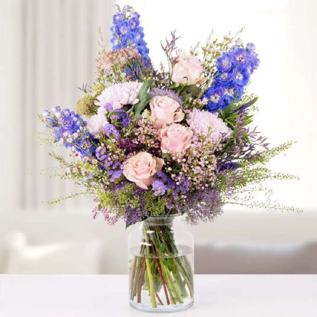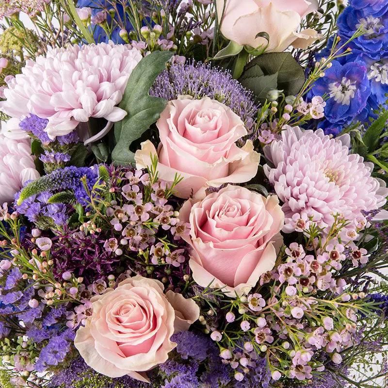 Интенсивный синий дельфиниум, фиолетовый лимониум, элегантные розы и анастасии.