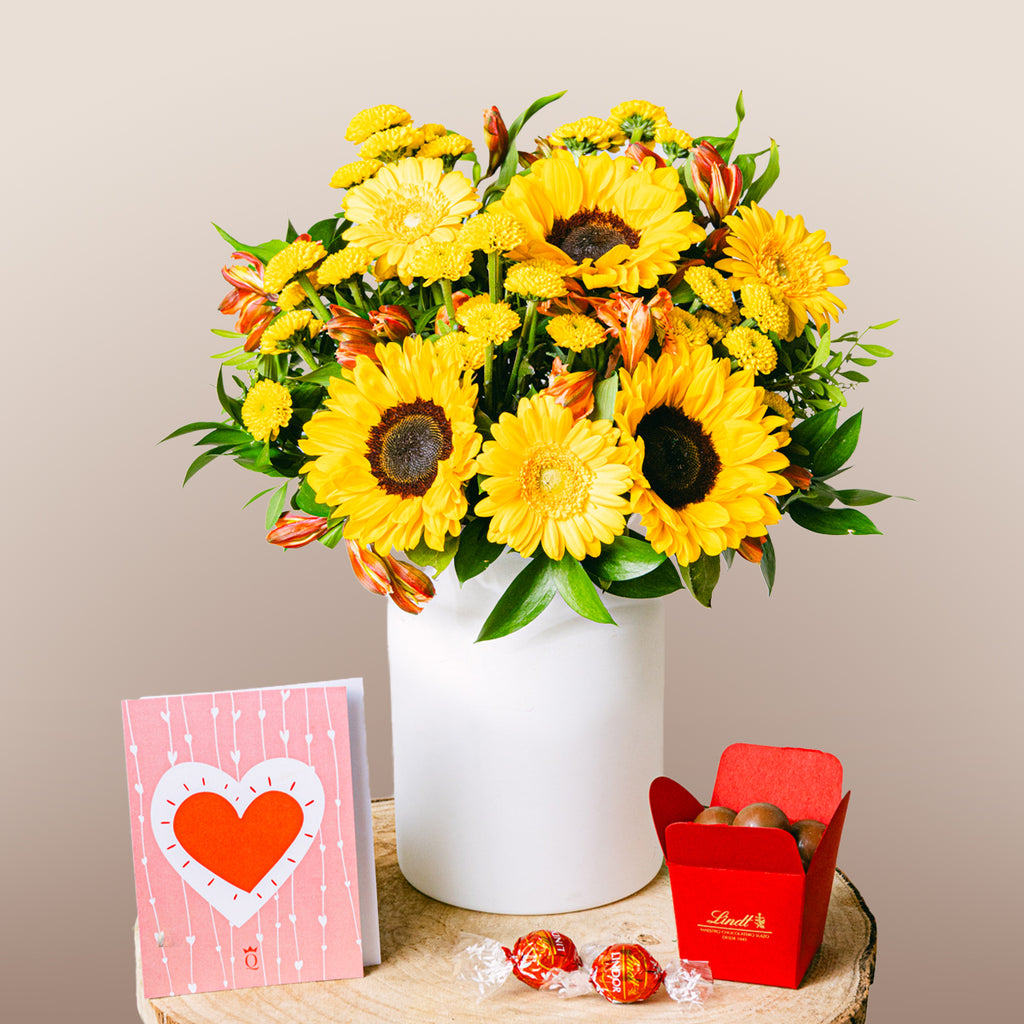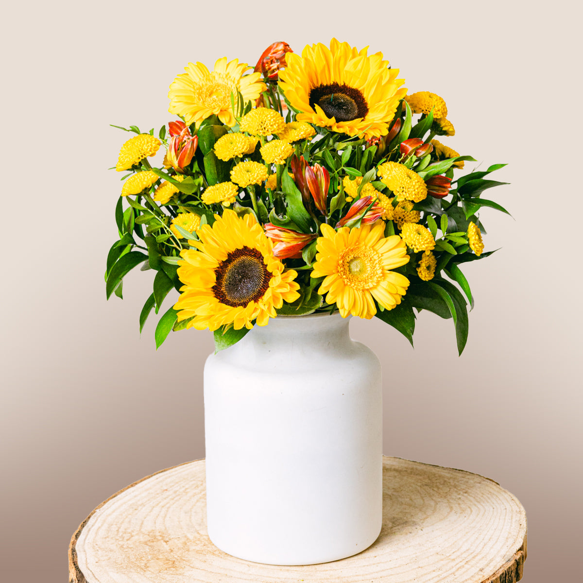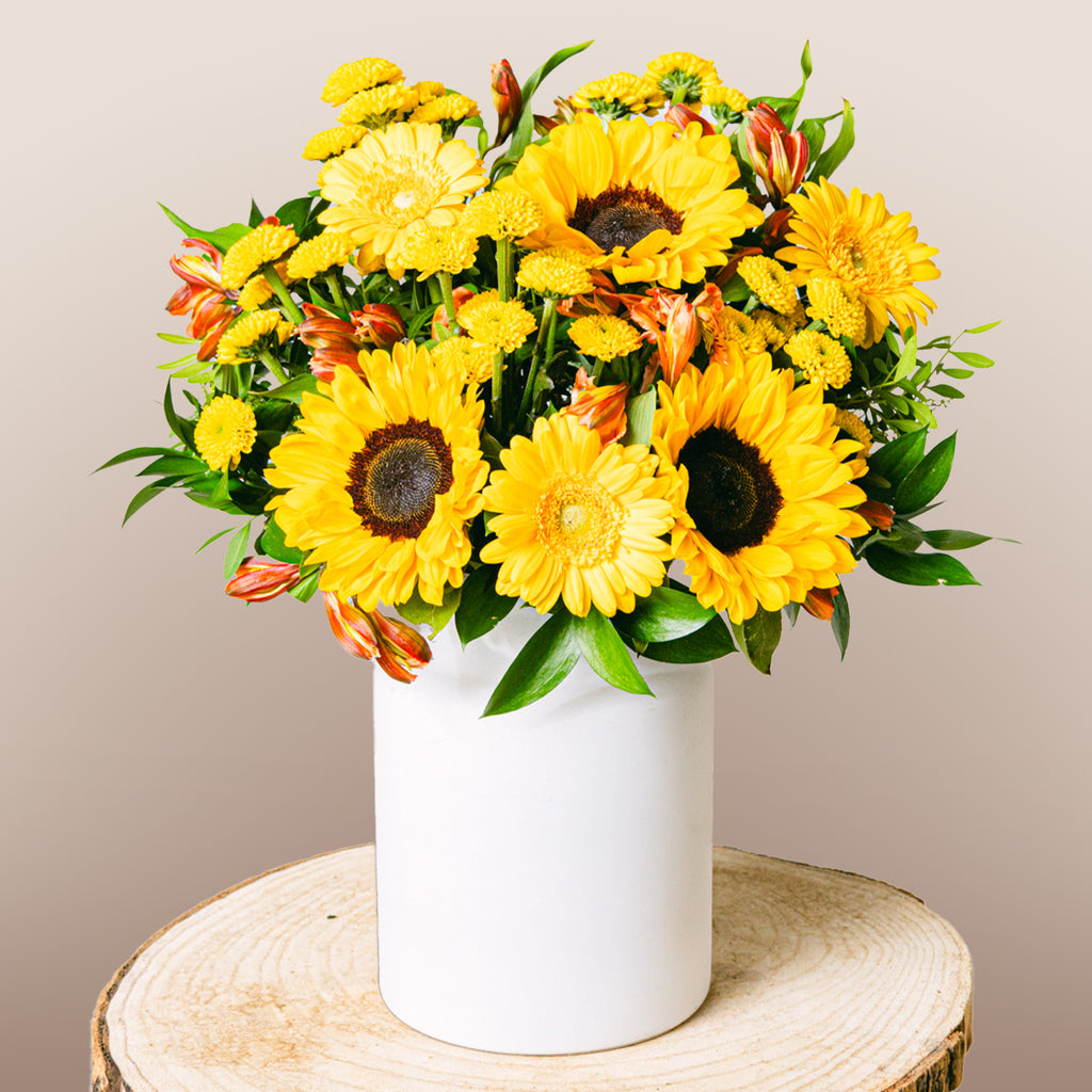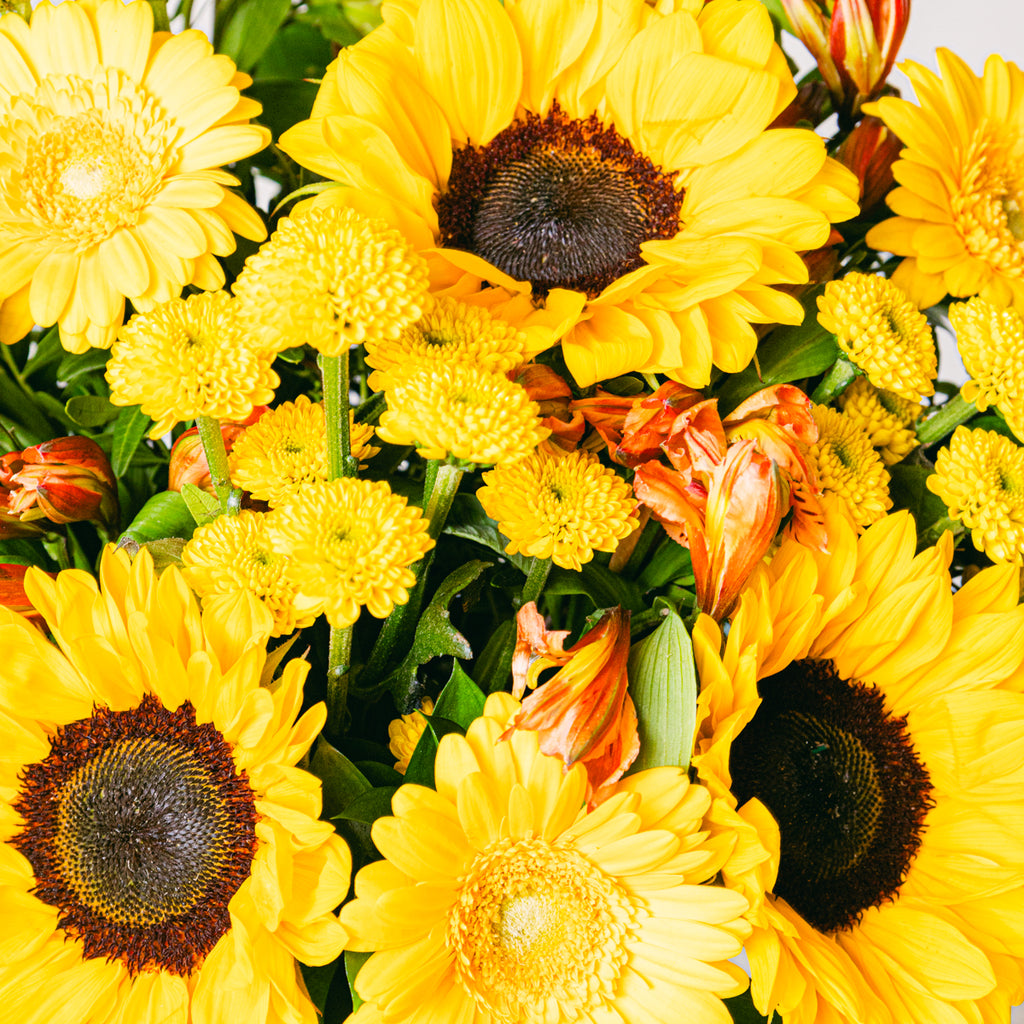 Сочетание подсолнухов, хризантем, альстромерий и гербер – это взрыв позитива и хорошего настроения. Этот букет станет прекрасным подарком для тех, кто ценит яркость и оригинальность.