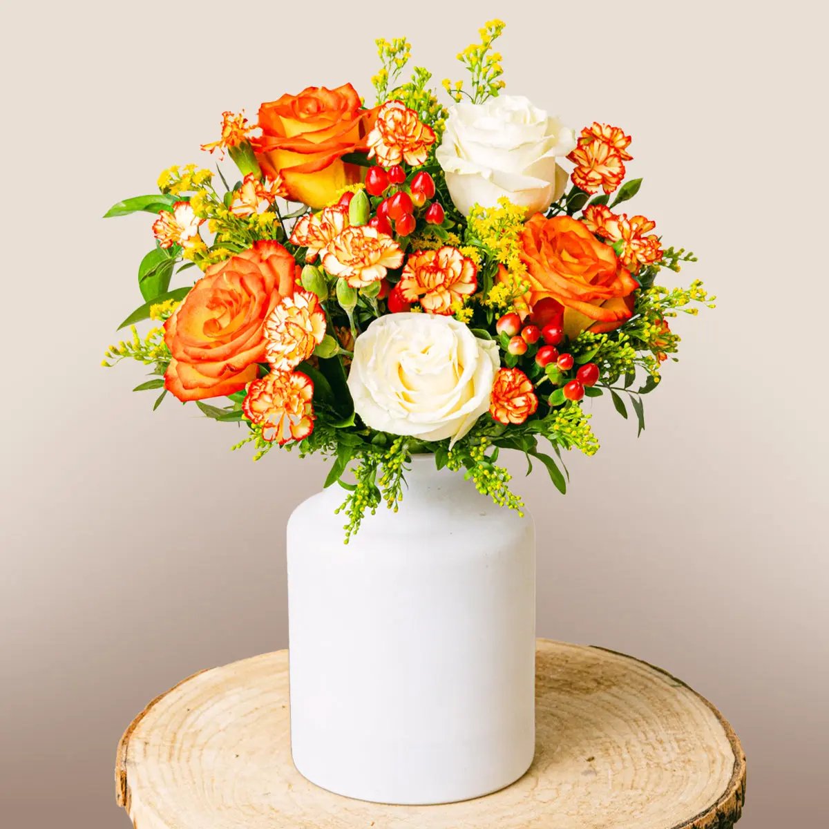 Этот букет сочетает в себе тепло оранжевых роз и гвоздик с нежностью белых роз, создавая гармоничную и радостную композицию, идеальную для любого праздника.