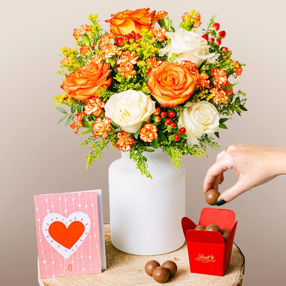 Насладитесь этим элегантным сочетанием оранжевого и розового, которое дарит тепло и радость, но при этом является элегантным. Баланс белых и оранжевых роз с оранжевой гвоздикой создаёт идеальное сочетание для создания лучшего подарка, который станет прекрасным дополнением к праздничному интерьеру. Этот букет идеально подходит для особого случая и для создания уютного дома, наполненного теплом и радостью.