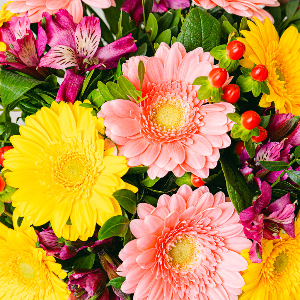 В самом счастливом месяце года этот прекрасный букет из гербер, альстромерий и гиперикума в розовых и жёлтых тонах станет идеальным подарком, чтобы оживить любое пространство. Его яркие цвета вызывают улыбки и наполняют жизнью и положительной энергией каждого, кто его получает.