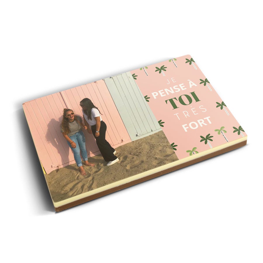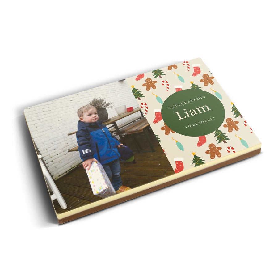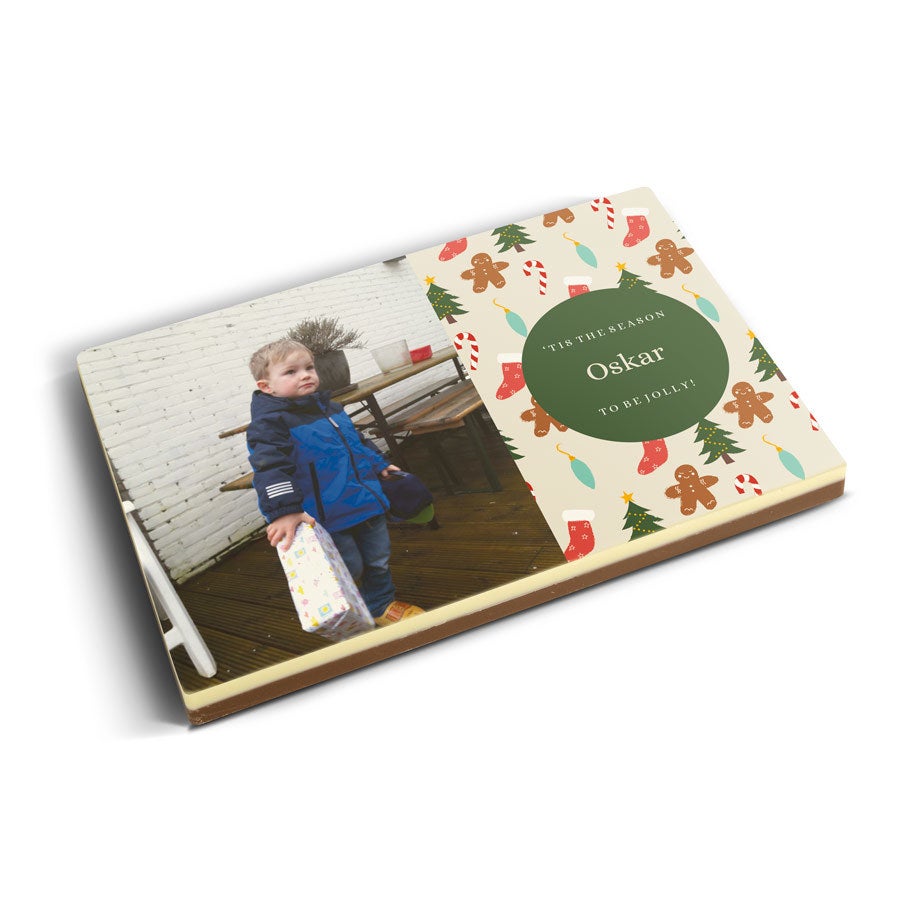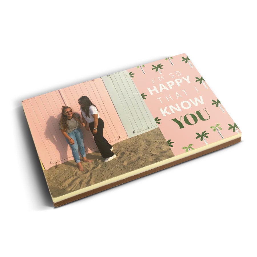 Подробнее о фотографии на шоколаде:Вкус шоколада: молочный с белым верхним слоемРазмер: 16,3 x 10,8 x 1,2 смВес: 240 граммов шоколадаПерсонализация: печать с фото и логотипомПечать: полноцветная съедобная печатьПри температуре 25°C или выше рекомендуем добавить в заказ охлаждающий элемент. Рекомендации по хранению: Можно хранить до 10 недель в прохладном, темном месте при температуре от 14 до 18°C. Информация об аллергенах: содержит сою, молоко и может содержать следы орехов.Состав:Молочный шоколад: сахар, какао-масло, сухое цельное молоко, какао-масса, эмульгатор (соевый лецитин), натуральный ароматизатор ванили. Не менее 34% какао-продуктов. Белый шоколад: сахар, какао-масло, сухое цельное молоко, эмульгатор (соевый лецитин), натуральный ароматизатор ванили. Содержание какао-продуктов не менее 29%.
