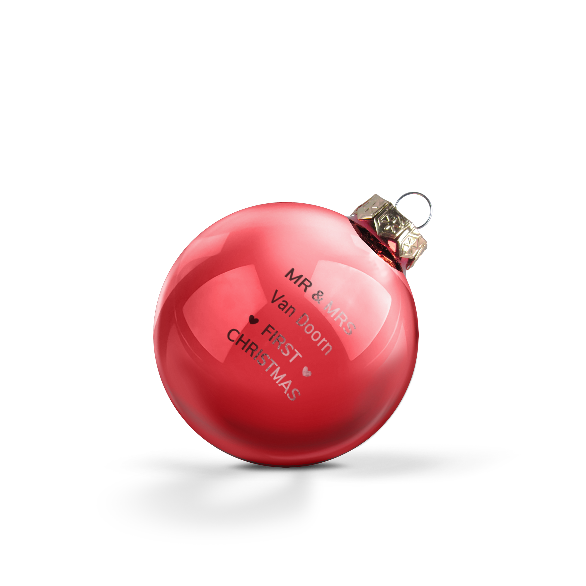 Подробнее о стеклянных елочных шарах: Количество: комплект из 2 штук Размер: Ø 8 см Материал: высококачественное глянцевое стекло (непрозрачное) Цвета: золотой, серебряный и красный Персонализация: с именем и/или текстом Гравировка: высокоточная лазерная техника Расположение: односторонняя, по центру шара Корона: золотая с нитью