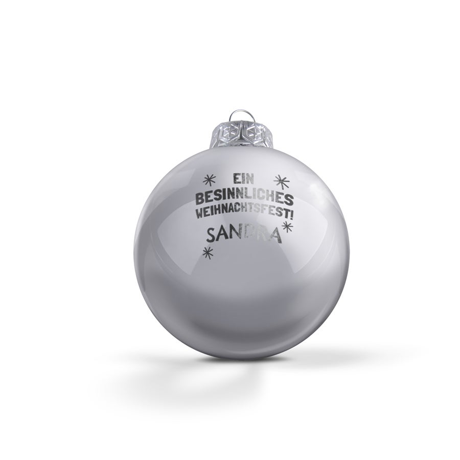 Подробнее о стеклянных елочных шарах: Количество: комплект из 2 штук Размер: Ø 8 см Материал: высококачественное глянцевое стекло (непрозрачное) Цвета: золотой, серебряный и красный Персонализация: с именем и/или текстом Гравировка: высокоточная лазерная техника Расположение: односторонняя, по центру шара Корона: золотая с нитью