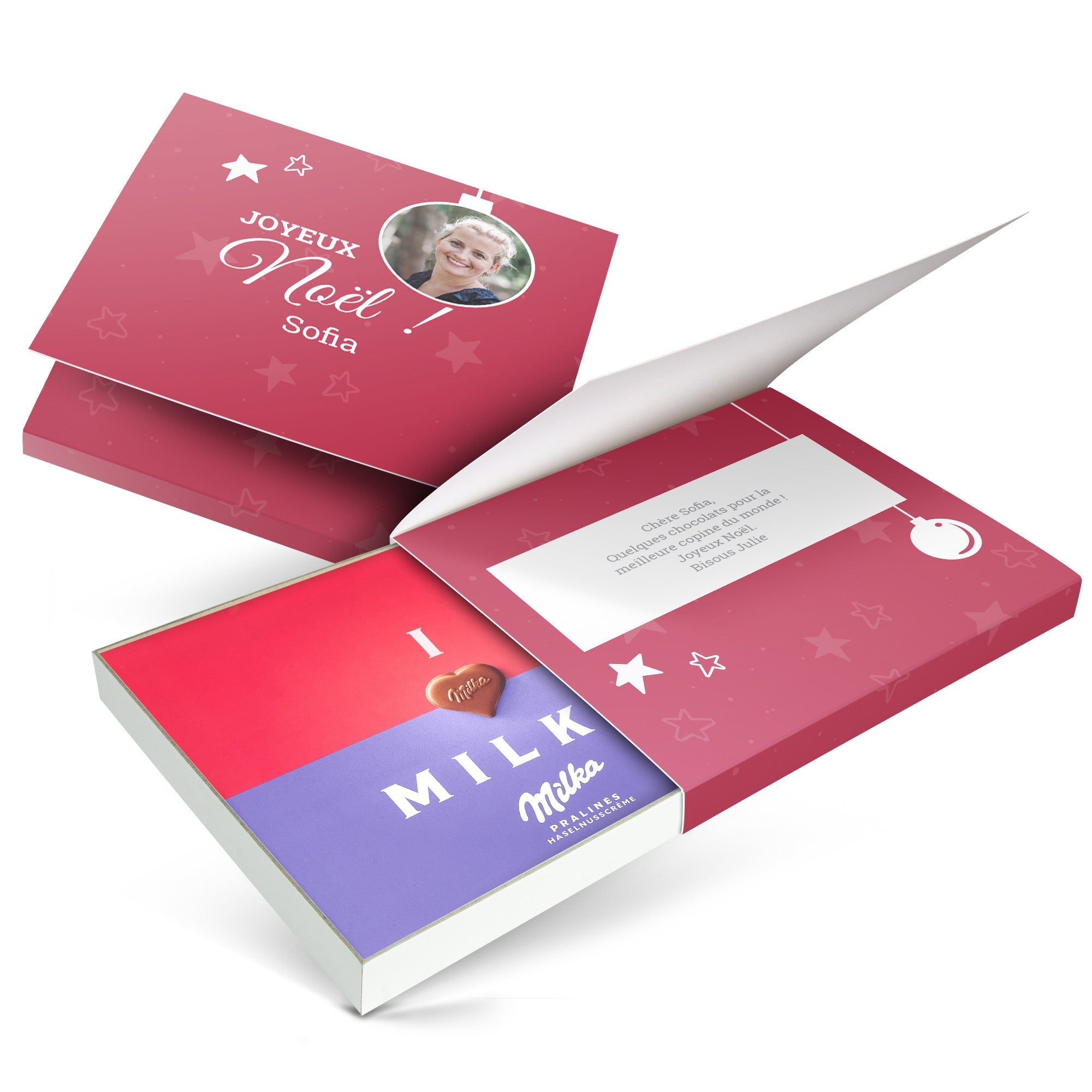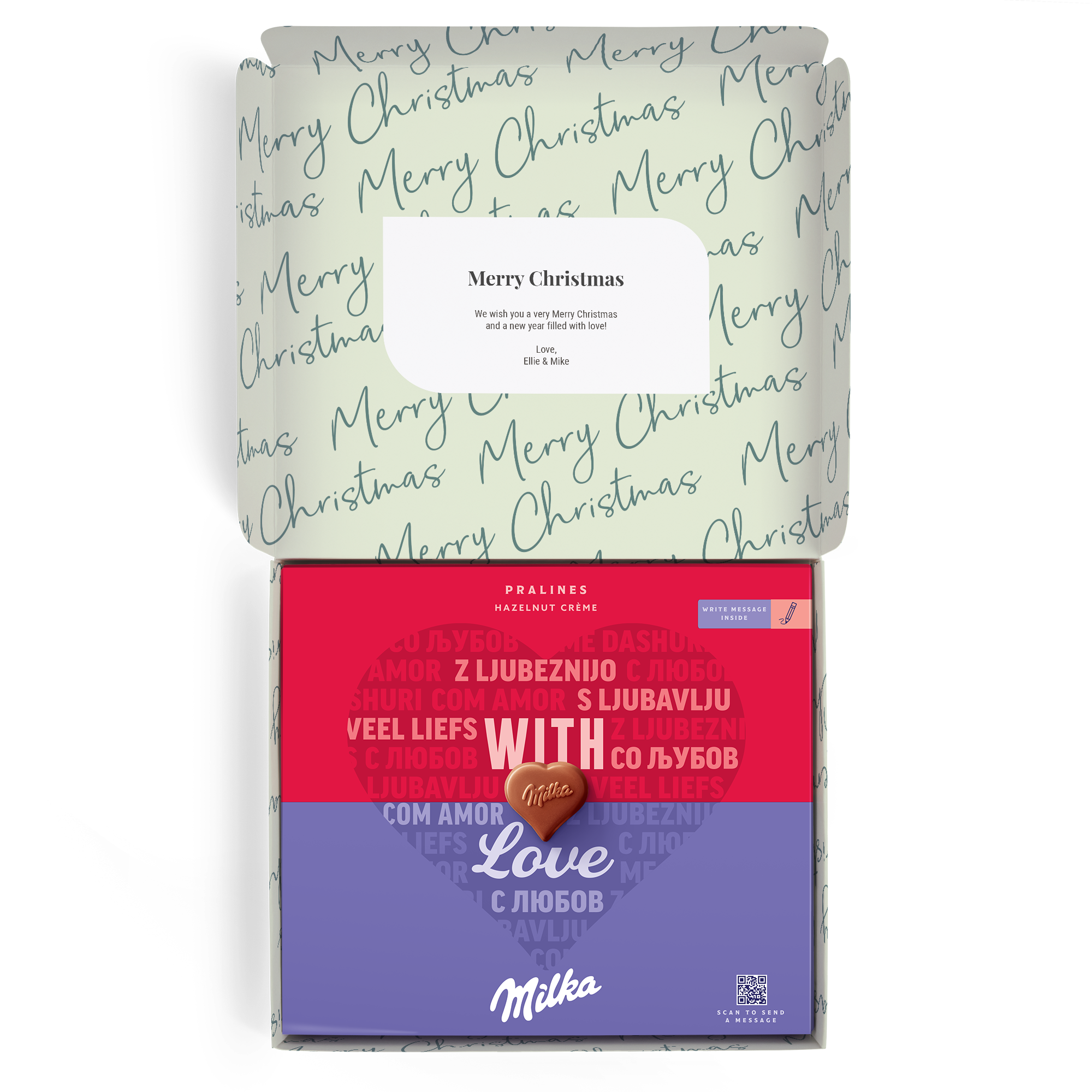 Веселая подарочная коробка Milka к Рождеству. Вкусные шоколадные конфеты с кремовой начинкой из лесного ореха и нуги и вашей персонализацией на коробке. Счастливого Рождества!