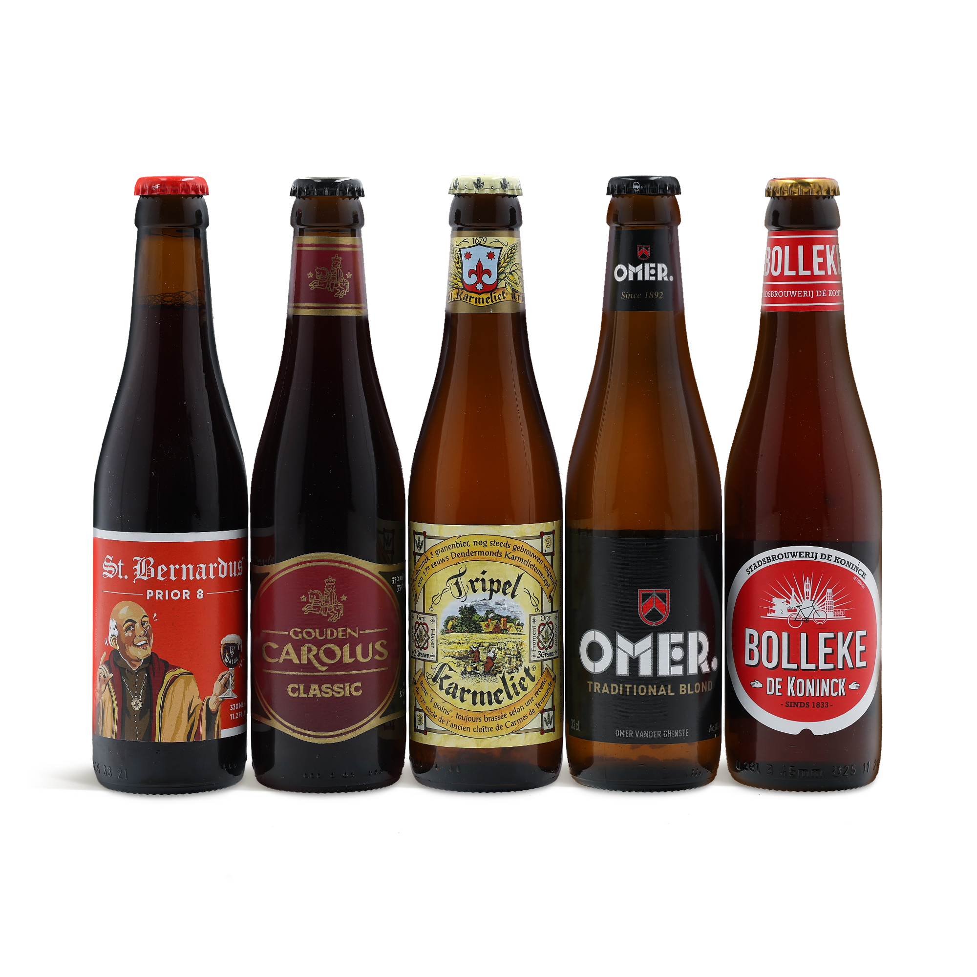 - Состав подарочного набора: Gouden Carolus Classic (8,5%), St. Bernardus (8,0%), Omer (8,0%), Tripel Karmeliet (8,0%), De Koninck (5,0%).