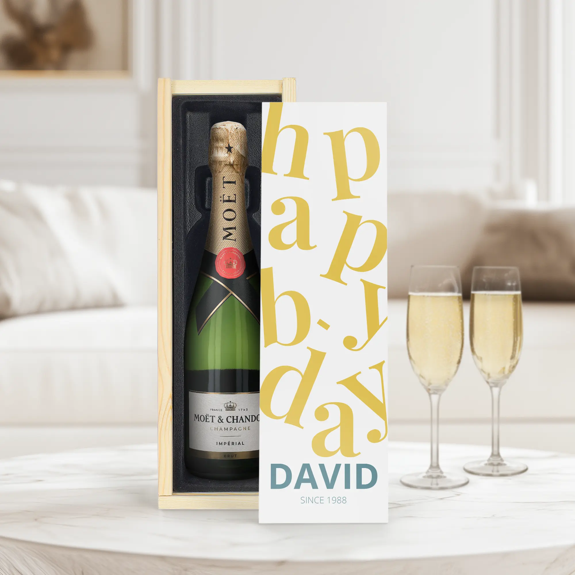 Восхитительная бутылка настоящего шампанского Moët & Chandon в гравированном деревянном футляре с вашим именем или текстом. Доступны различные размеры бутылок!