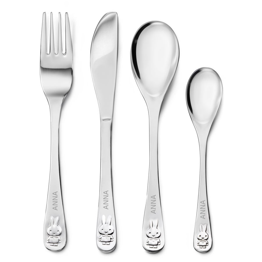 Персональный набор столовых приборов Miffy с гравировкой имени или текста. Набор из 4 предметов из блестящей нержавеющей стали, который можно мыть в посудомоечной машине. Классный подарок от Miffy!