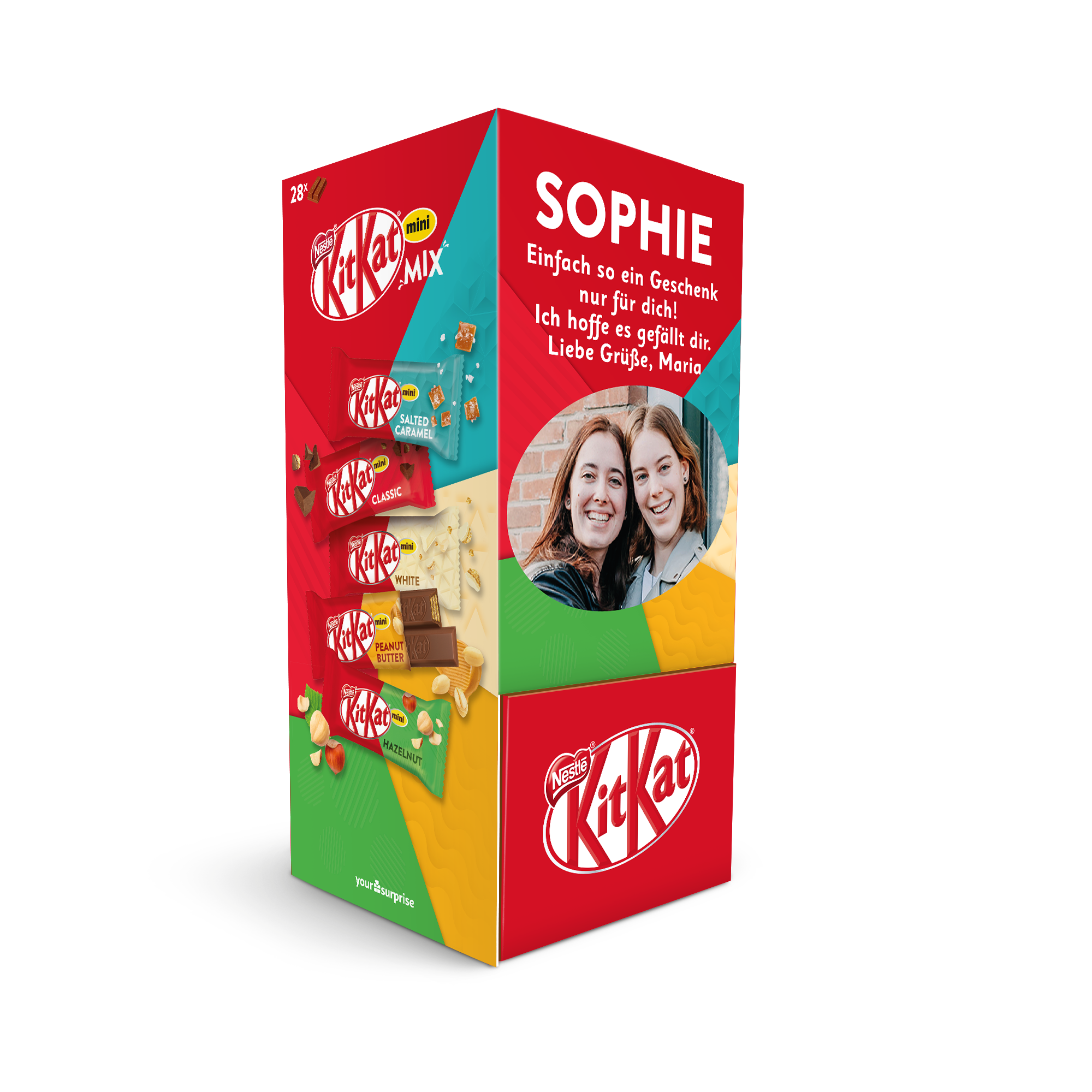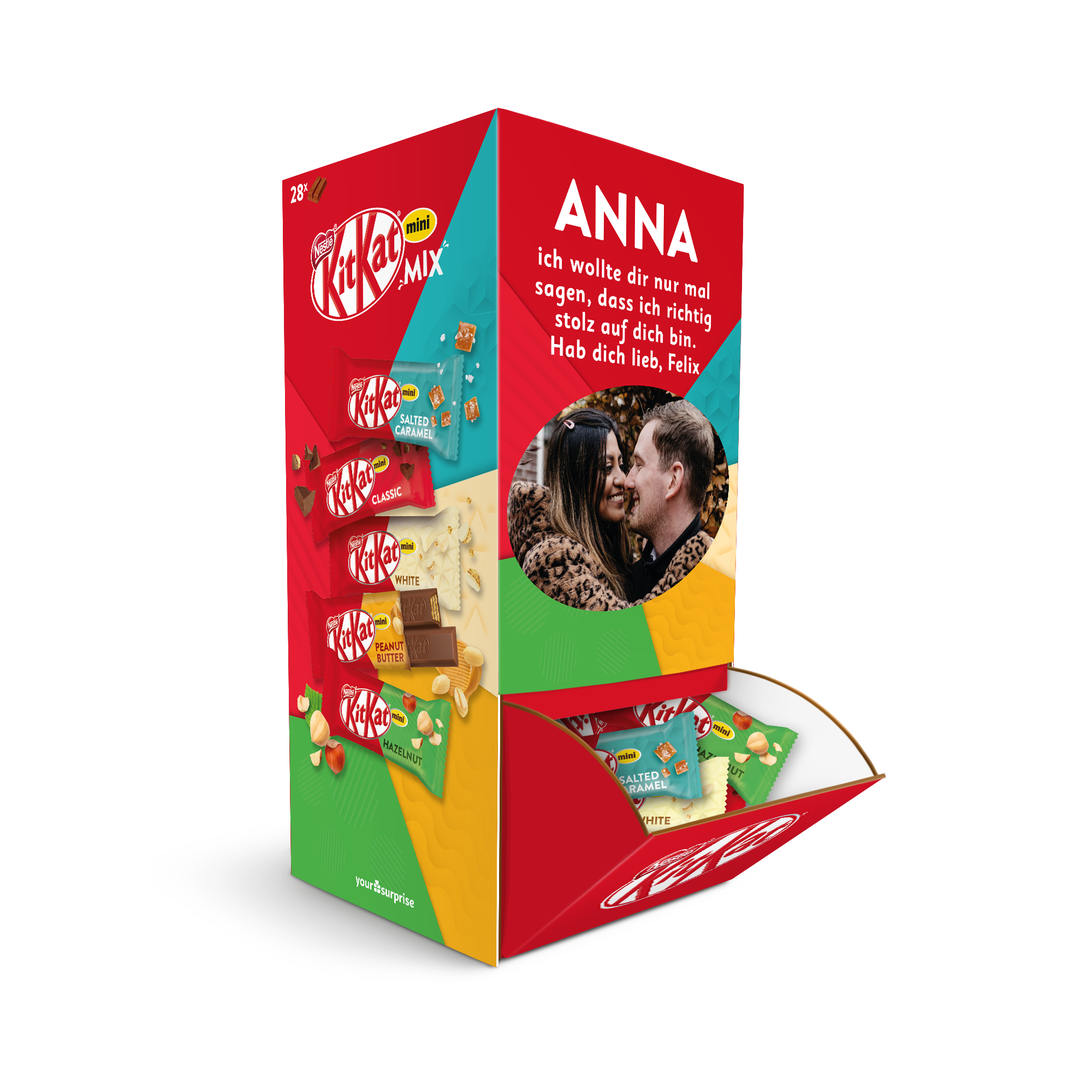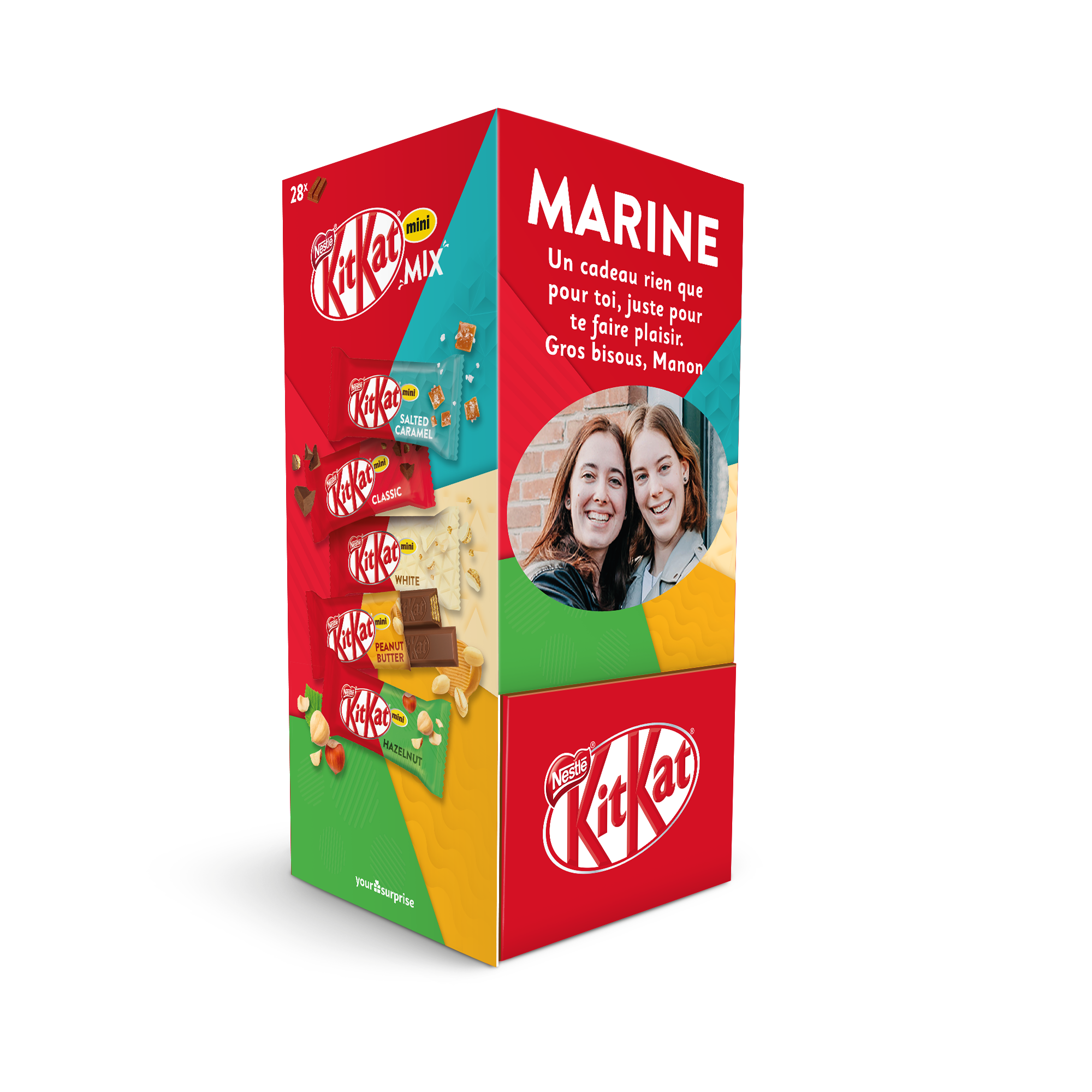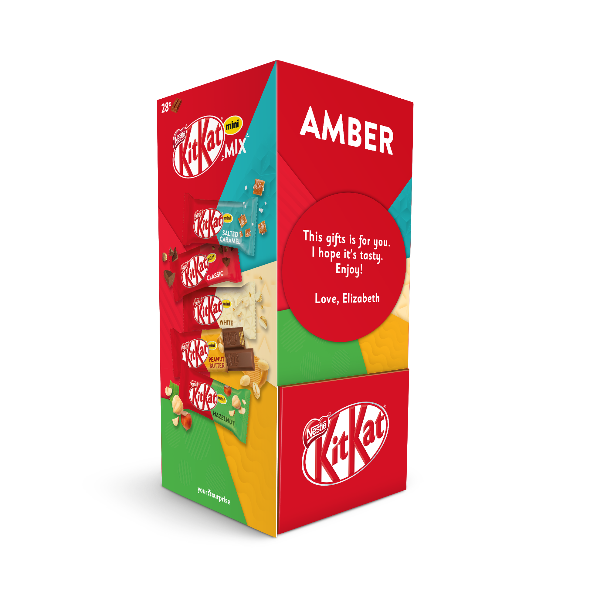 Подарочная коробка KitKat Mini Mix содержит 28 шоколадных конфет 5 разных вкусов и может быть персонализирована вашей фотографией и/или текстом по вашему выбору!