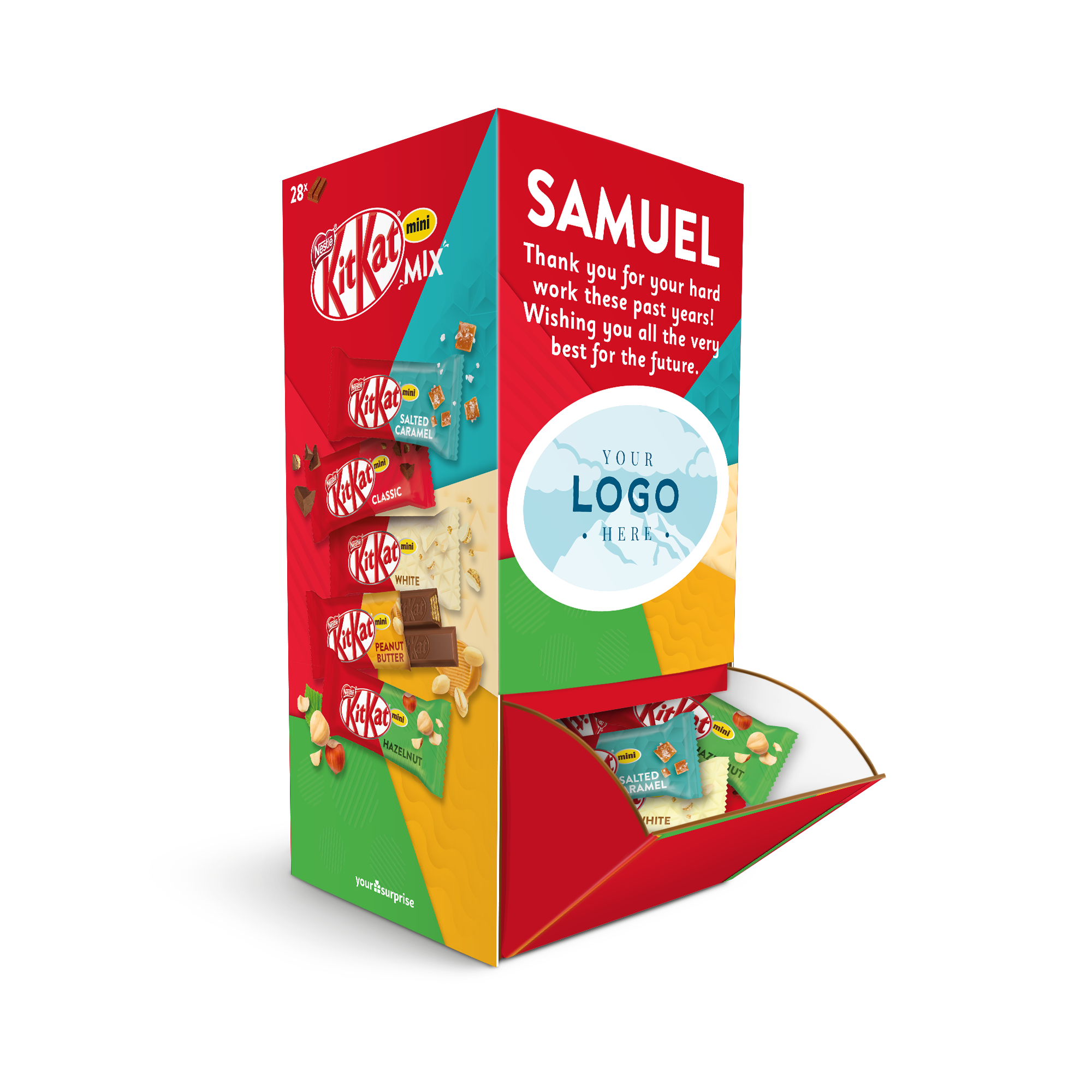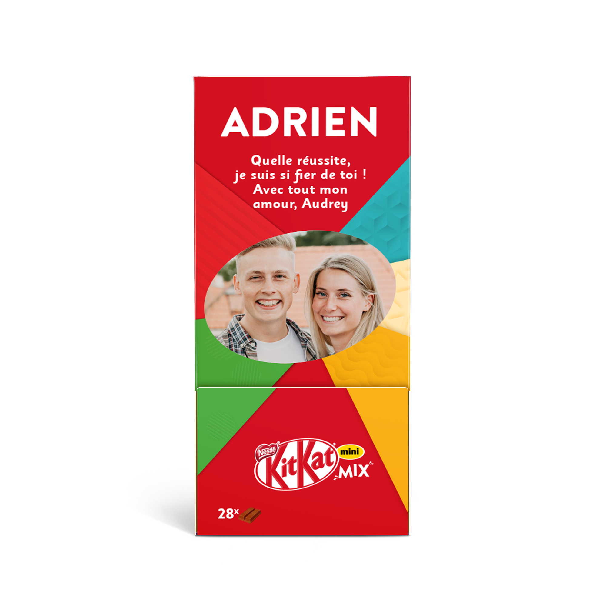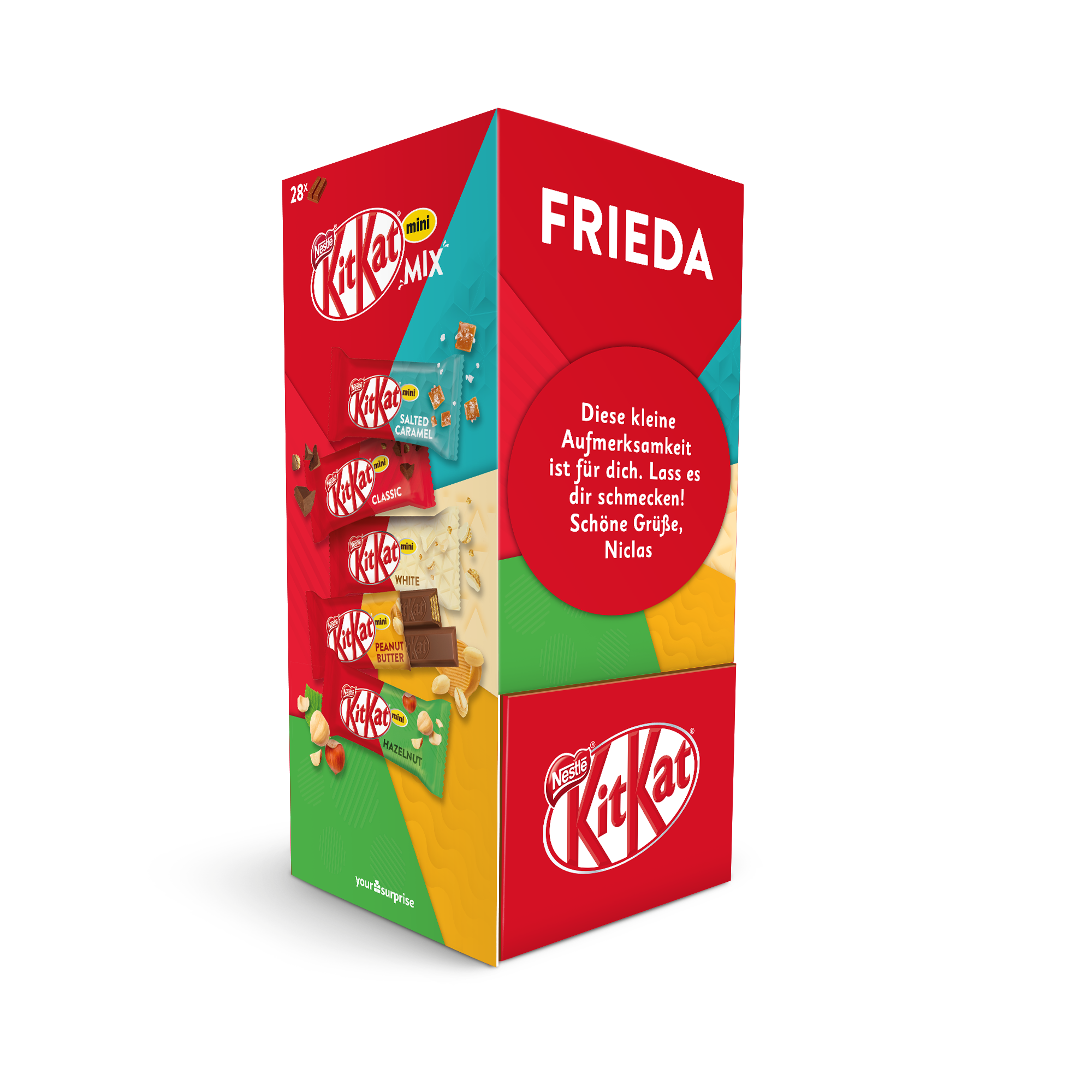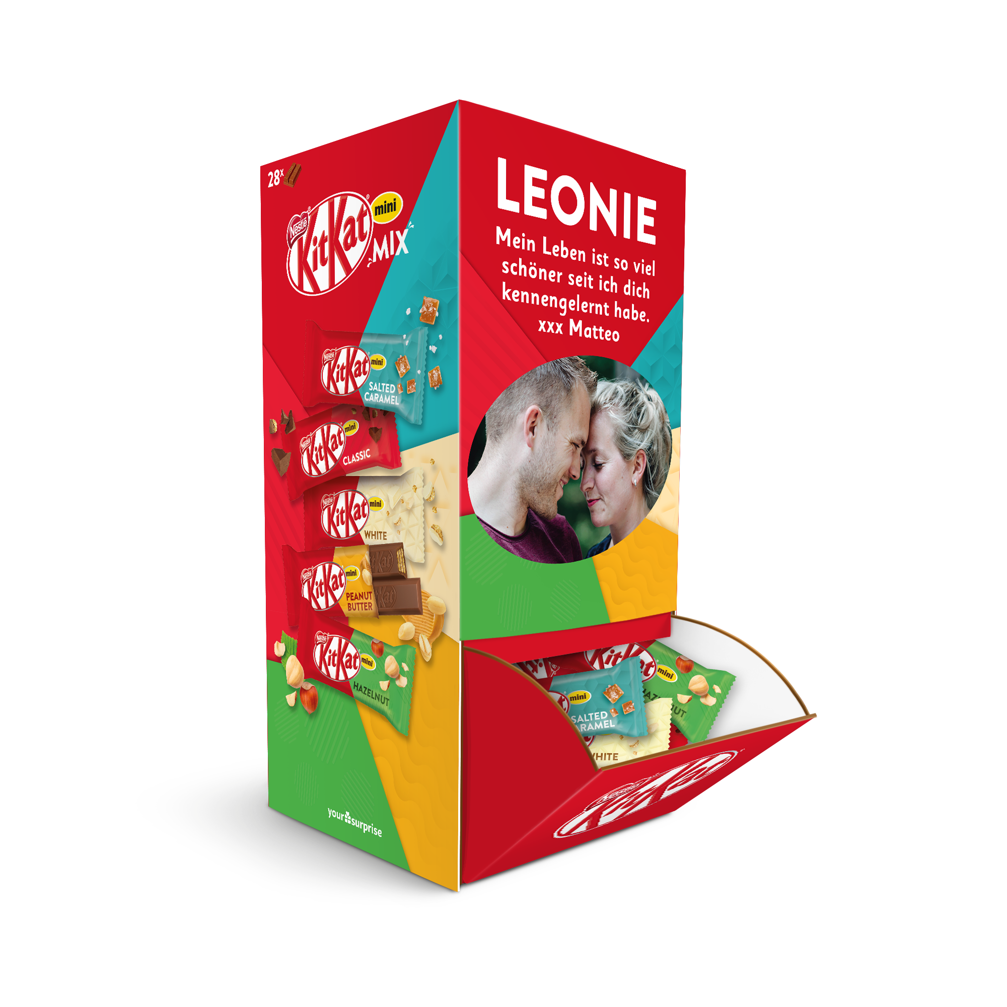Подарочная коробка KitKat Mini Mix содержит 28 шоколадных конфет 5 разных вкусов и может быть персонализирована вашей фотографией и/или текстом по вашему выбору!
