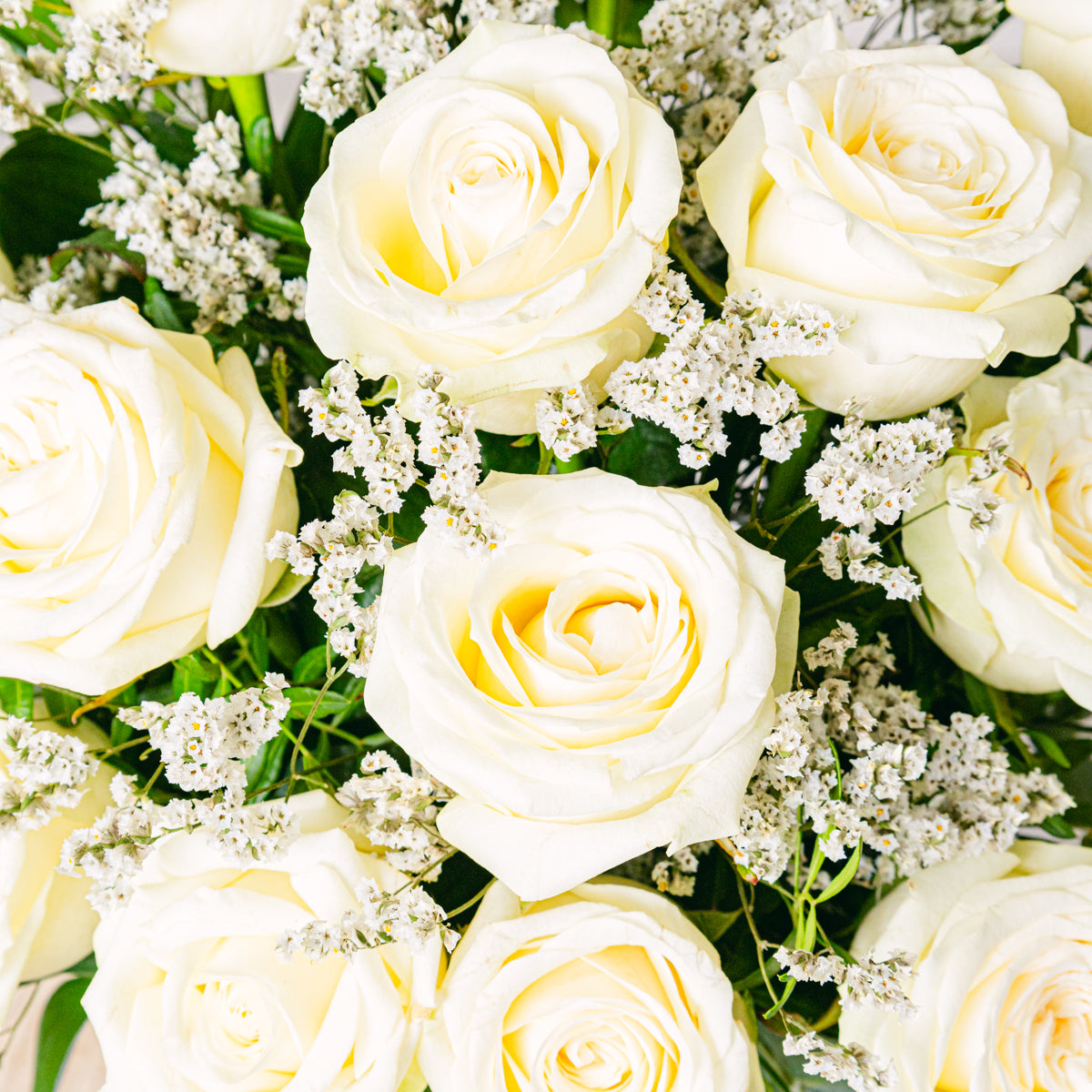 Дюжина белых роз, лимониум, элегантная упаковка.