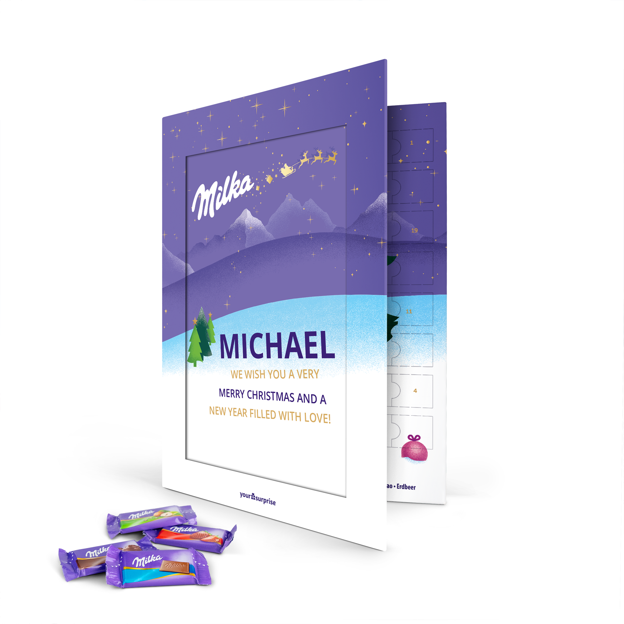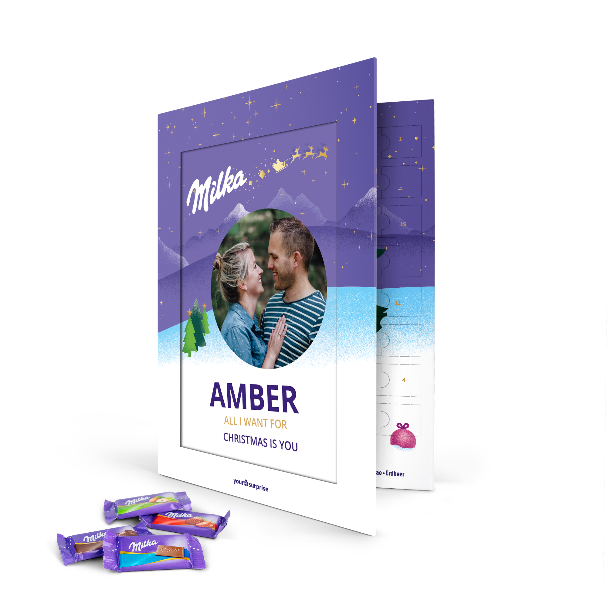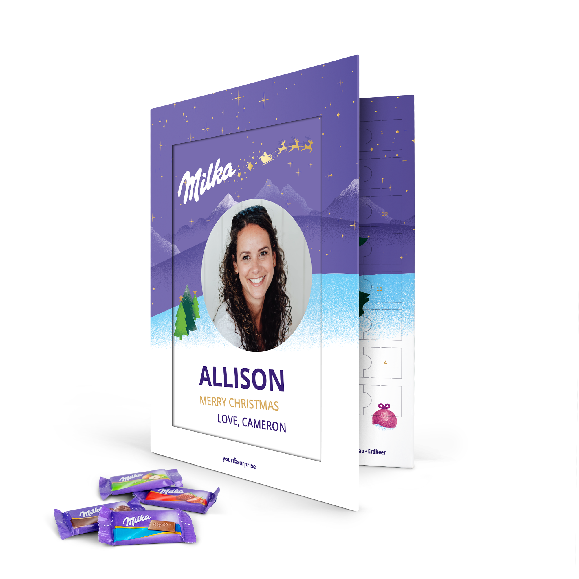 Адвент-календарь Milka с фотографией, именем и/или текстом. В набор входят 24 восхитительные шоколадки Milka. Вкусный обратный отсчет до Рождества!
