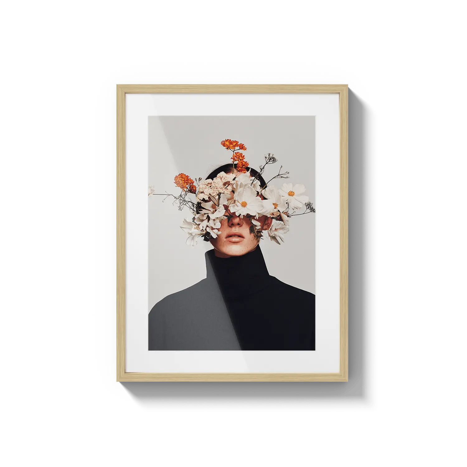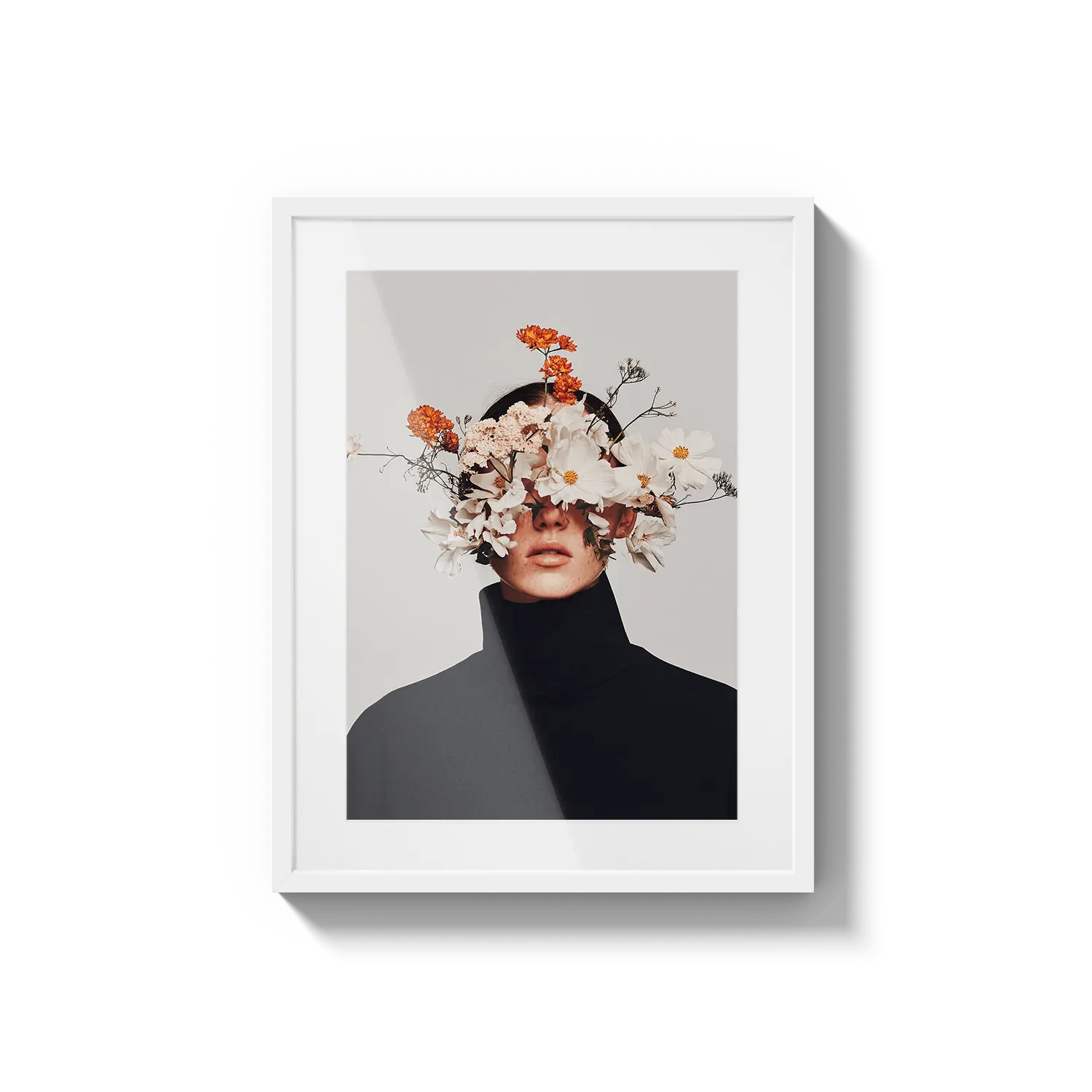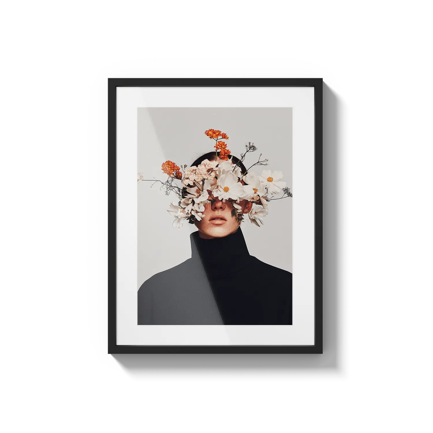 Безмятежный портрет, где цветы нежно распускаются вокруг лица, сочетая неподвижность и воображение. Нежный и выразительный подарок.