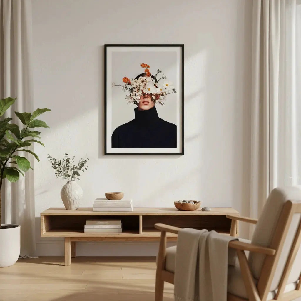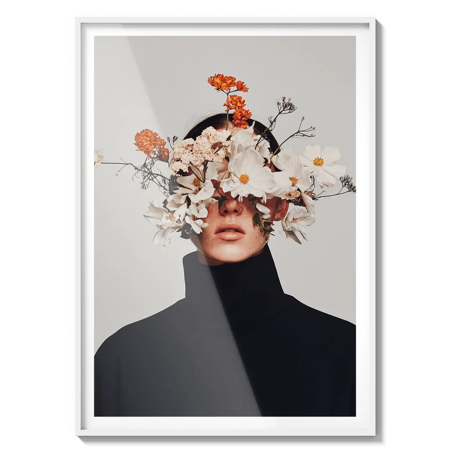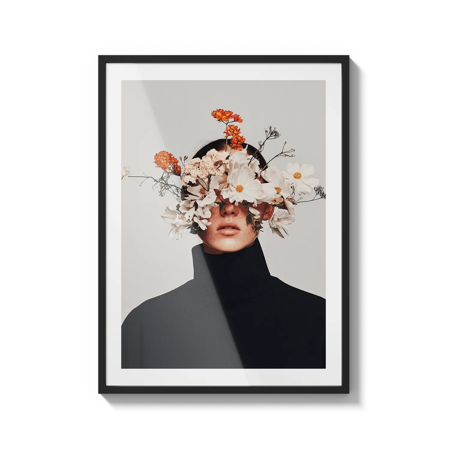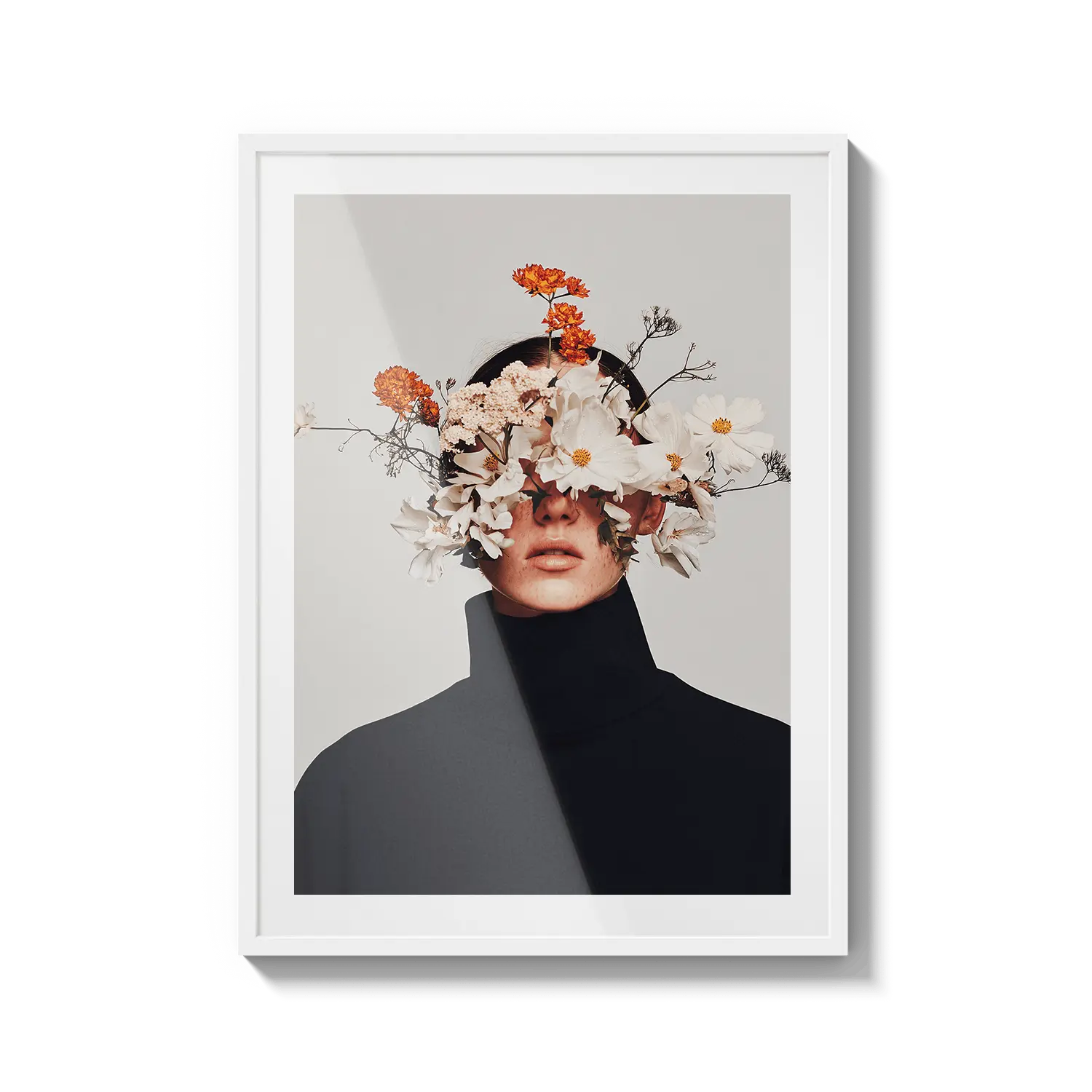 Безмятежный портрет, где цветы нежно распускаются вокруг лица, сочетая неподвижность и воображение. Нежный и выразительный подарок.