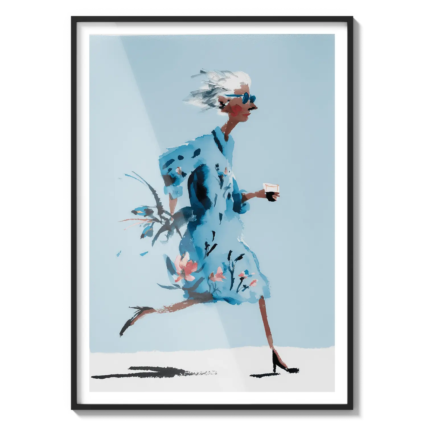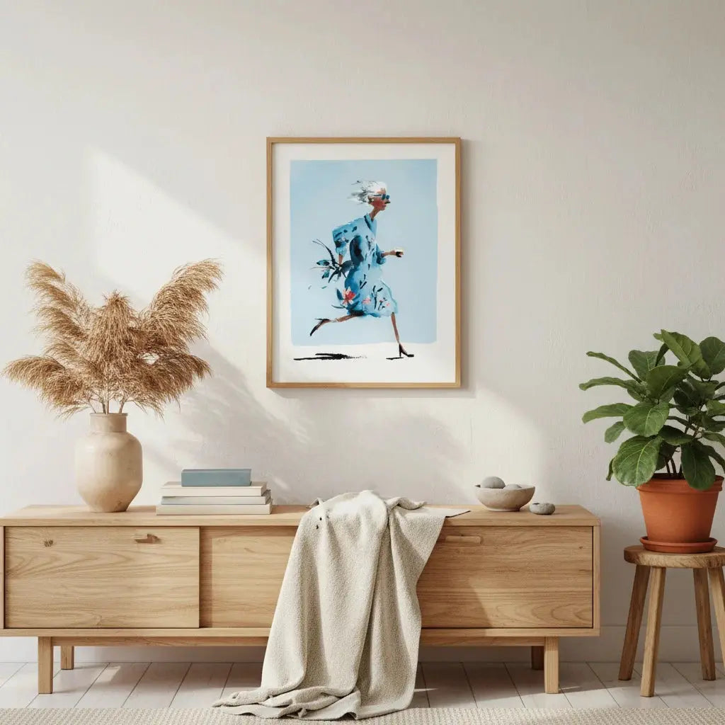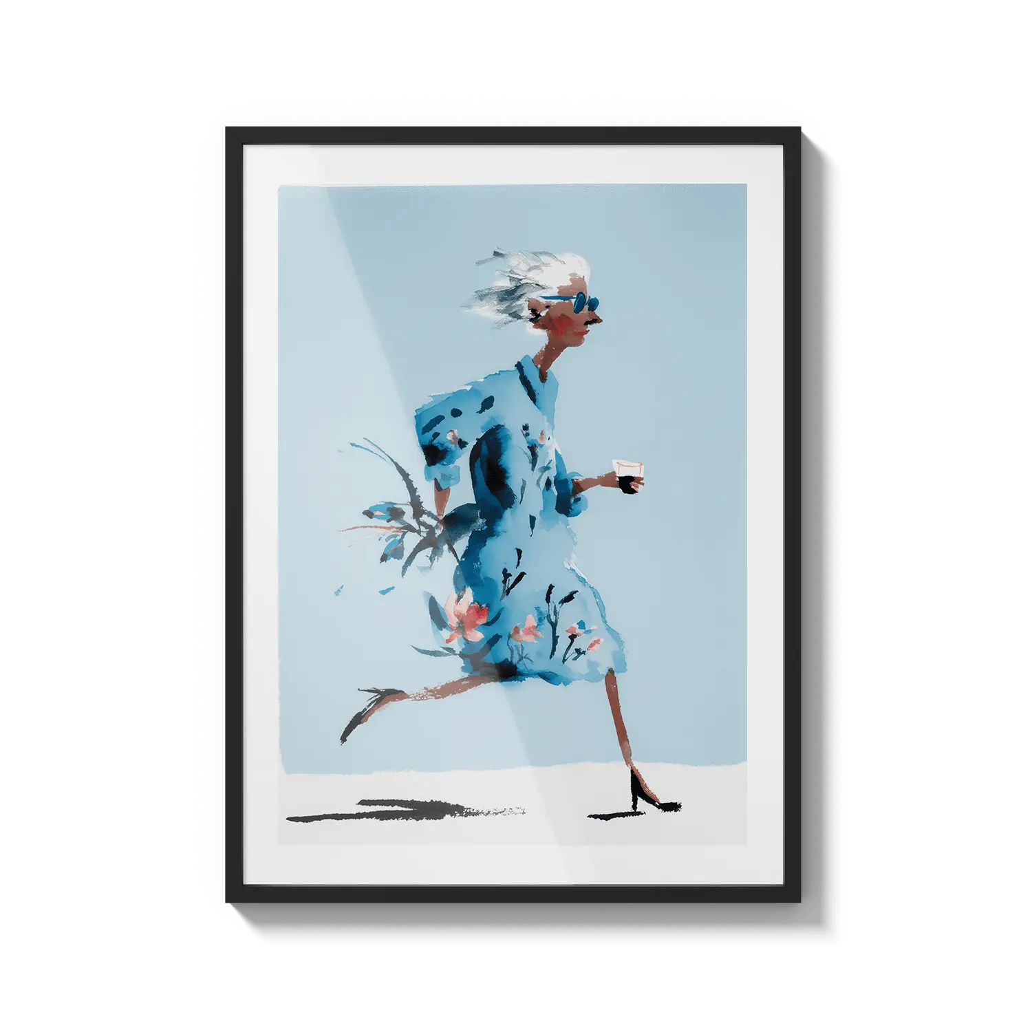Нежная иллюстрация женщины, идущей сквозь мягкие синие тона, вызывающая ощущение свободы и спокойной уверенности. Вдумчивое произведение искусства, которое можно предложить тому, кто ценит спокойные моменты.
