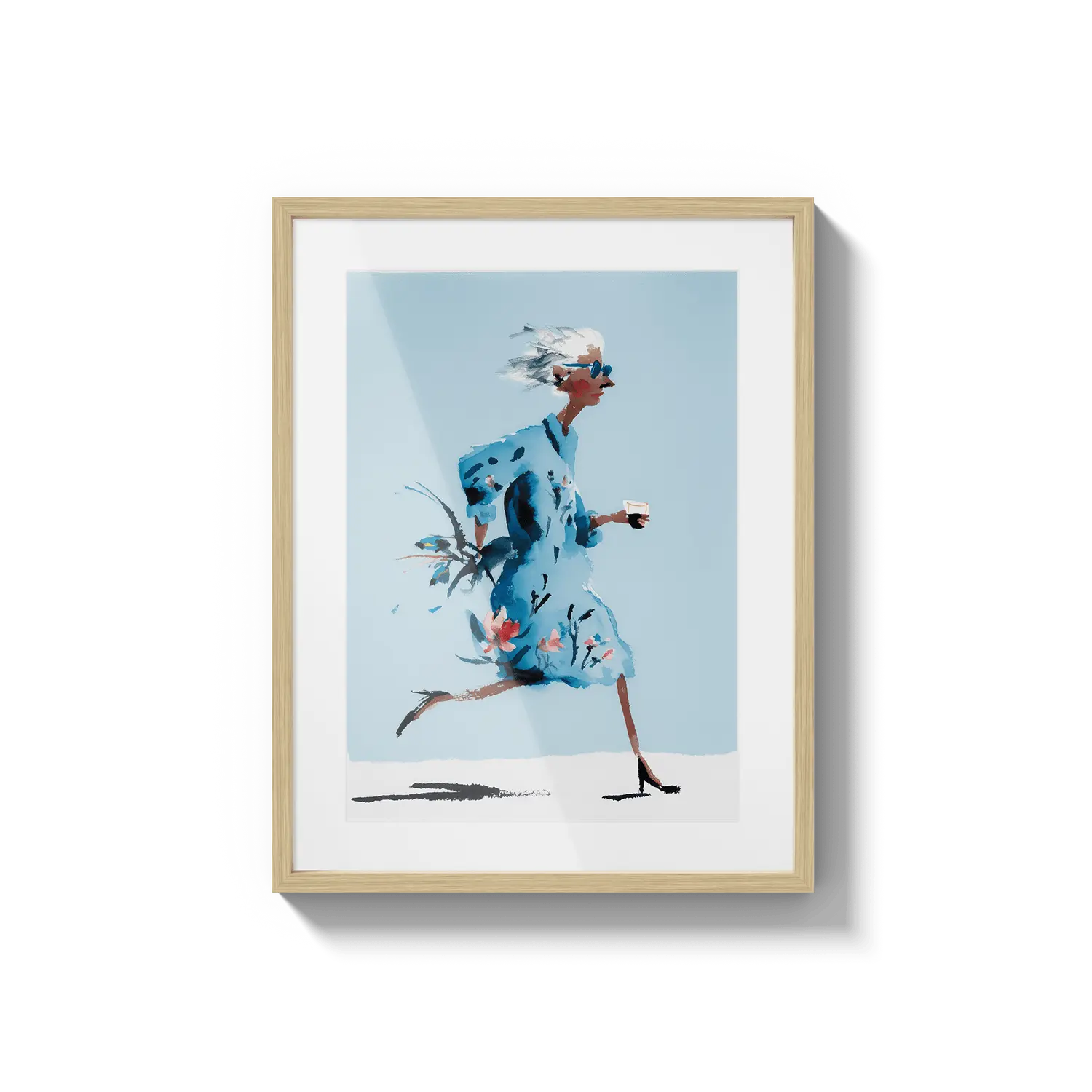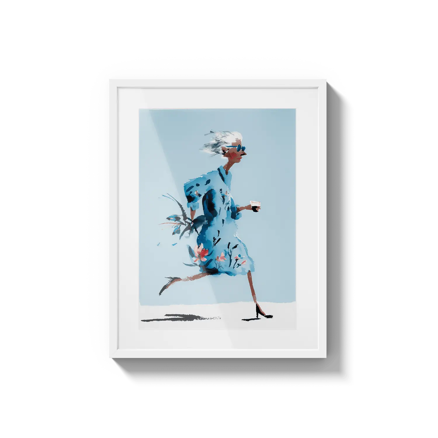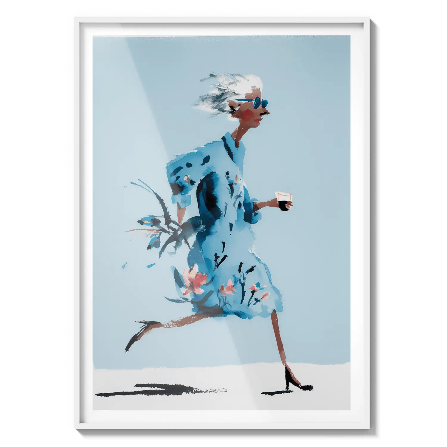 Нежная иллюстрация женщины, идущей сквозь мягкие синие тона, вызывающая ощущение свободы и спокойной уверенности. Вдумчивое произведение искусства, которое можно предложить тому, кто ценит спокойные моменты.