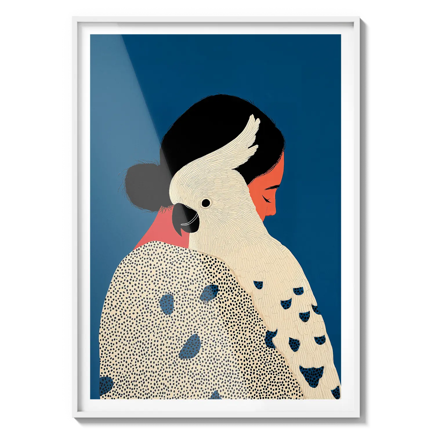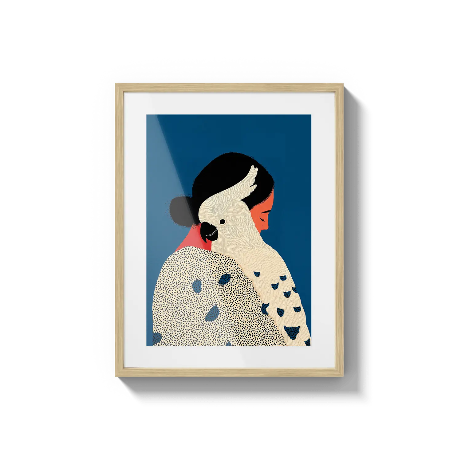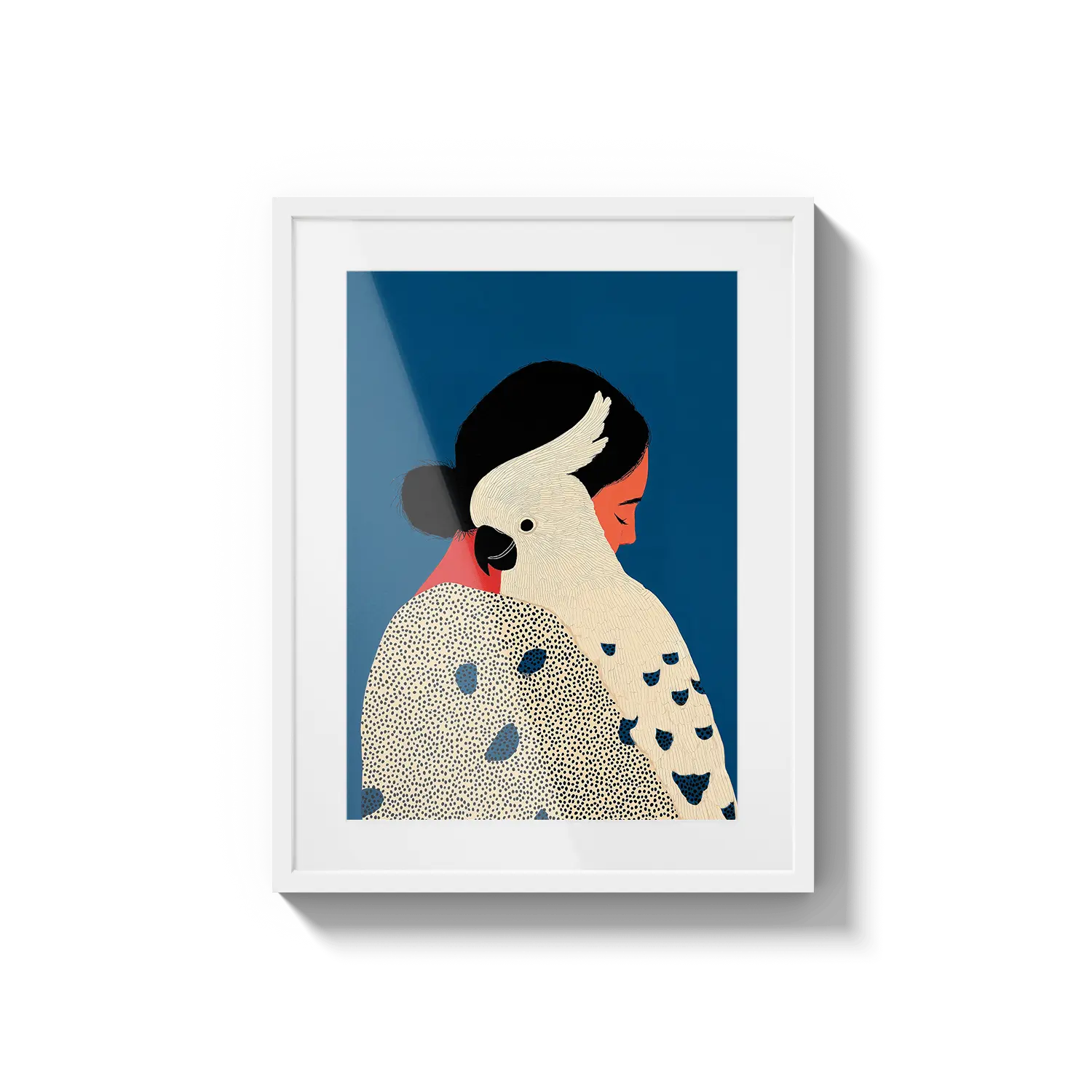 Мягкая иллюстрация белого какаду на фоне нежных голубых тонов, излучающая спокойное очарование. Прекрасный, нежный подарок.