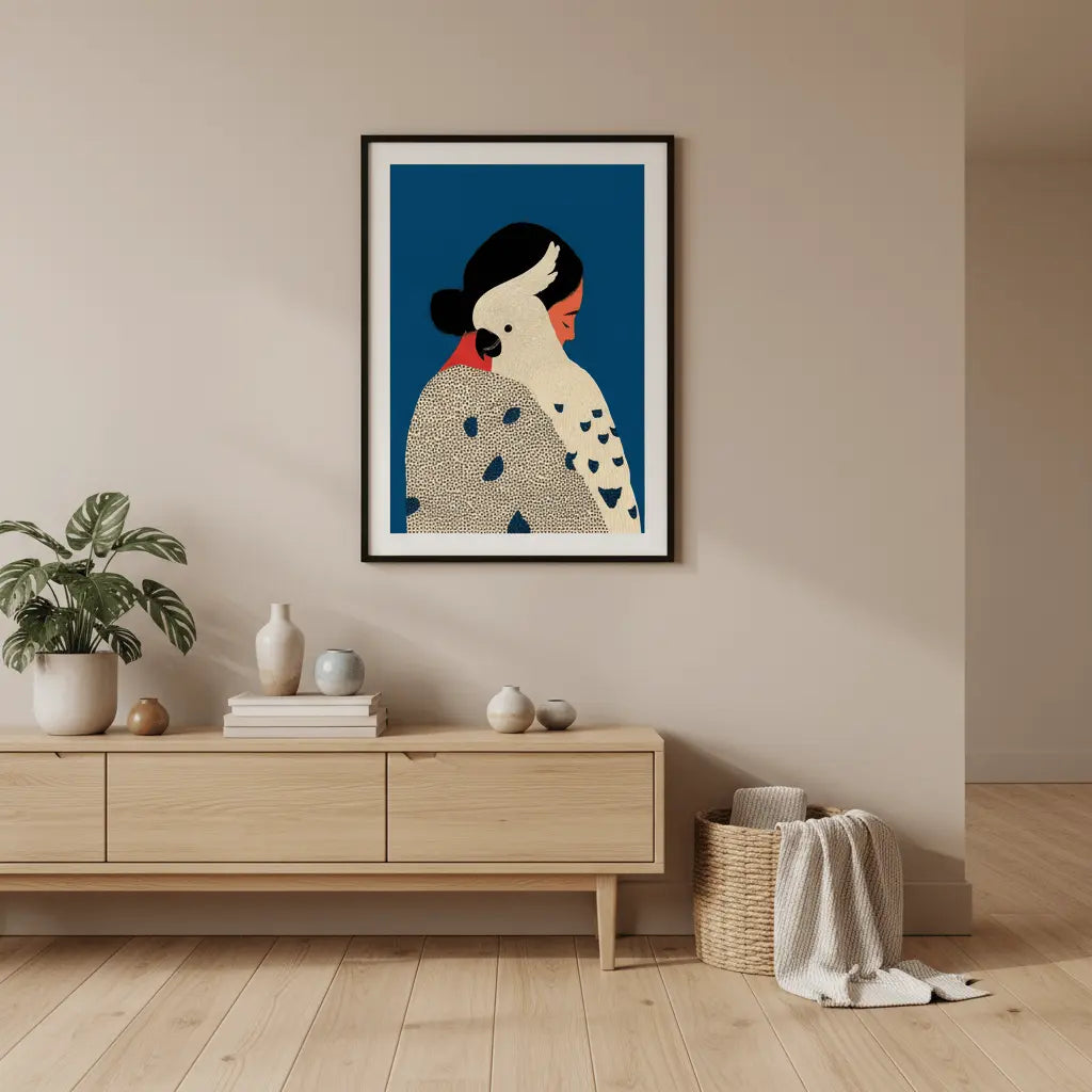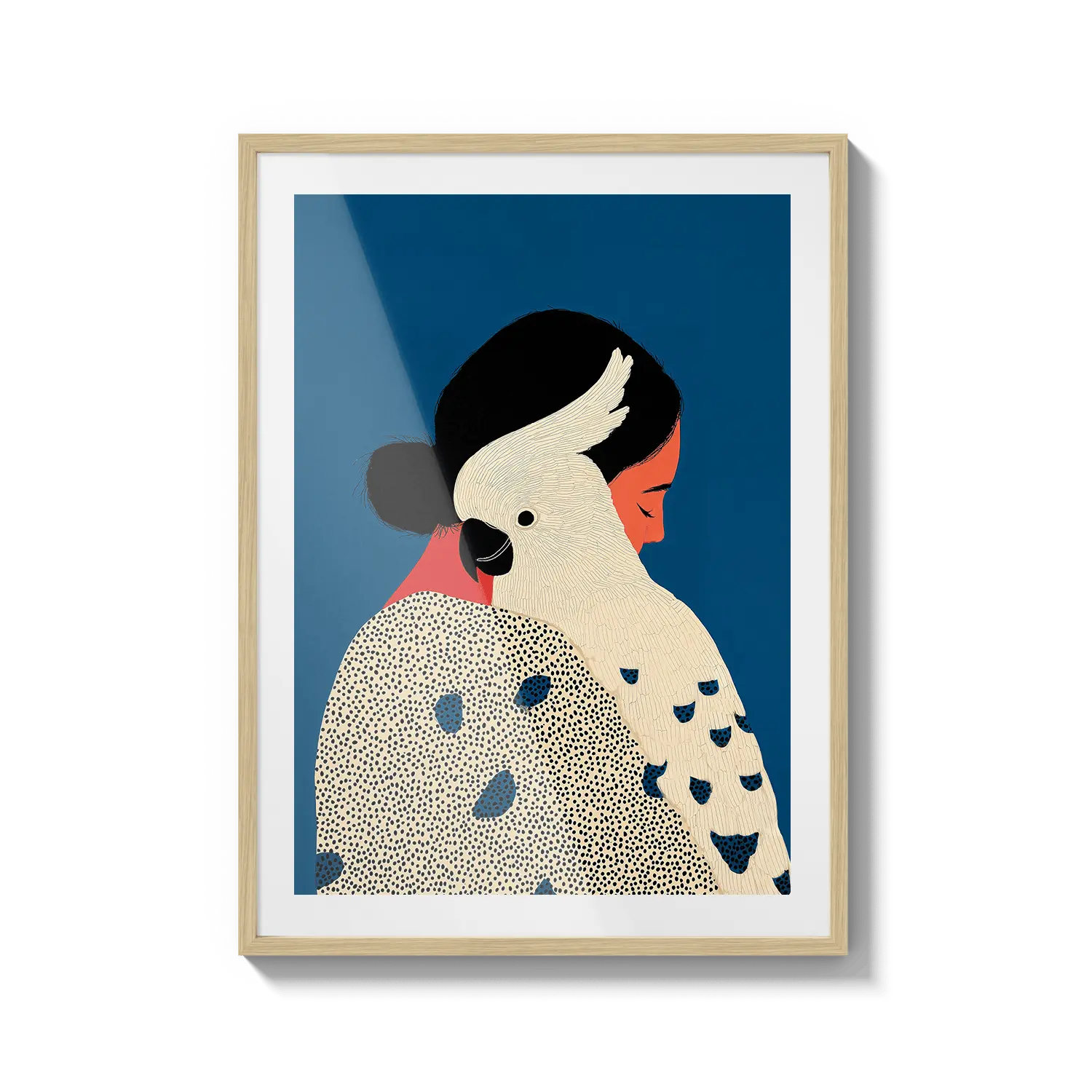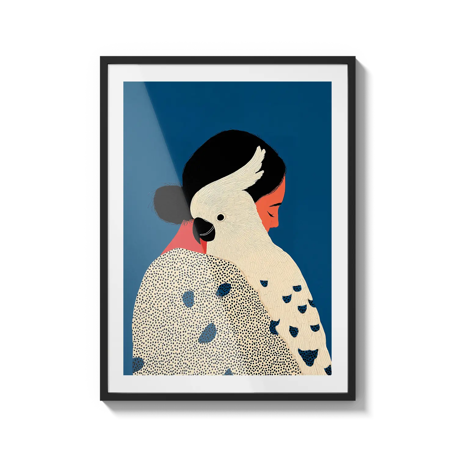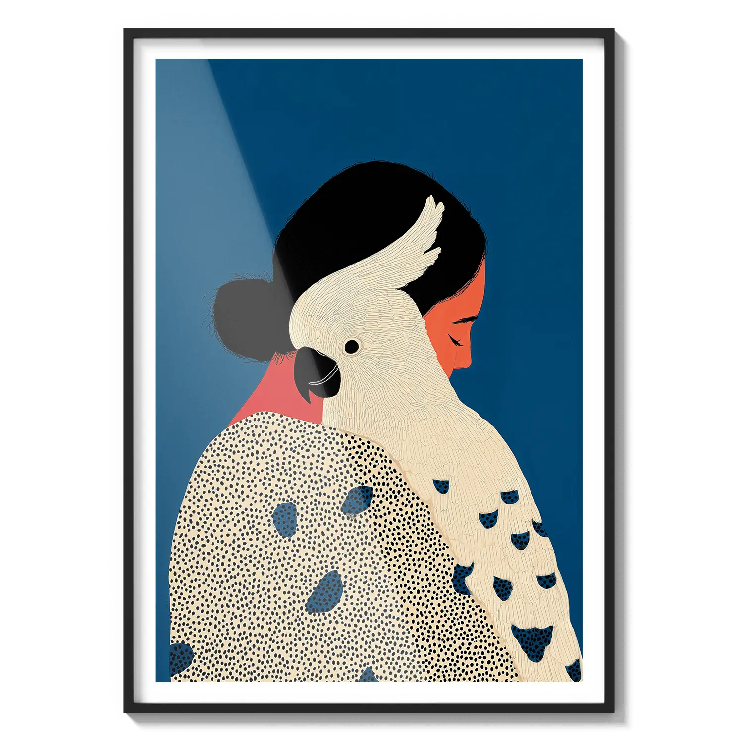 Мягкая иллюстрация белого какаду на фоне нежных голубых тонов, излучающая спокойное очарование. Прекрасный, нежный подарок.