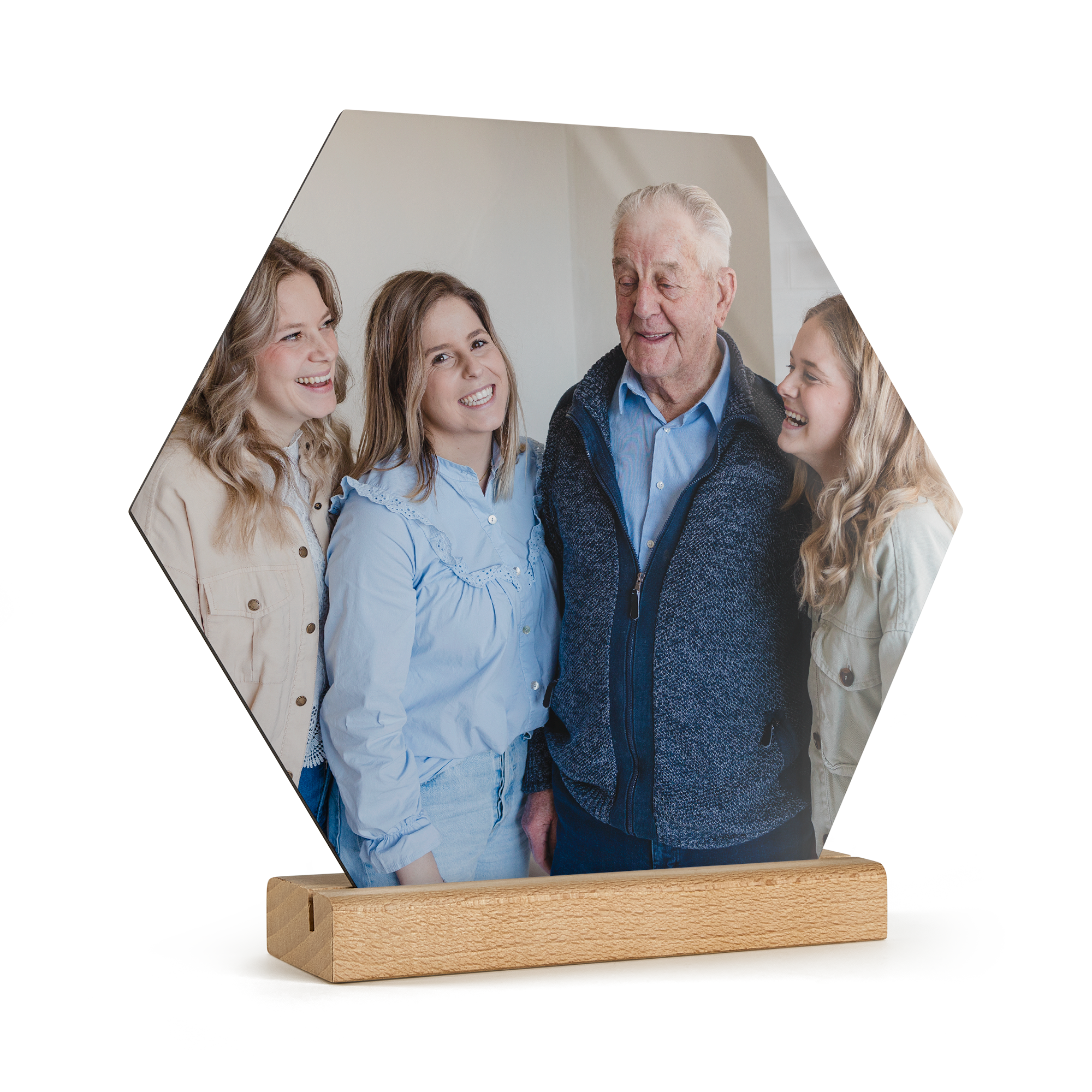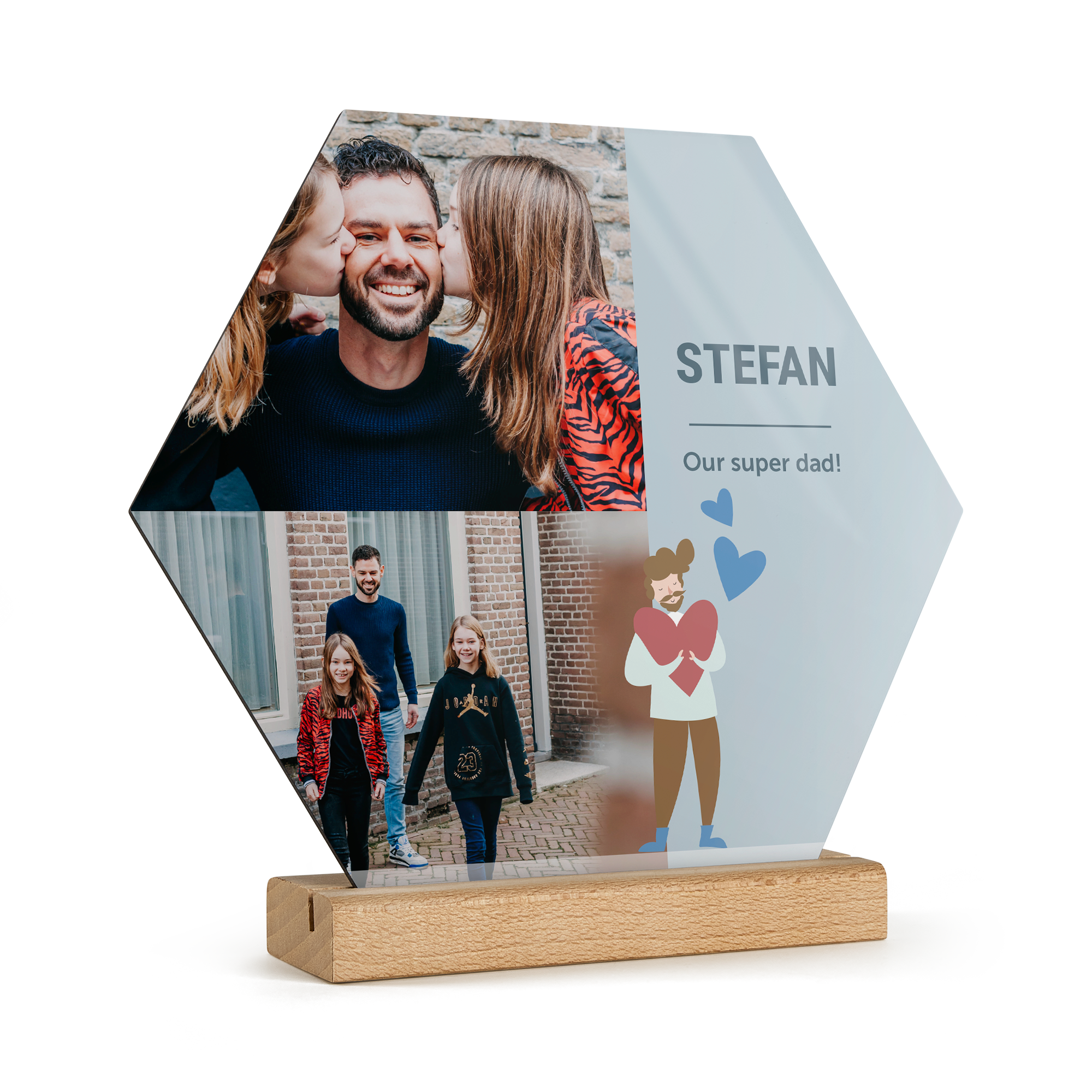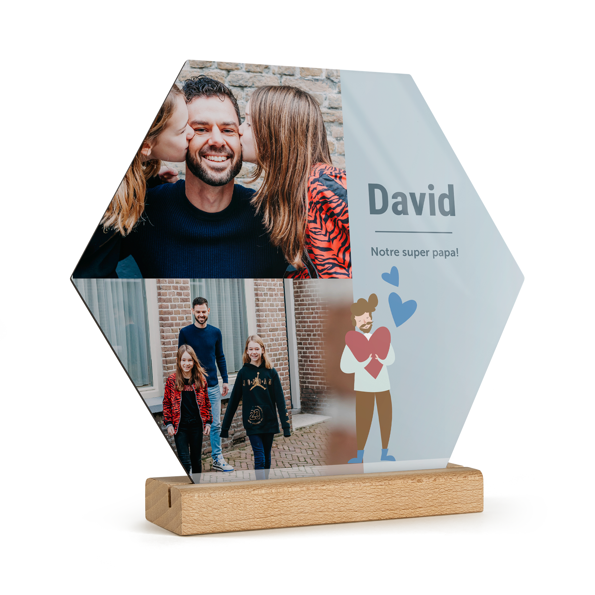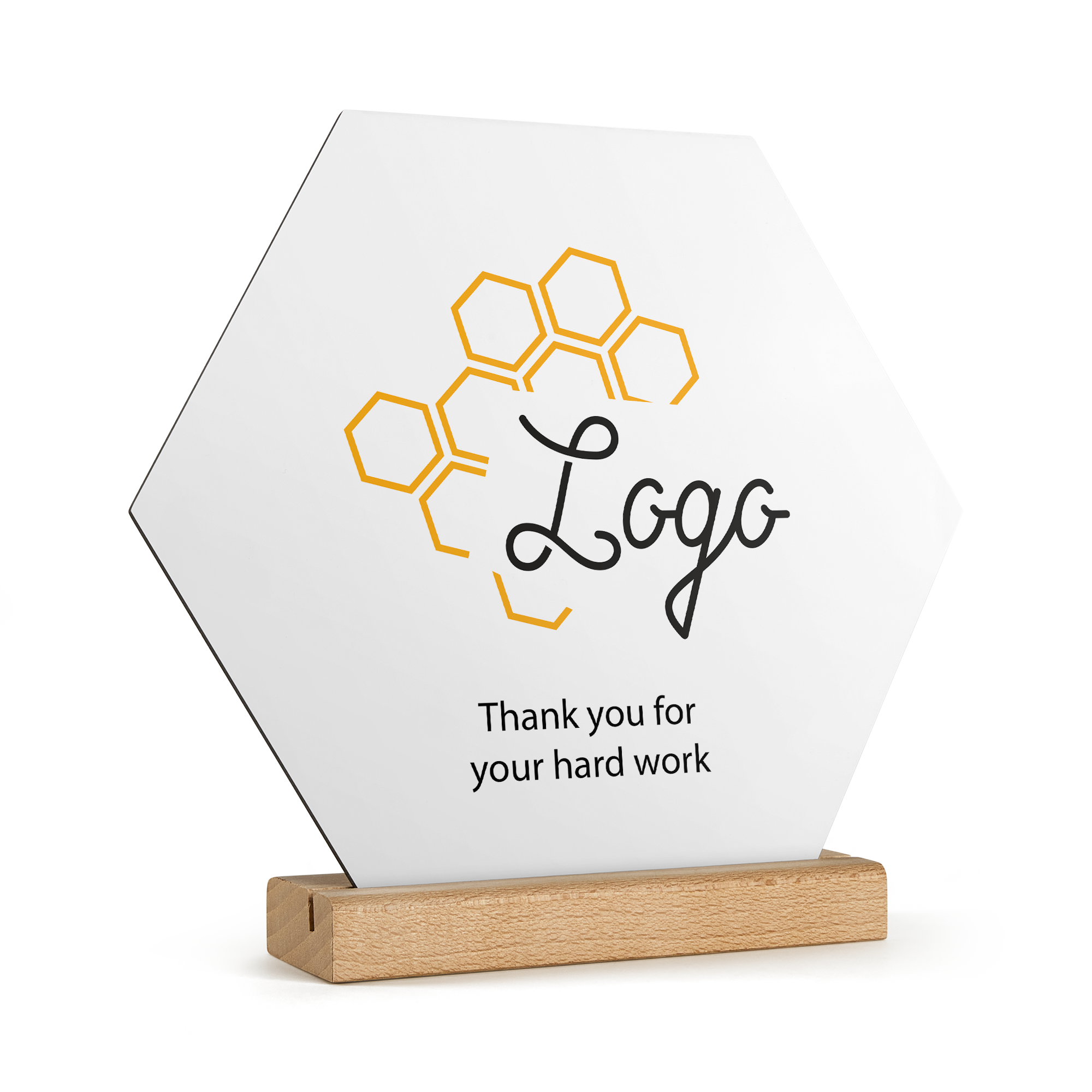 Подробнее о деревянной панели:Форма: шестиугольникМатериал: высококачественная фанераОтделка: глянцевое покрытиеРазмеры панели: 23 x 20 x 20 x 0,3 смРазмеры подставки: 15 x 5 x 2 x 2 смПерсонализация: с помощью фотографии, текста и/или логотипаПечать: четкими, яркими цветами
