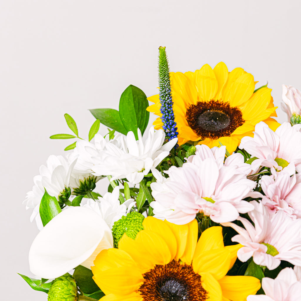 Sunny Lily (Солнечная лилия) - букет, в котором сочетаются теплота подсолнухов и чистота калл с красочными хризантемами и нежной белой вероникой. Удивите этой веселой композицией из свежих цветов.