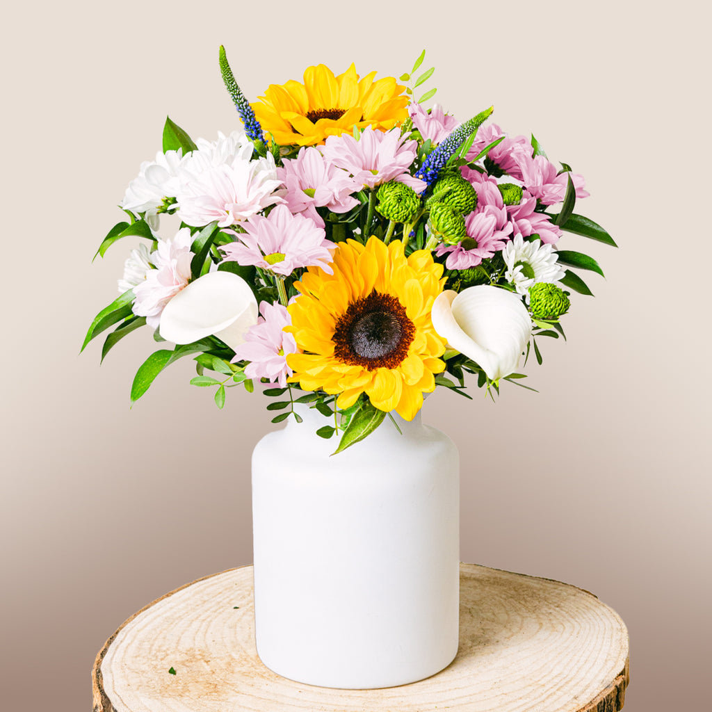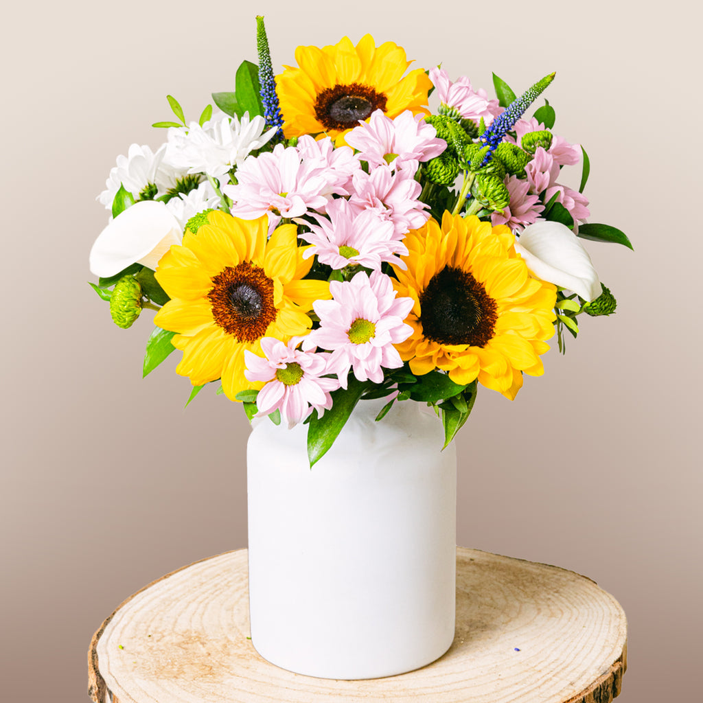 Яркие подсолнухи, элегантные лилии, красочные хризантемы и нежная вероника, создающие гармоничную композицию.