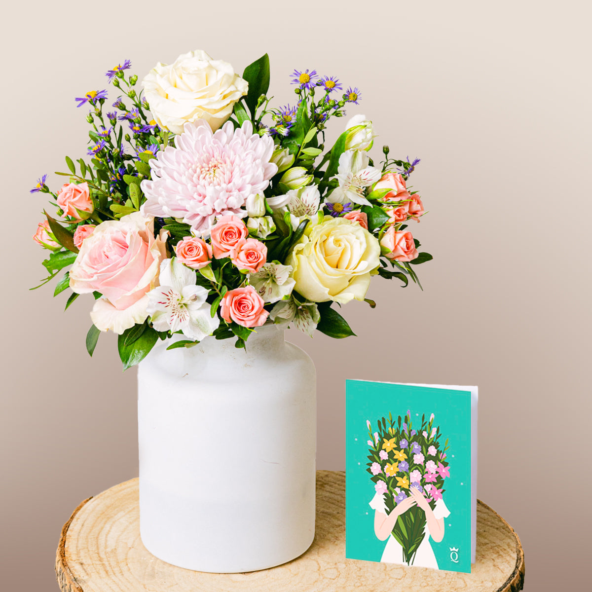 В течение ограниченного времени наш культовый букет "Бесконечная сила" выпускается в специальном издании, включающем вазу и карточку для вашего личного сообщения. Этот прекрасный букет, сочетающий в себе розовые анастасии, сиреневые астры и белые розы, идеально подходит для того, чтобы выразить свои чувства уникальным способом. воспользуйтесь этим эксклюзивным предложением и удивите своих любимых незабываемым подарком!