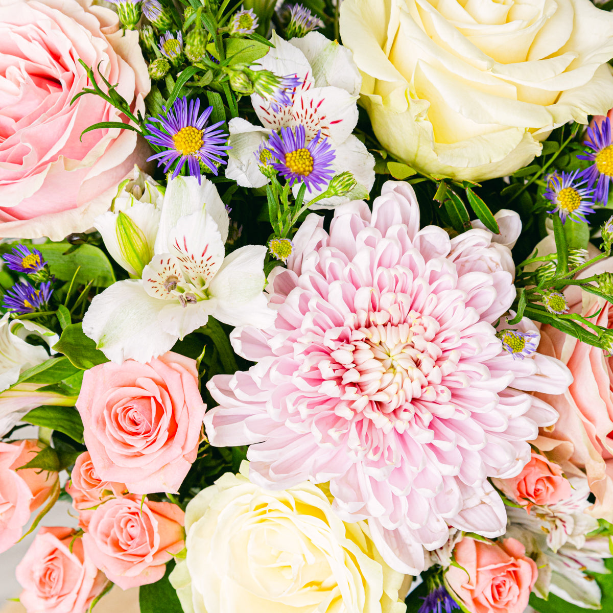 Этот букет идеально подходит для выражения ваших чувств. Сочетание розовых анастасий, сиреневых астр и белых роз делают его уникальным и запоминающимся подарком.
