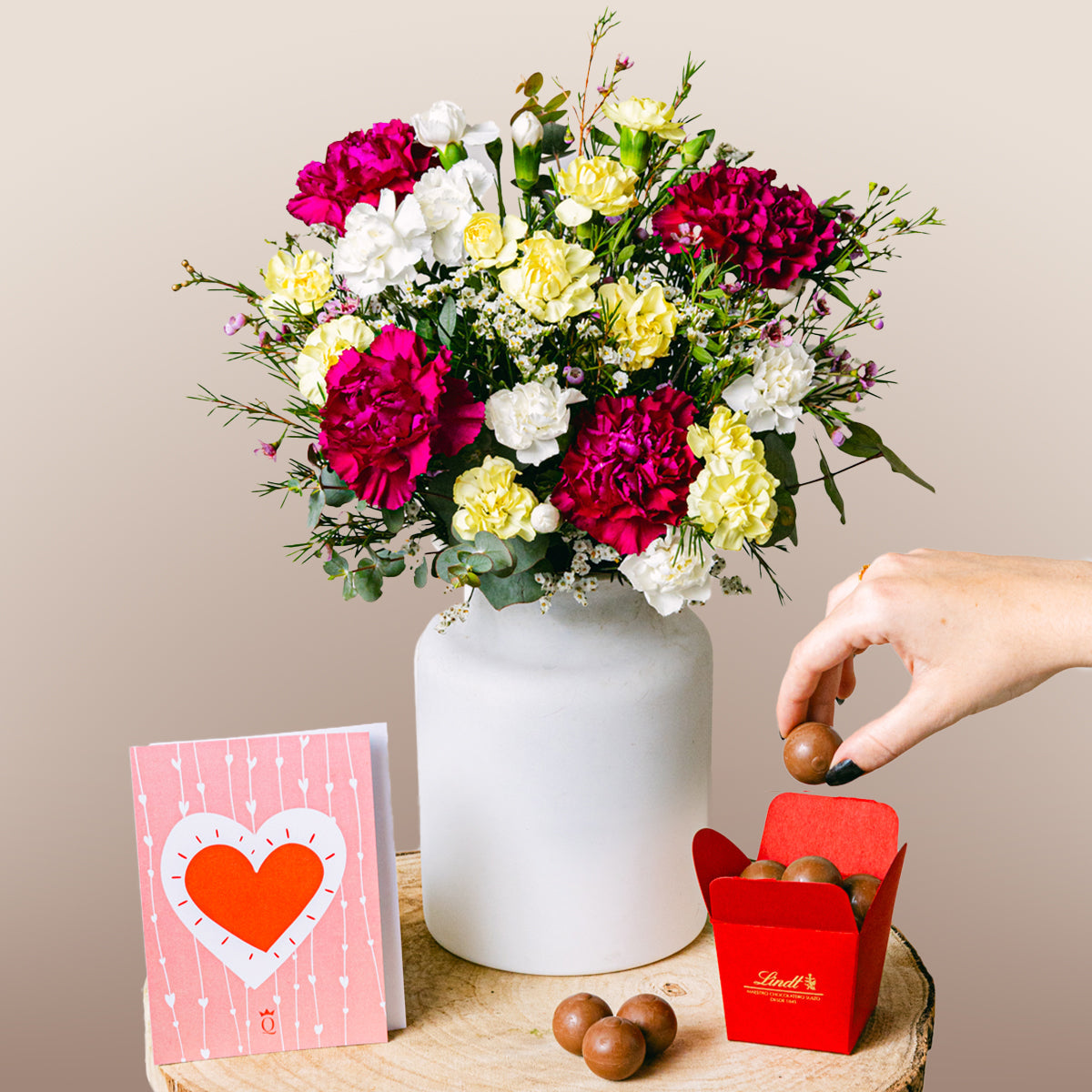 Ощутите теплоту нежности с нашим букетом «Гармония души» – потрясающим сочетанием ярких гвоздик и нежных лизиантусов. Эта тщательно продуманная композиция говорит на языке любви и восхищения, что делает её идеальным подарком для воссоединения сердец на расстоянии. Насыщенные, глубокие оттенки красных и розовых гвоздик символизируют глубокую любовь и привязанность, а белый лизиантус олицетворяет чистоту и невинность, передавая послание столь же нежное, как и шоколад, который к нему прилагается.