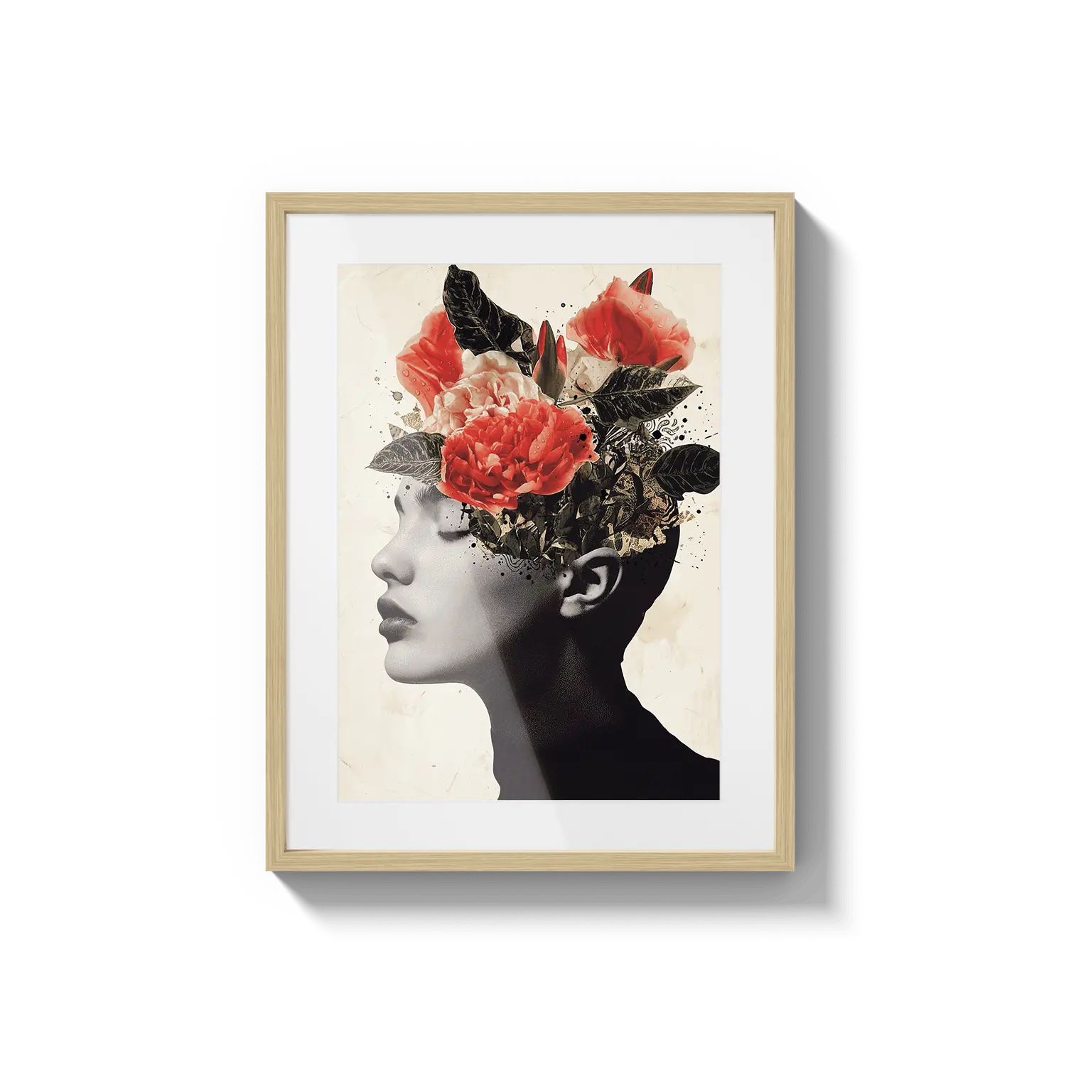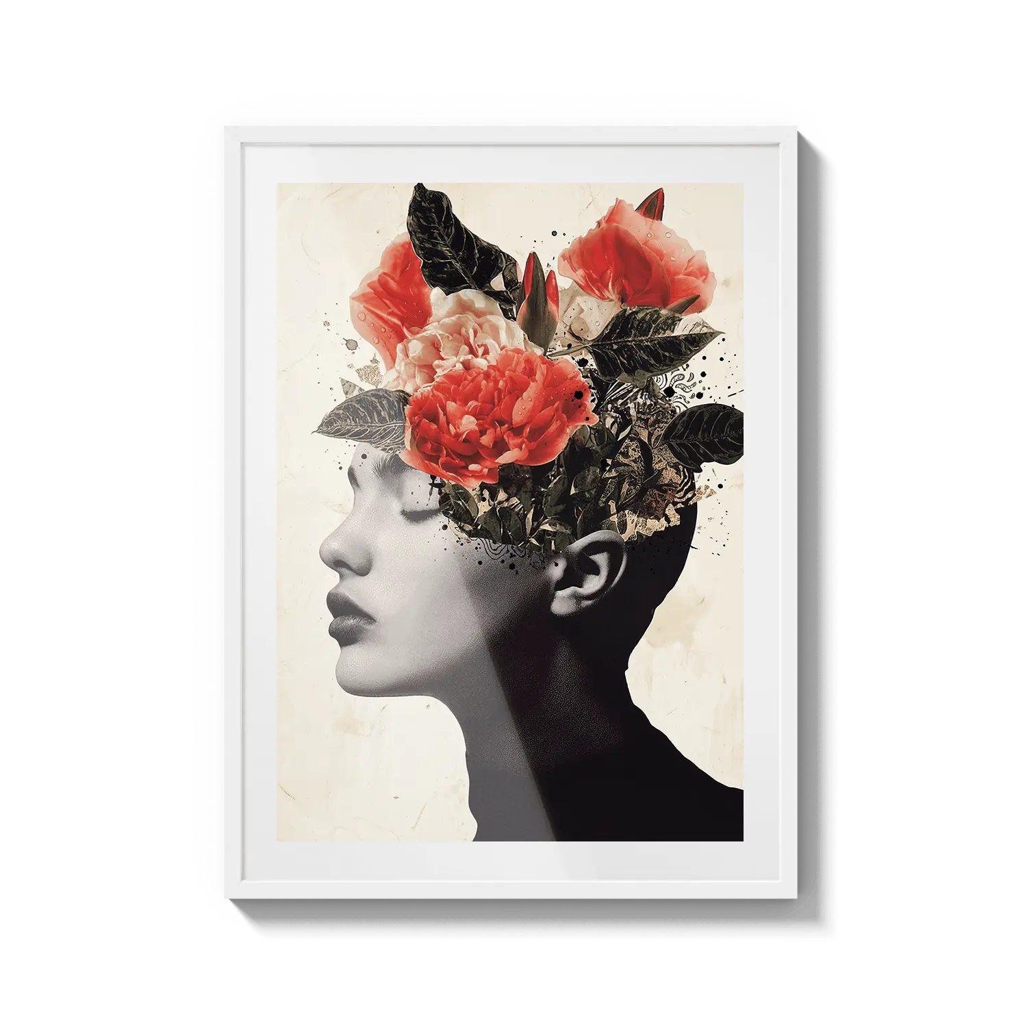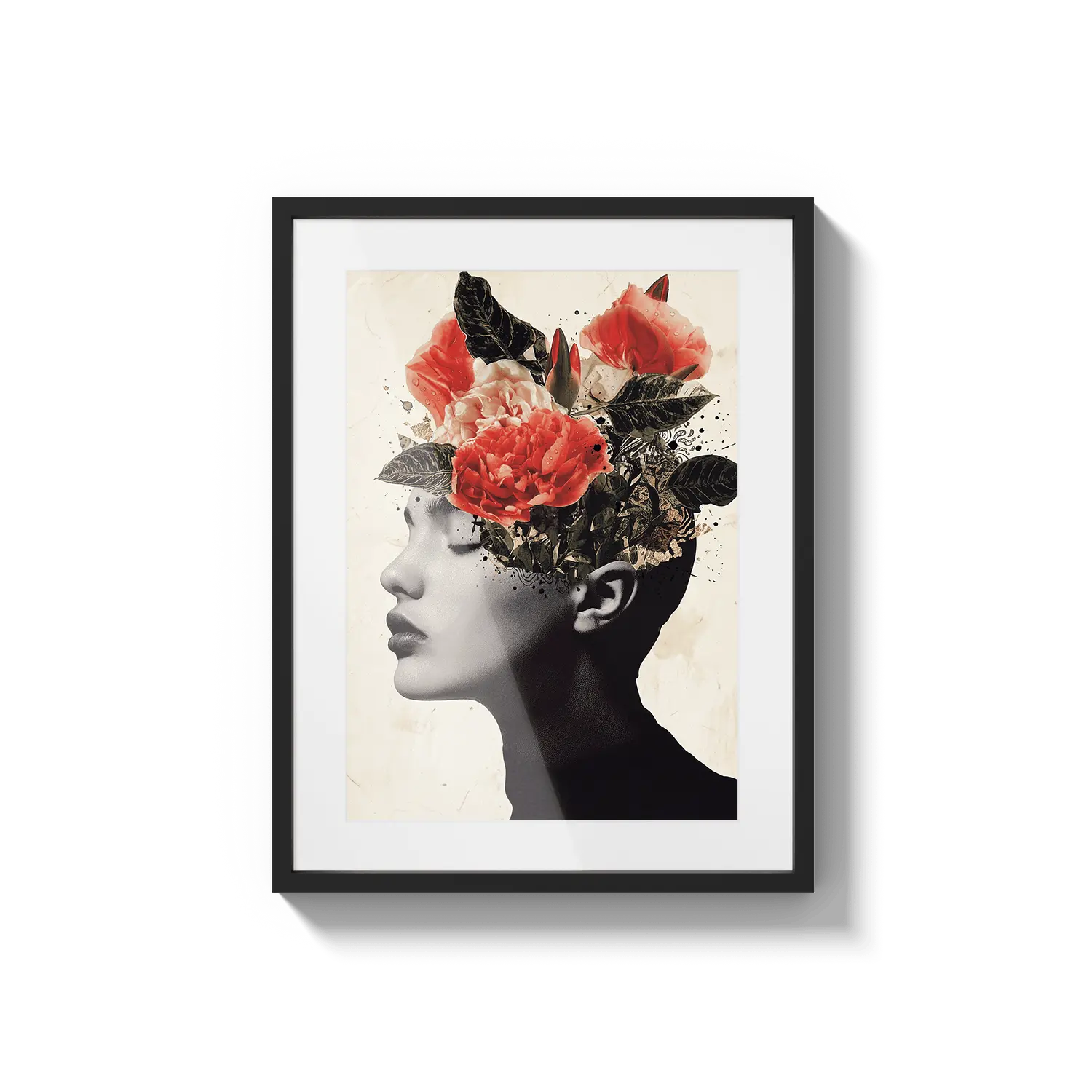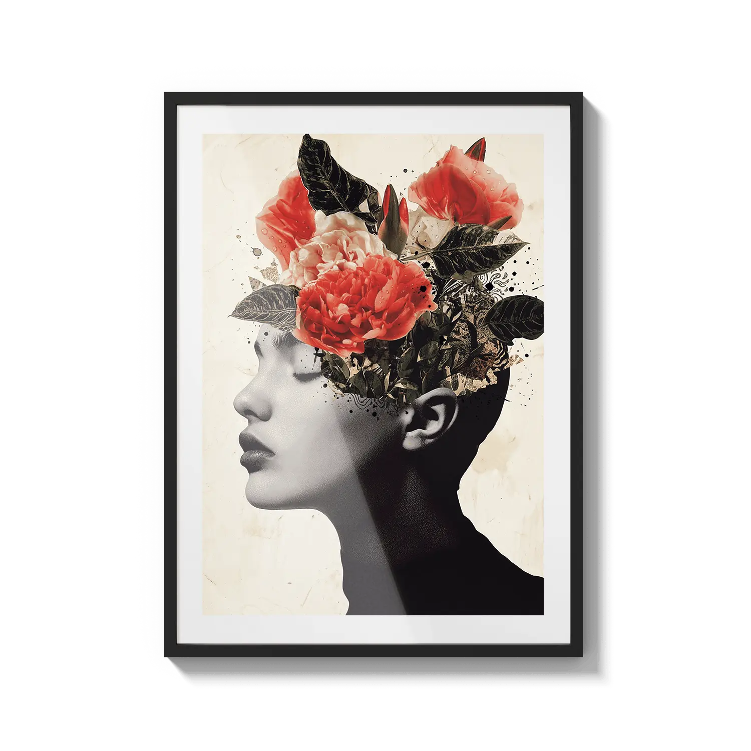 Поэтический чёрно-белый портрет с яркими цветами, объединяющий эмоции и артистизм. Изысканный подарок со спокойной силой.