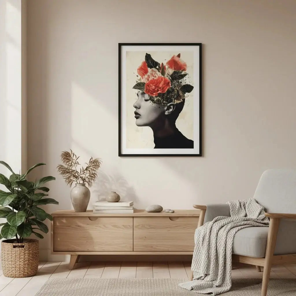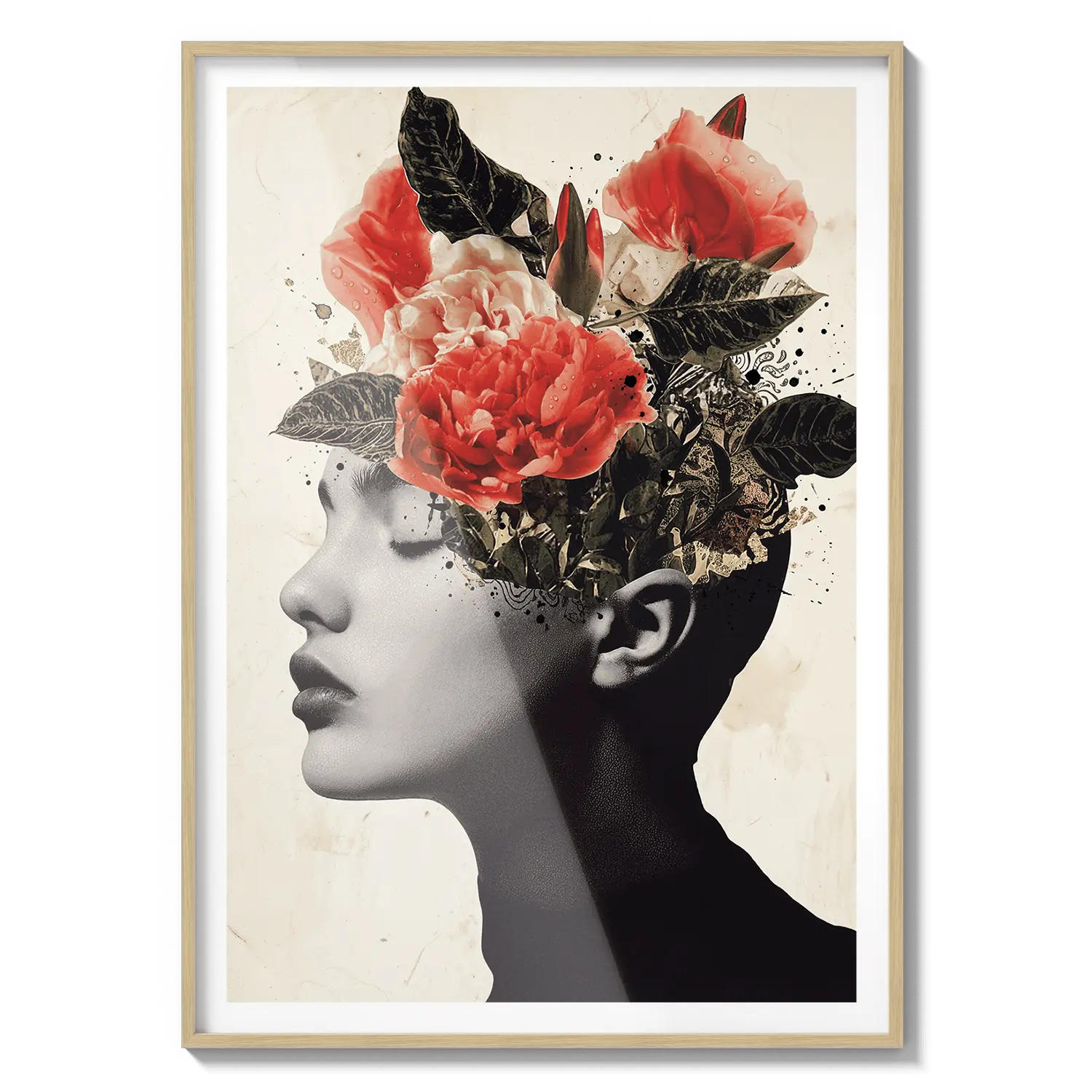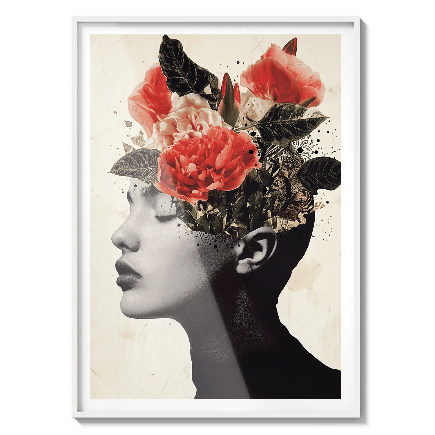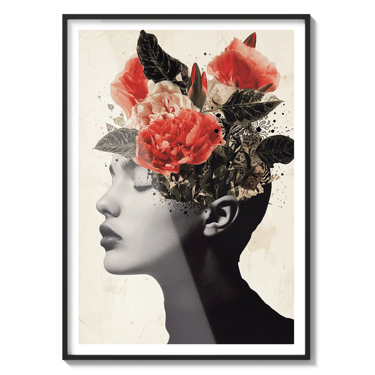 Поэтический чёрно-белый портрет с яркими цветами, объединяющий эмоции и артистизм. Изысканный подарок со спокойной силой.