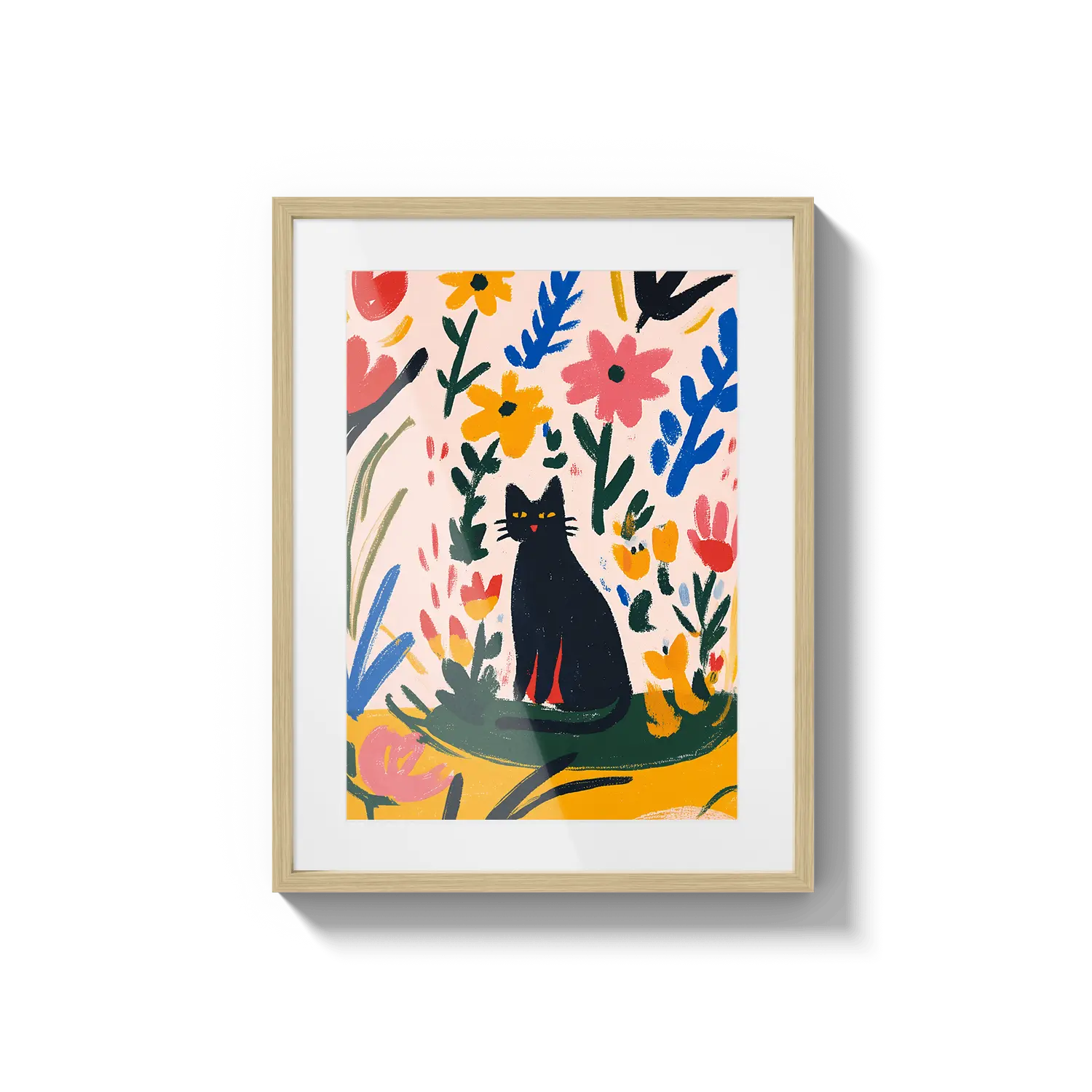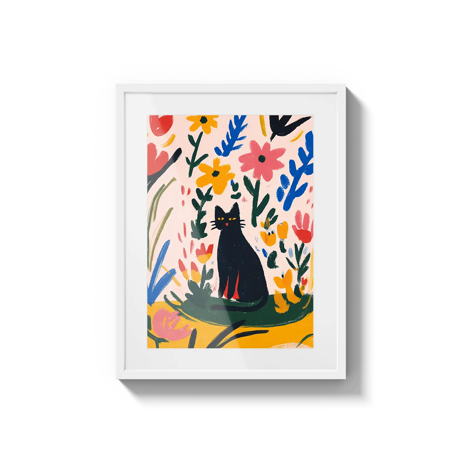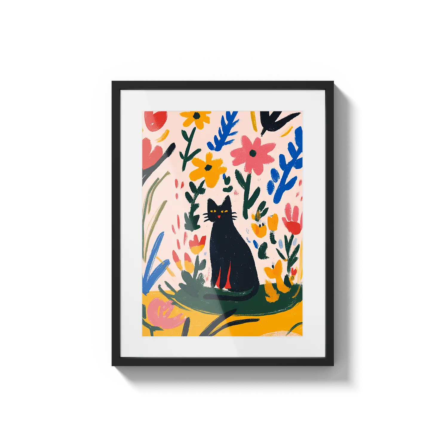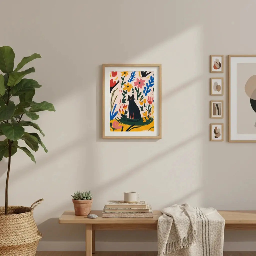 Очаровательная графическая сцена с кошкой, отдыхающей среди красочных листьев, излучающая игривое тепло. Прекрасный подарок, чтобы скрасить чей-то день.