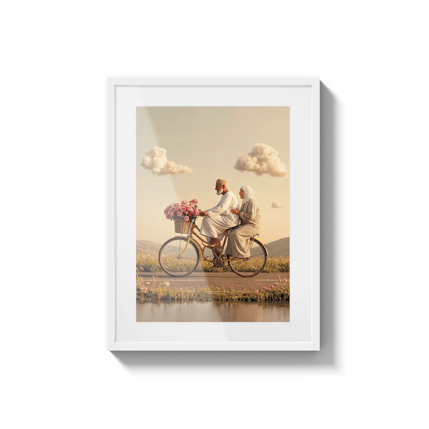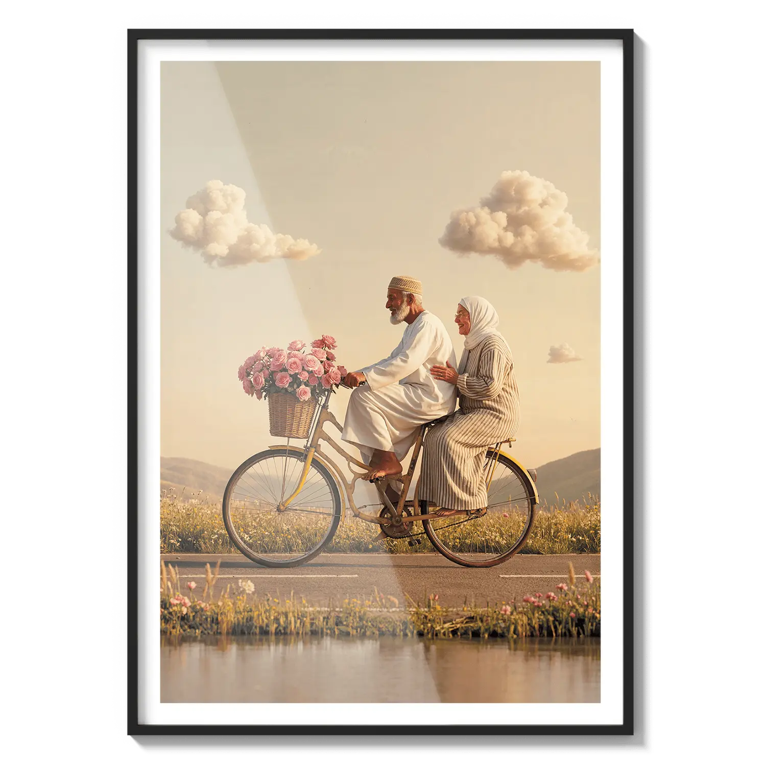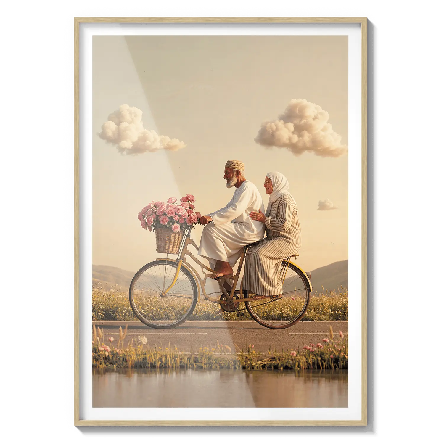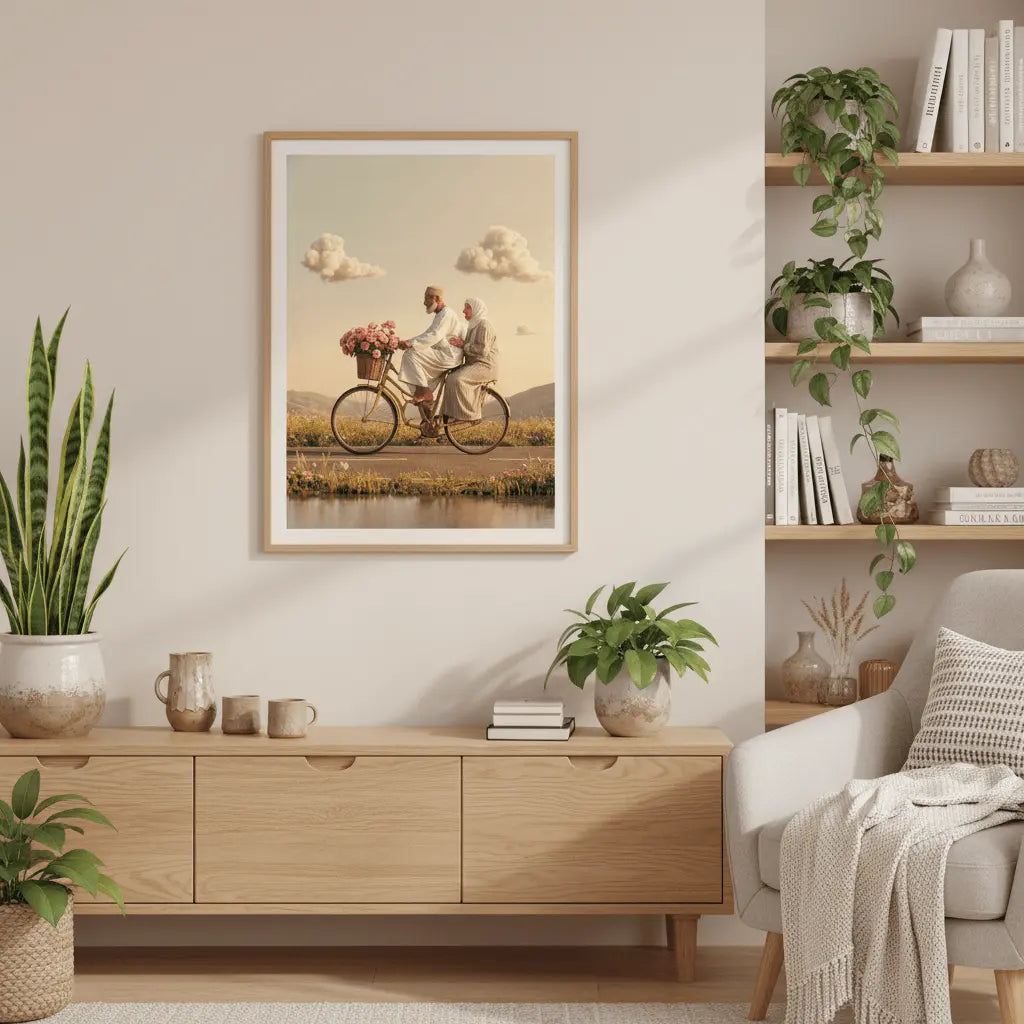 Пара едет на велосипеде сквозь золотой свет, вызывая чувство товарищества и радости. Милое произведение искусства, чтобы отпраздновать общие моменты.