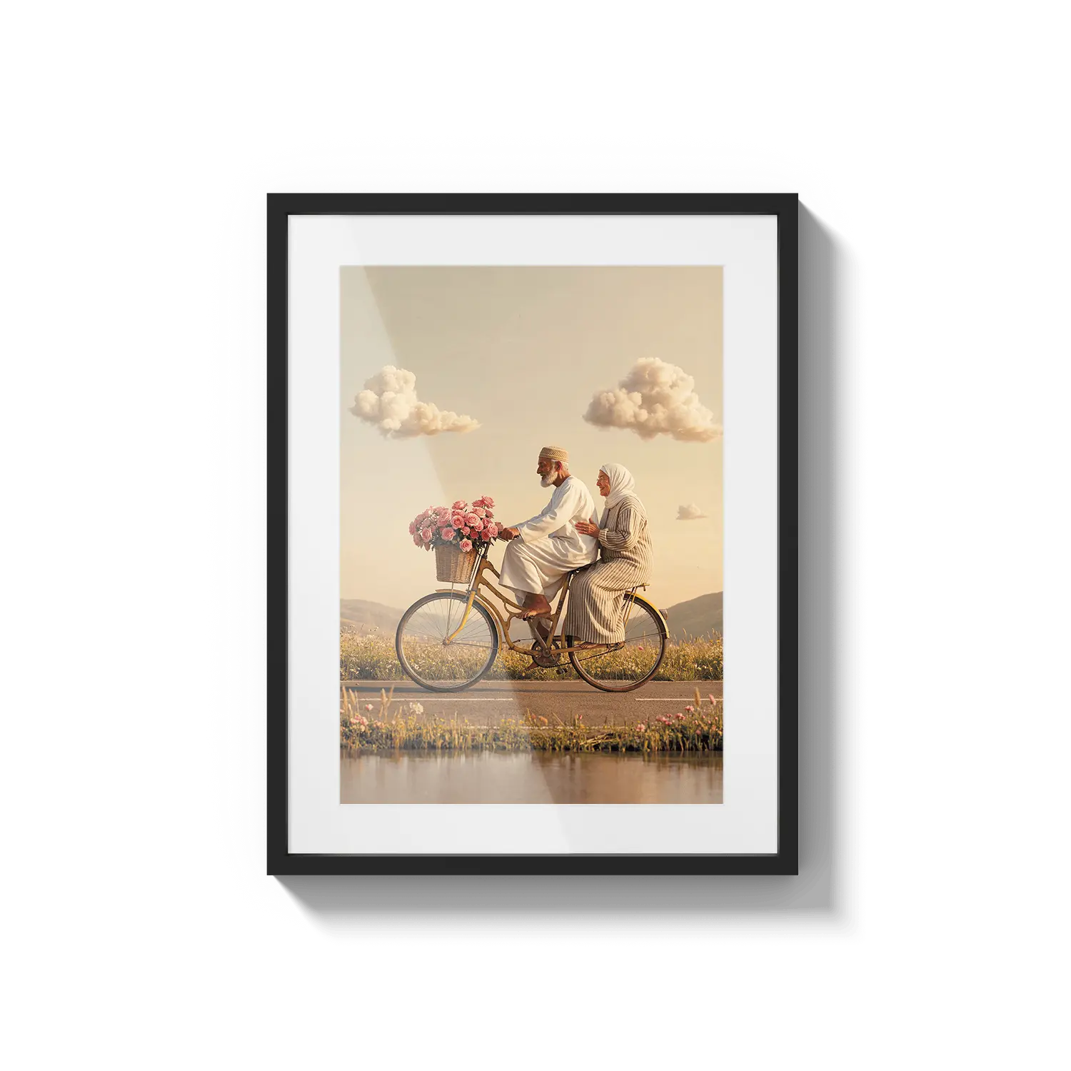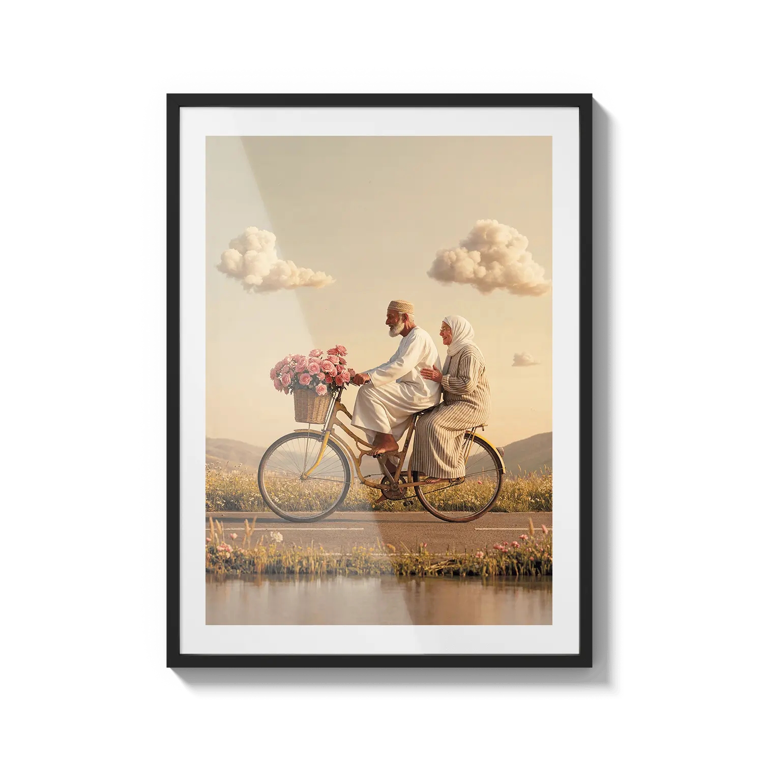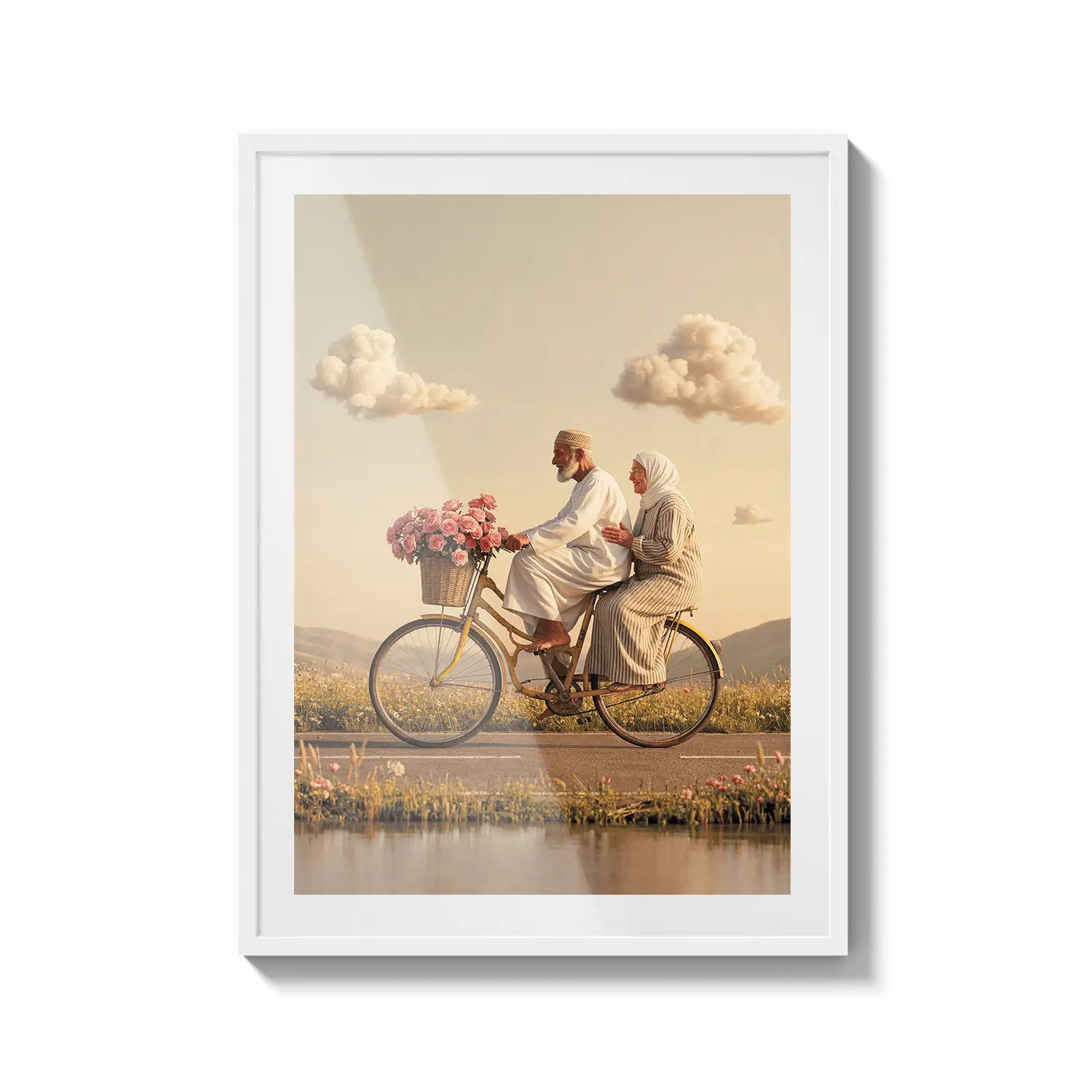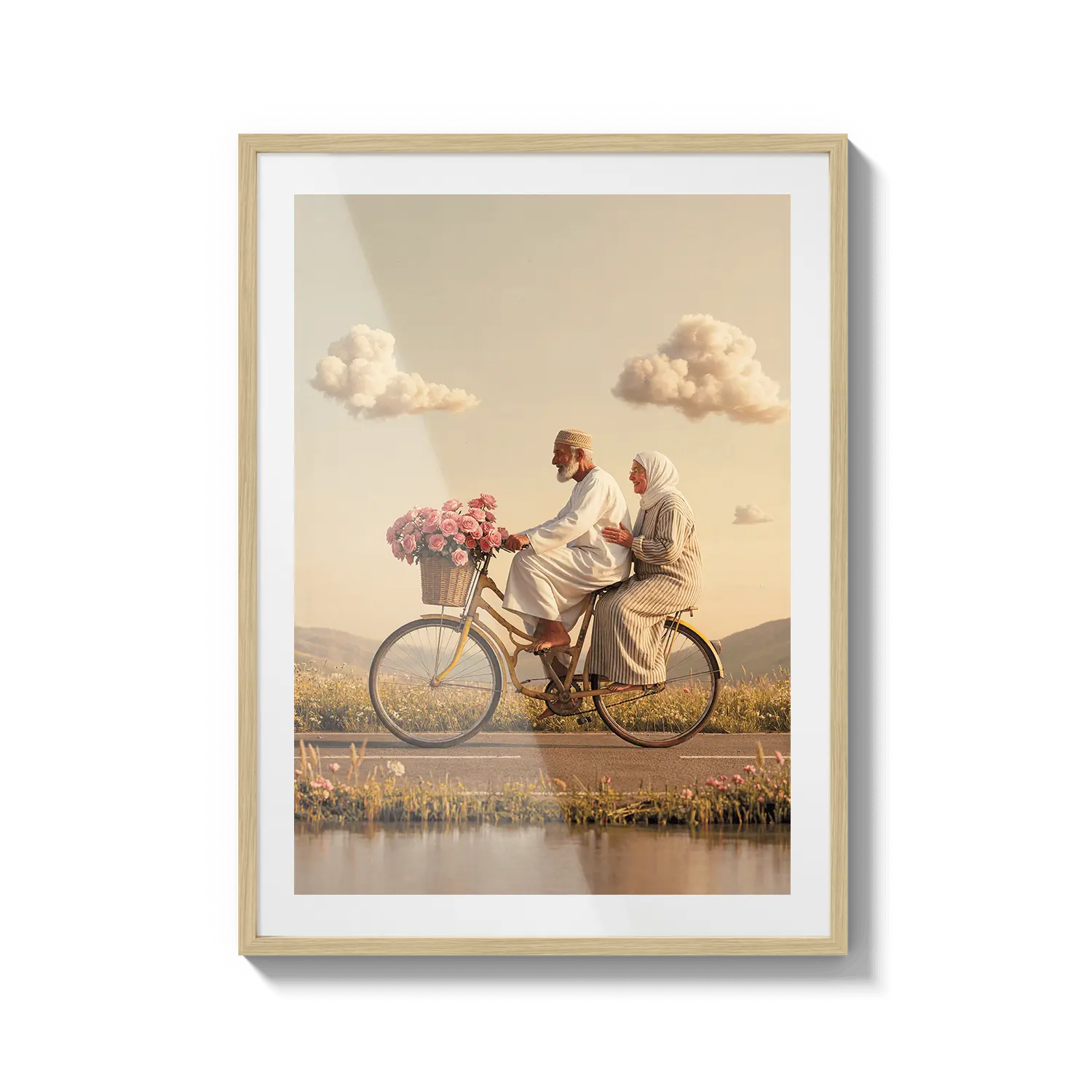 Пара едет на велосипеде сквозь золотой свет, вызывая чувство товарищества и радости. Милое произведение искусства, чтобы отпраздновать общие моменты.