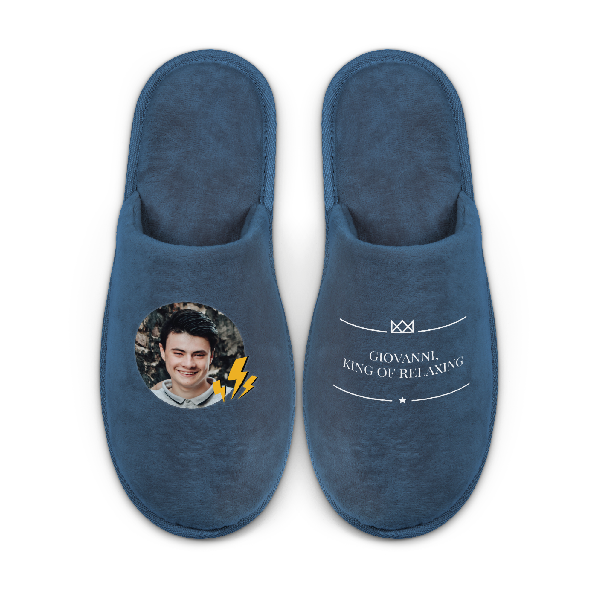 Подробнее о персонализированных тапочках:Материал: 100% полиэстерРазмер: EU 39-42Цвет: синийТолщина: 25 ммДлина: 27,2 смПерсонализация: с фотографией, именем, текстом и/или логотипомПечать: безупречная и полноцветнаяДополнительная информация: каждый тапочек можно персонализировать.Чистка: удалять пятна влажной тканью