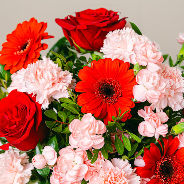 Удивите кого-то особенного этим красивым букетом красных роз и мини-красных гербер! Эта невероятная комбинация цветов очарует получателя. Добавьте ярких красок в особенный день!