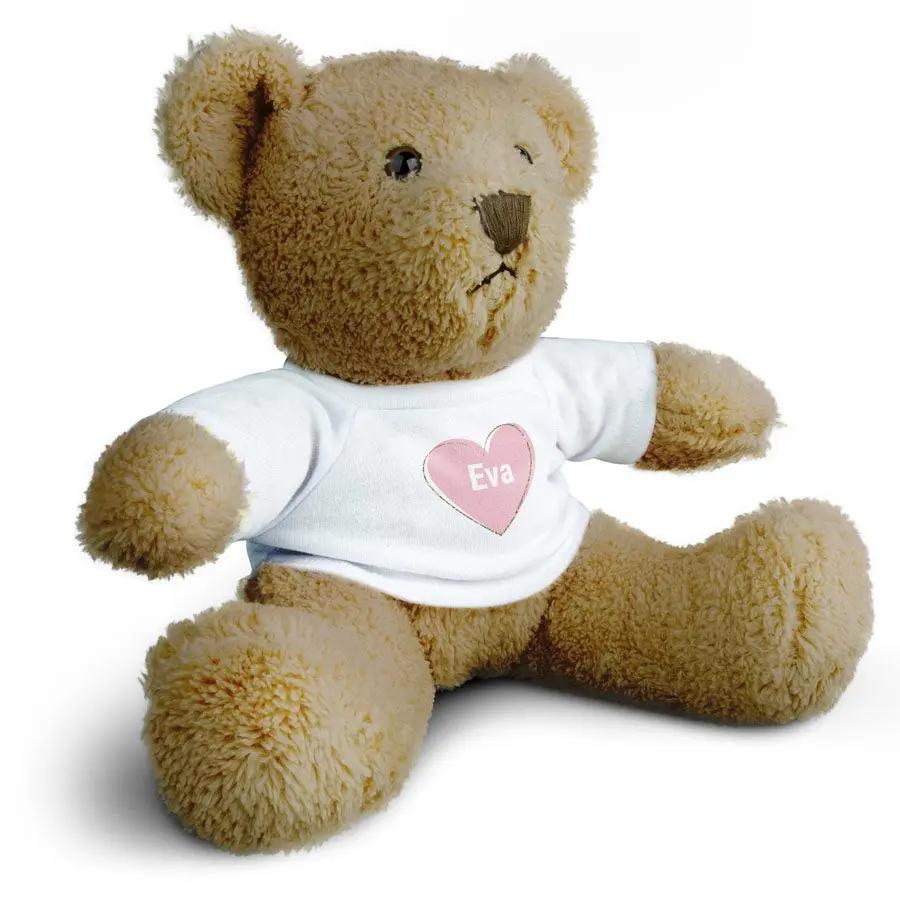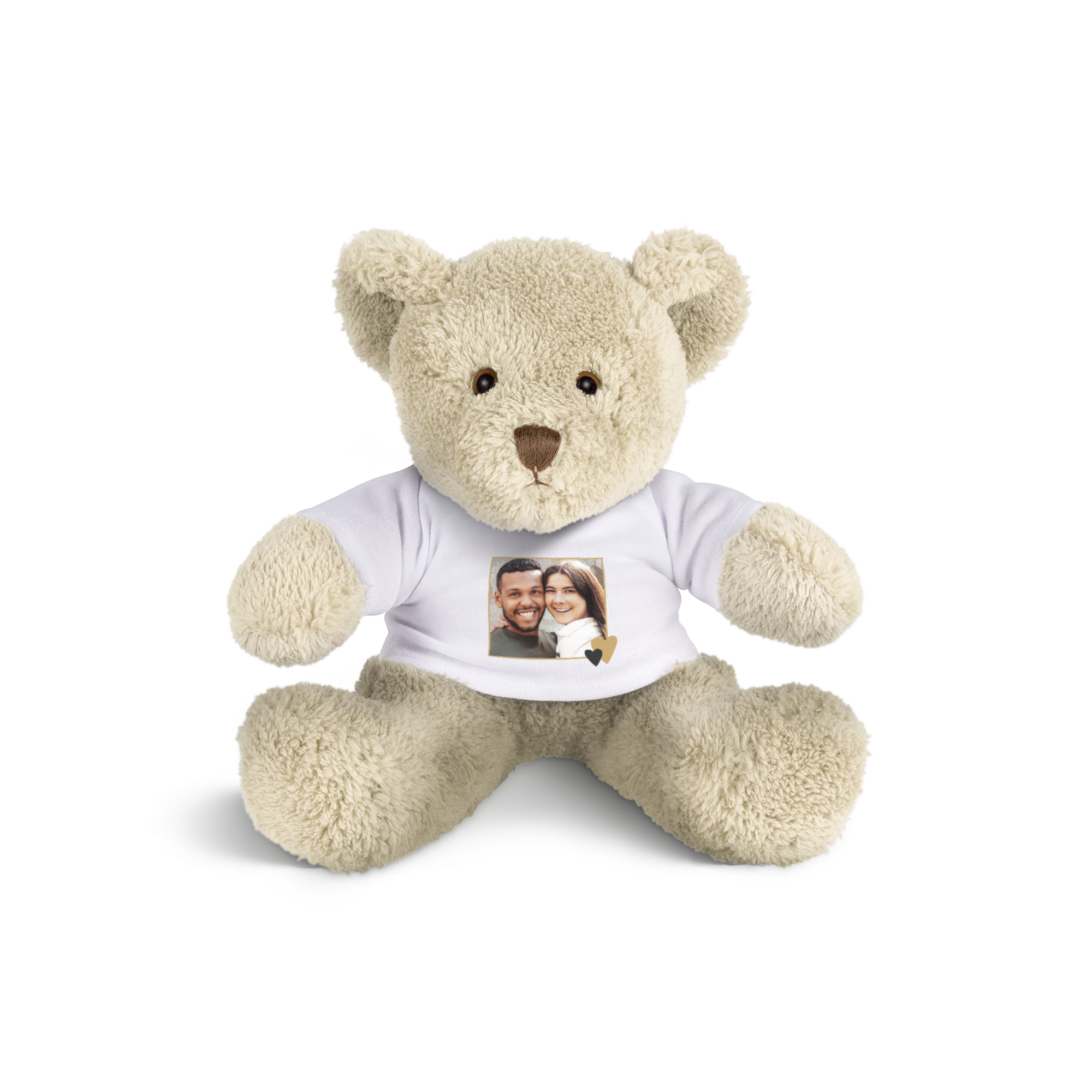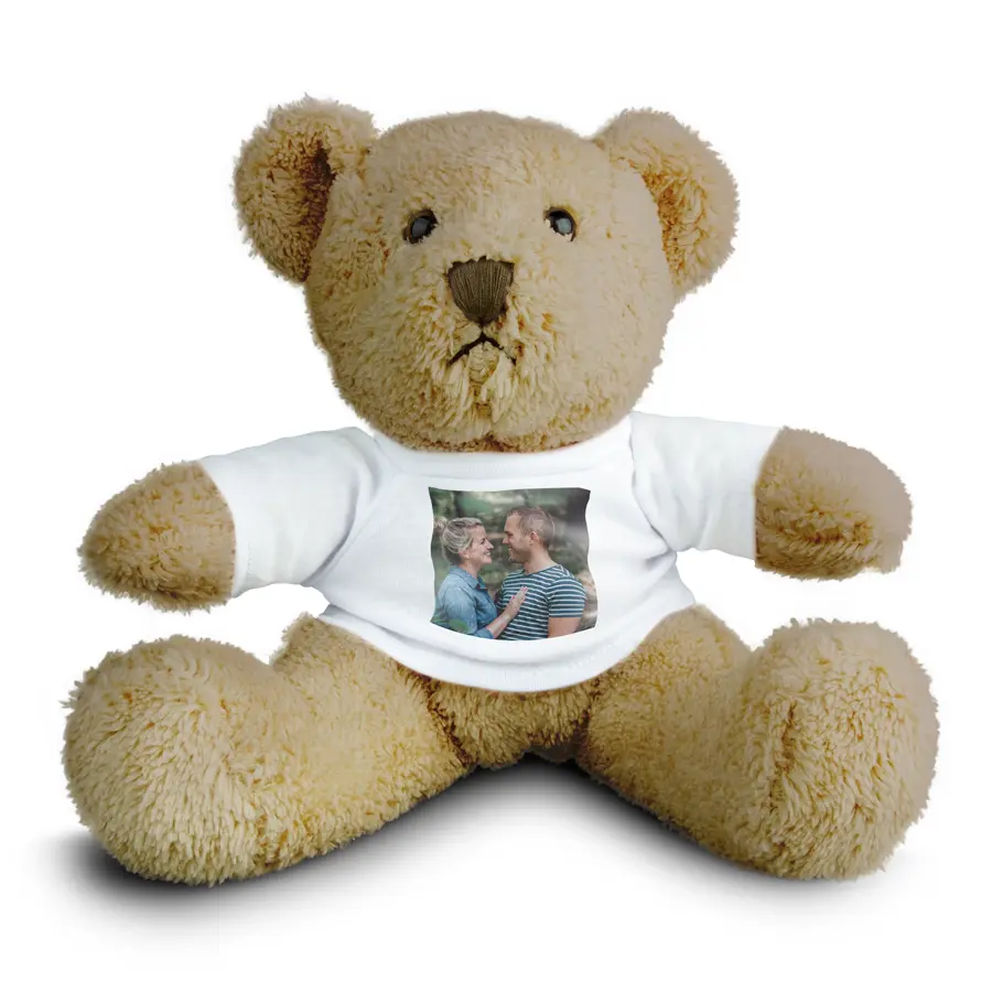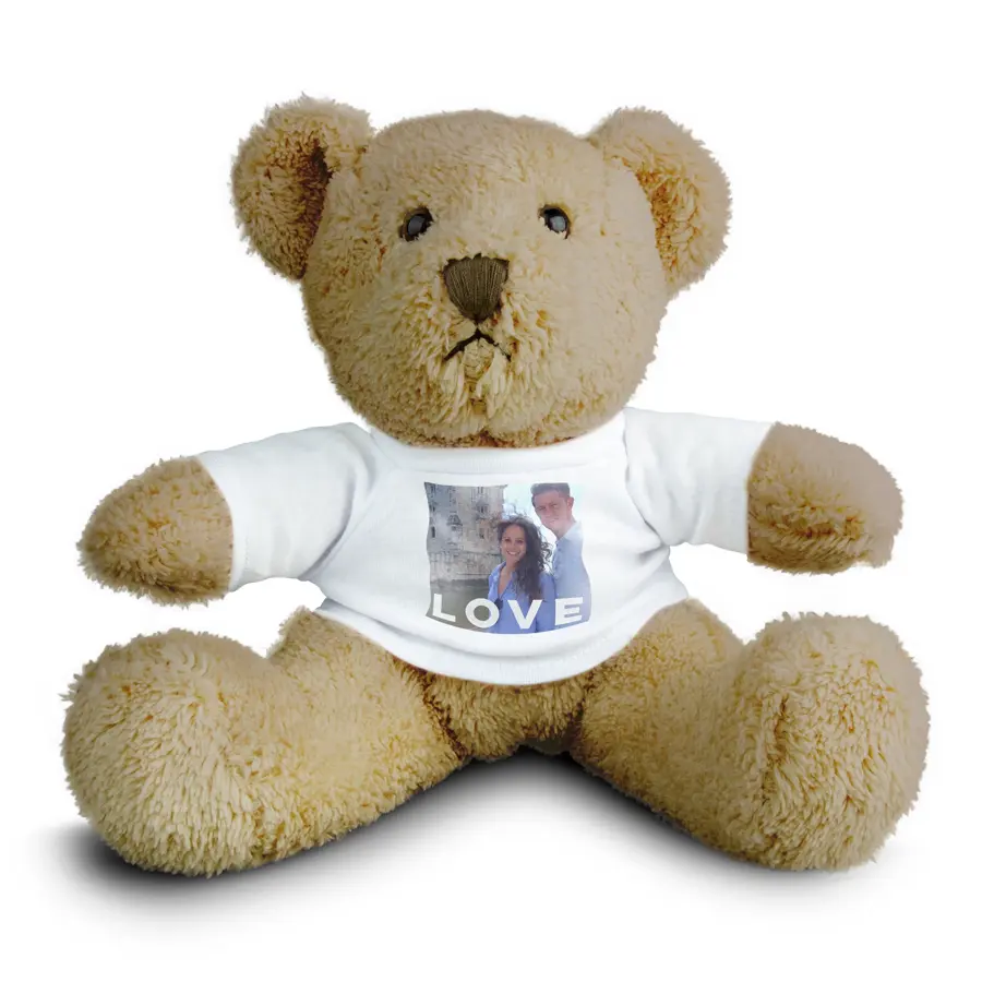 Персонализированная футболка с вашим фото и текстом делает этого мишку уникальным и незабываемым подарком.