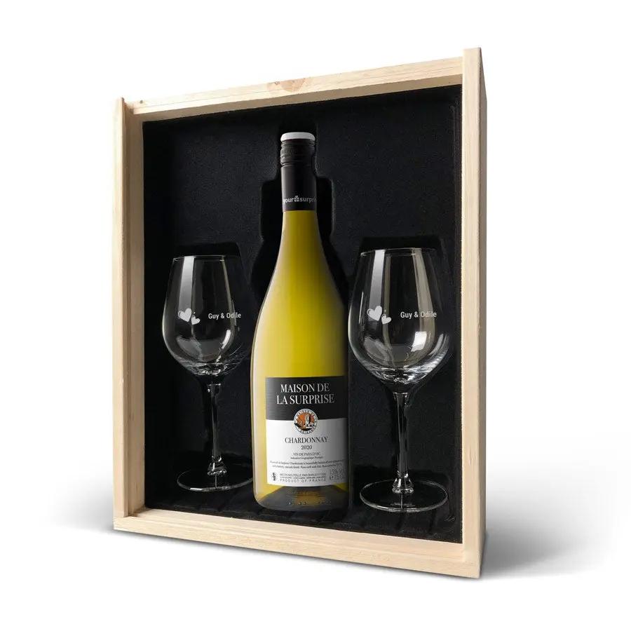 Набор для подарка с вином и бокалами - Maison de la Surprise Chardonnay - Бокалы с гравировкой