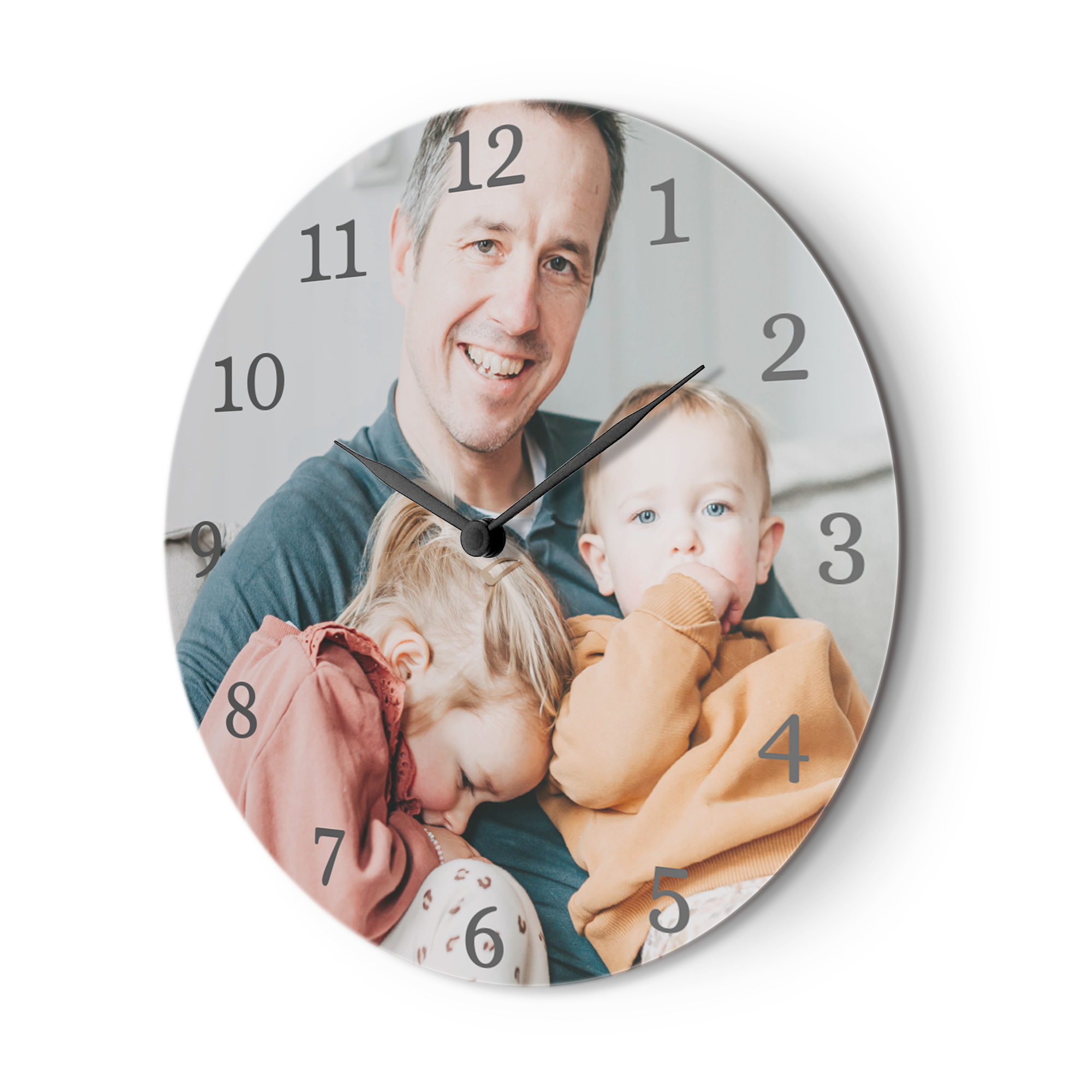 Подробнее о персонализированных часах из ДВП:Форма: круглая. Диаметр: 29 см / 11,4 дюйма. Материал: ДВП с упрочнённым покрытием. Персонализация: фотографией и/или текстом. Печать: полноцветная в HD-качестве. Дополнительно: батарейки в комплекте.