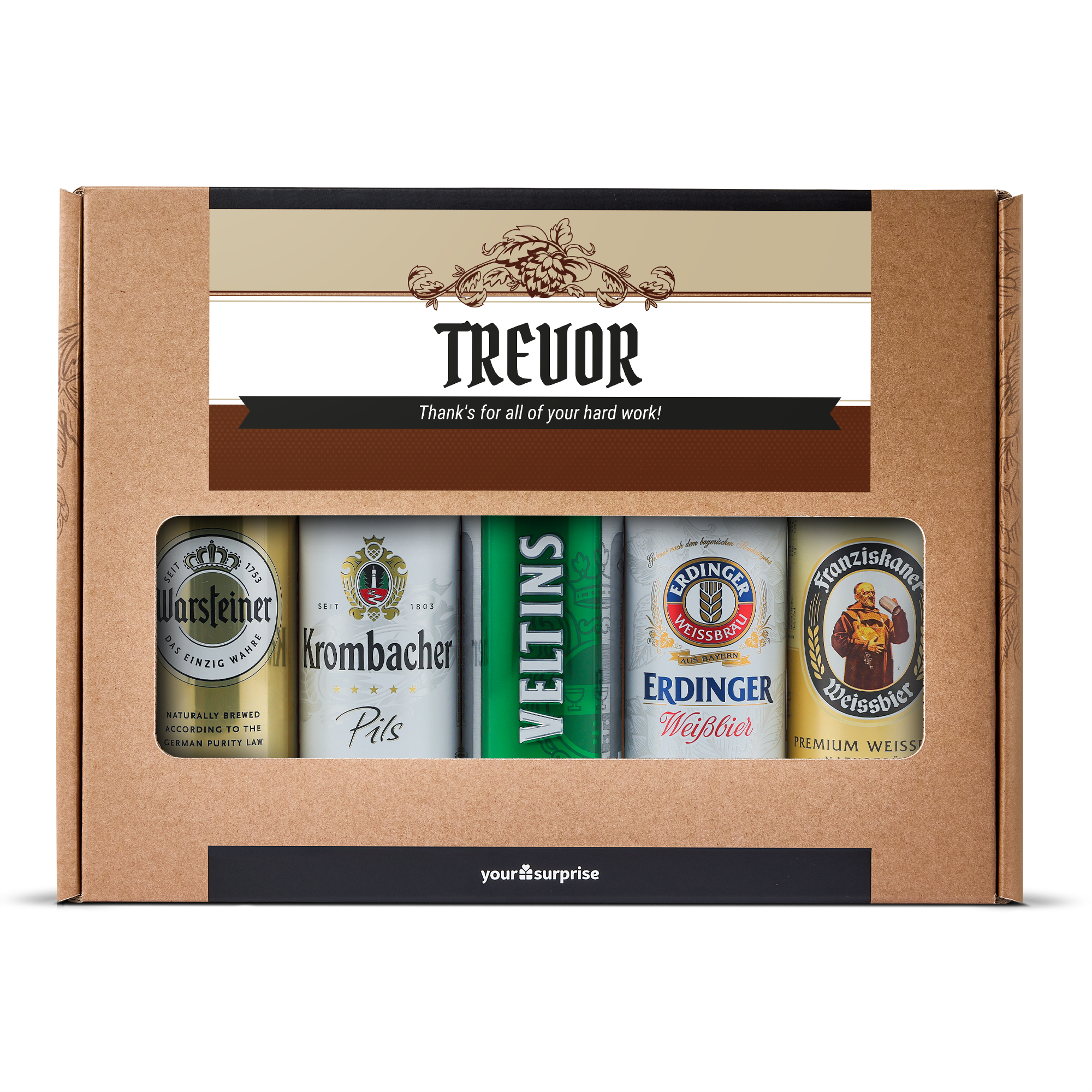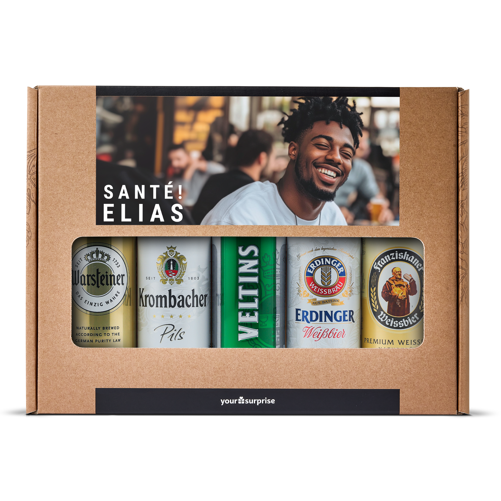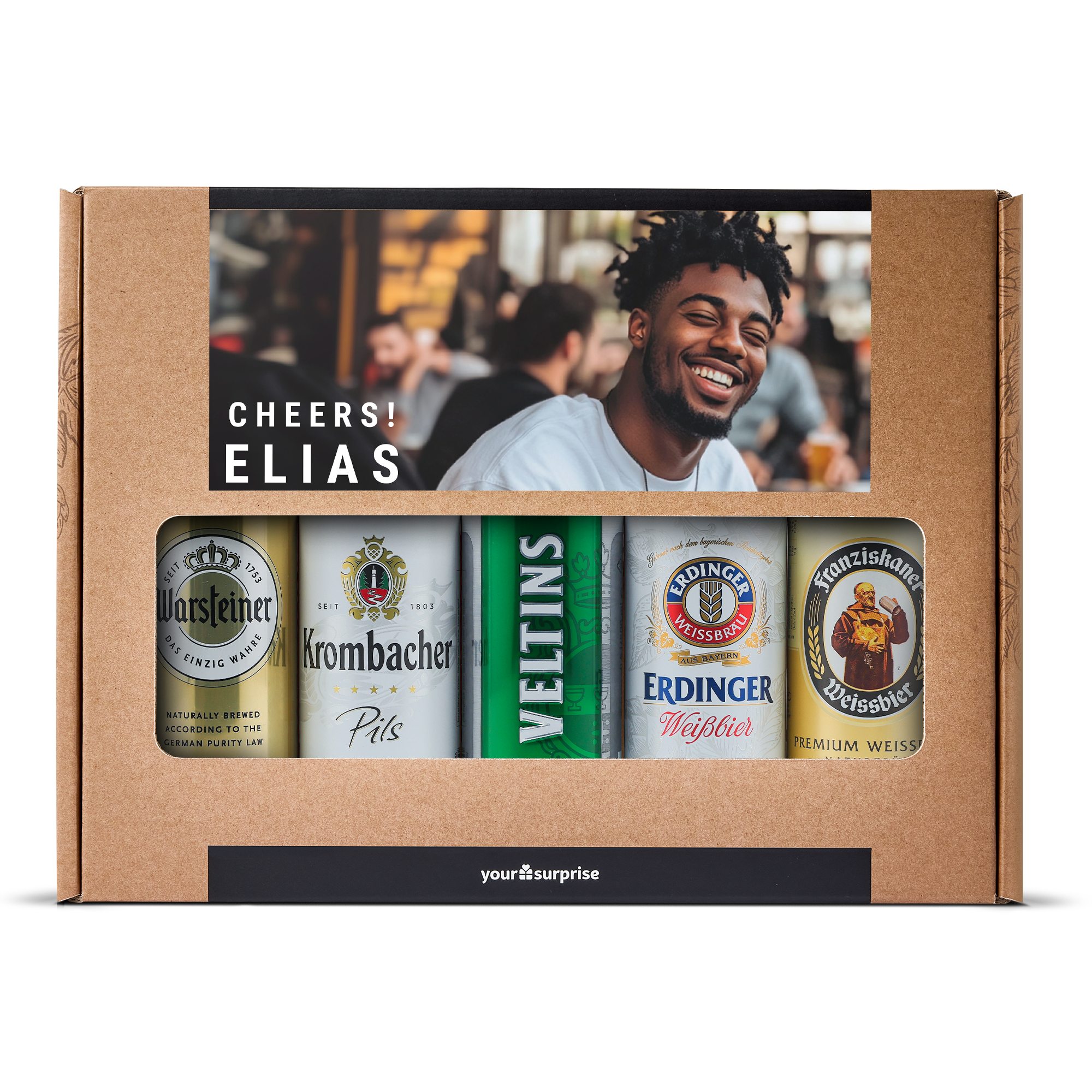 Удивите своего любимого ценителя пива персонализированным набором пивных банок. Роскошная подарочная коробка с фотографией, именем и/или логотипом. Включает 5 вкуснейших немецких сортов пива!