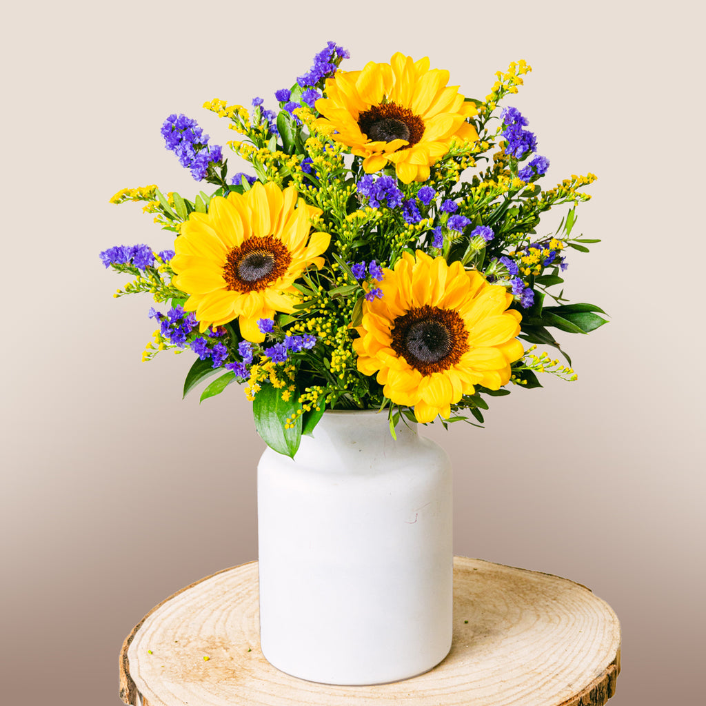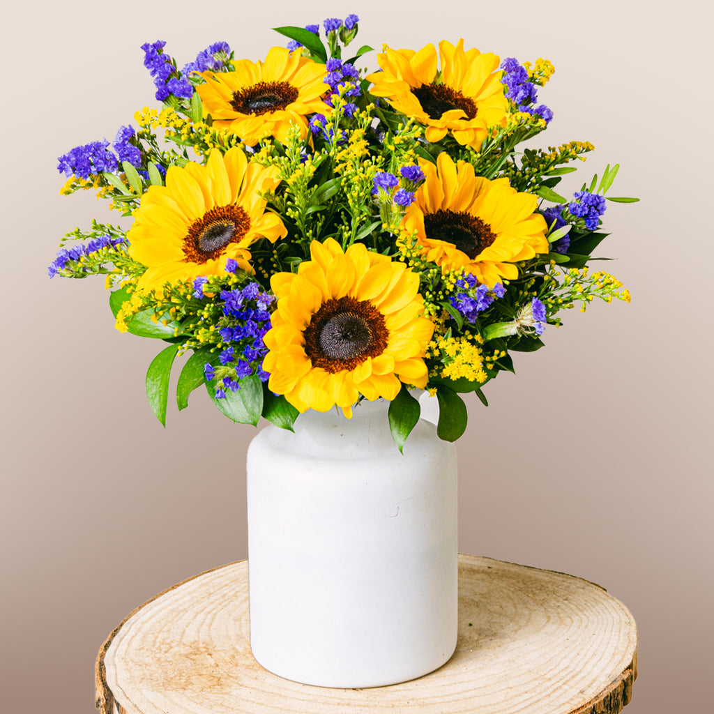 Яркие подсолнухи символизируют тепло, счастье и долголетие, а статица добавляет нотку свежести и легкости. Этот букет станет прекрасным способом выразить свою любовь и заботу.