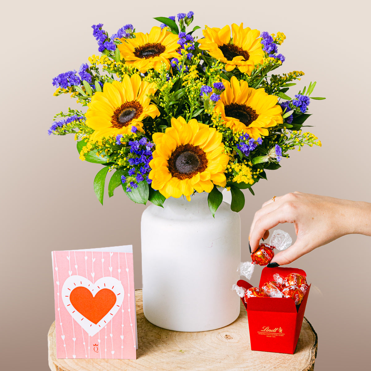 Сочетая яркость подсолнухов и свежесть стикса, мы создали пленительную смесь чистого счастья. Лучистые подсолнухи - это незабываемый подарок для особенного человека, который может мгновенно изменить его день одним лишь текстовым сообщением. Это лучший способ сказать "спасибо" и подарить радость лета.