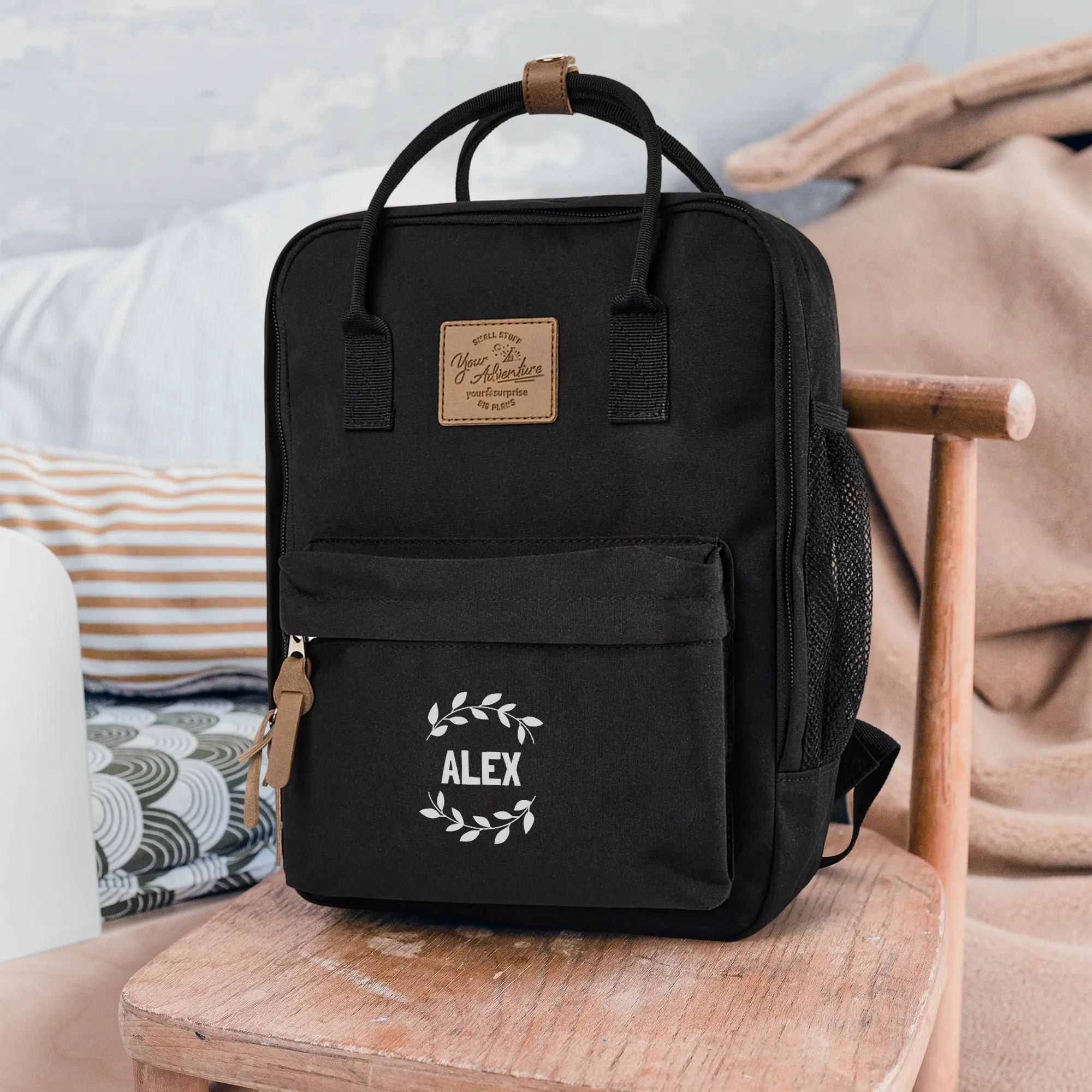 Черный рюкзак, имя на заказ, полиэстер, искусственная кожа.