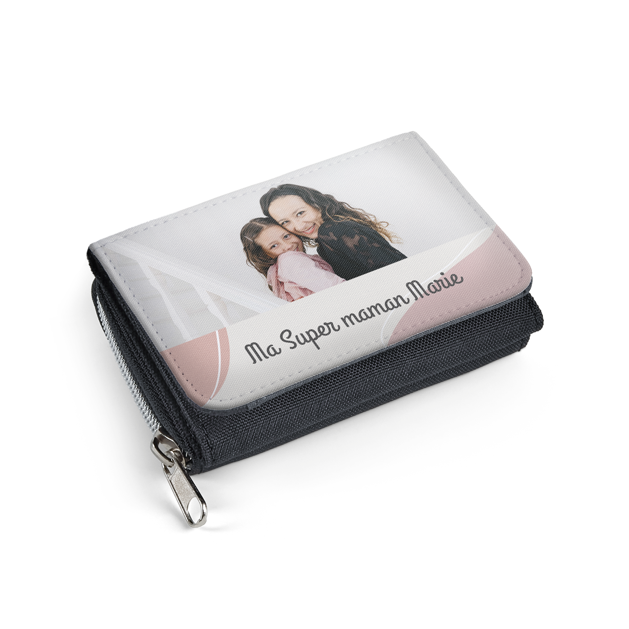 Подробнее о маленьком кошельке:Цвет: черныйМатериал: 100% прочный полиэстерРазмеры: 12 x 9,5 смПерсонализация: нанесение имени, фотографии и/или логотипаПечать: безупречная и полноцветнаяПрактичные дополнения: — Отделение для 5 карт — Накладной карман для купюр — Отдельный карман на молнии для монет