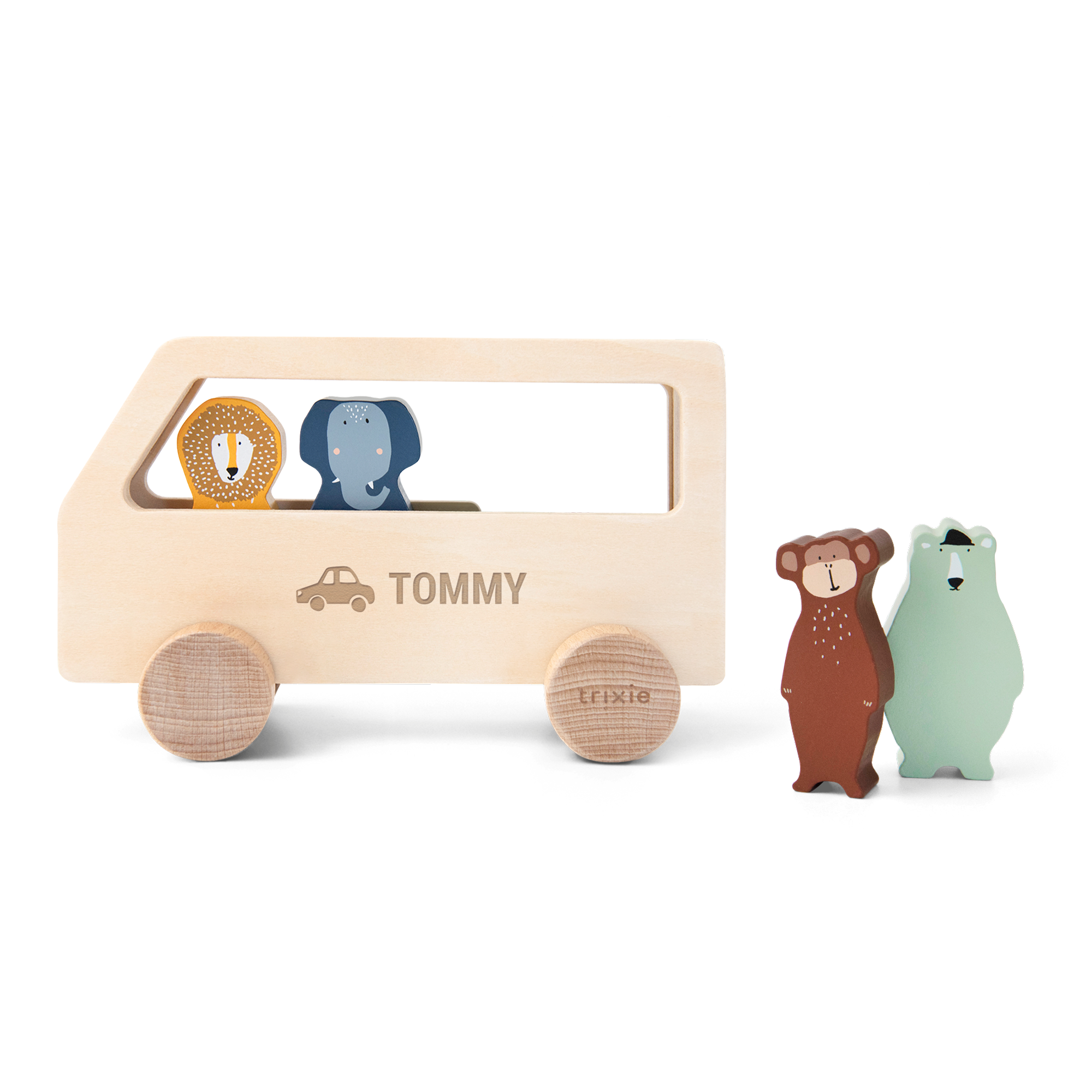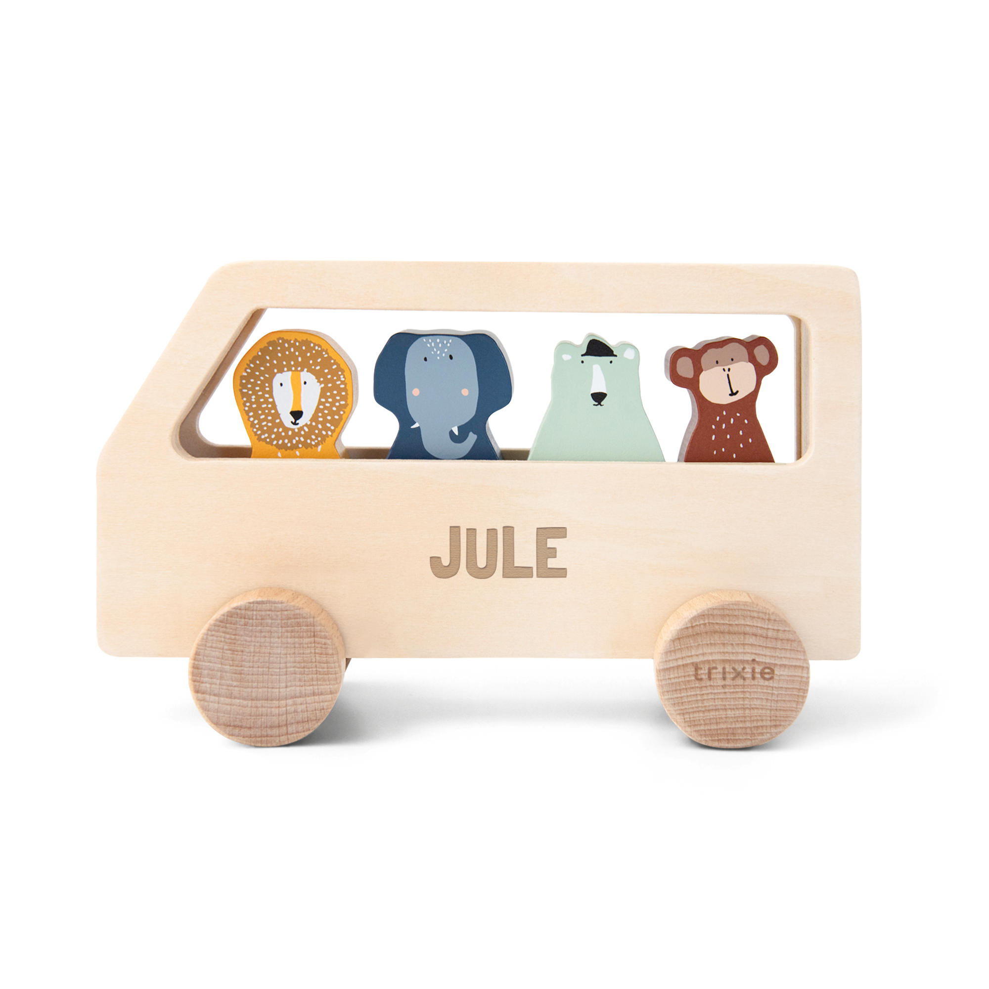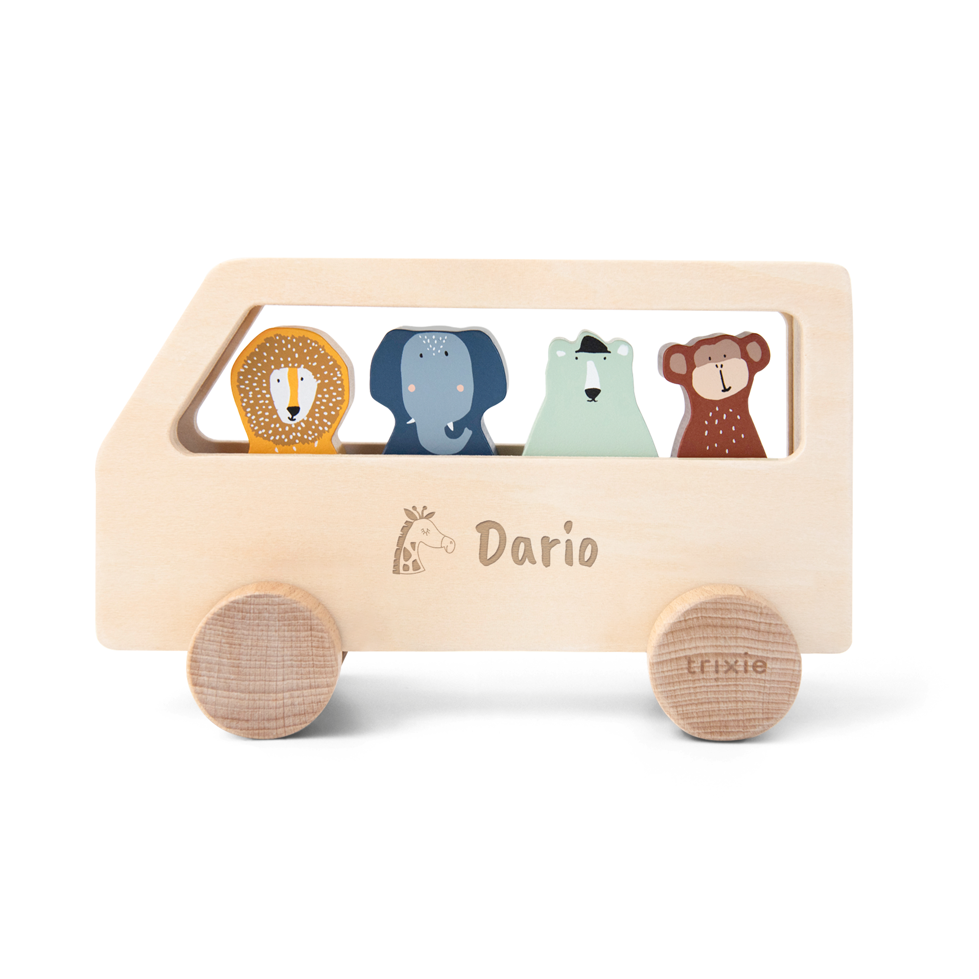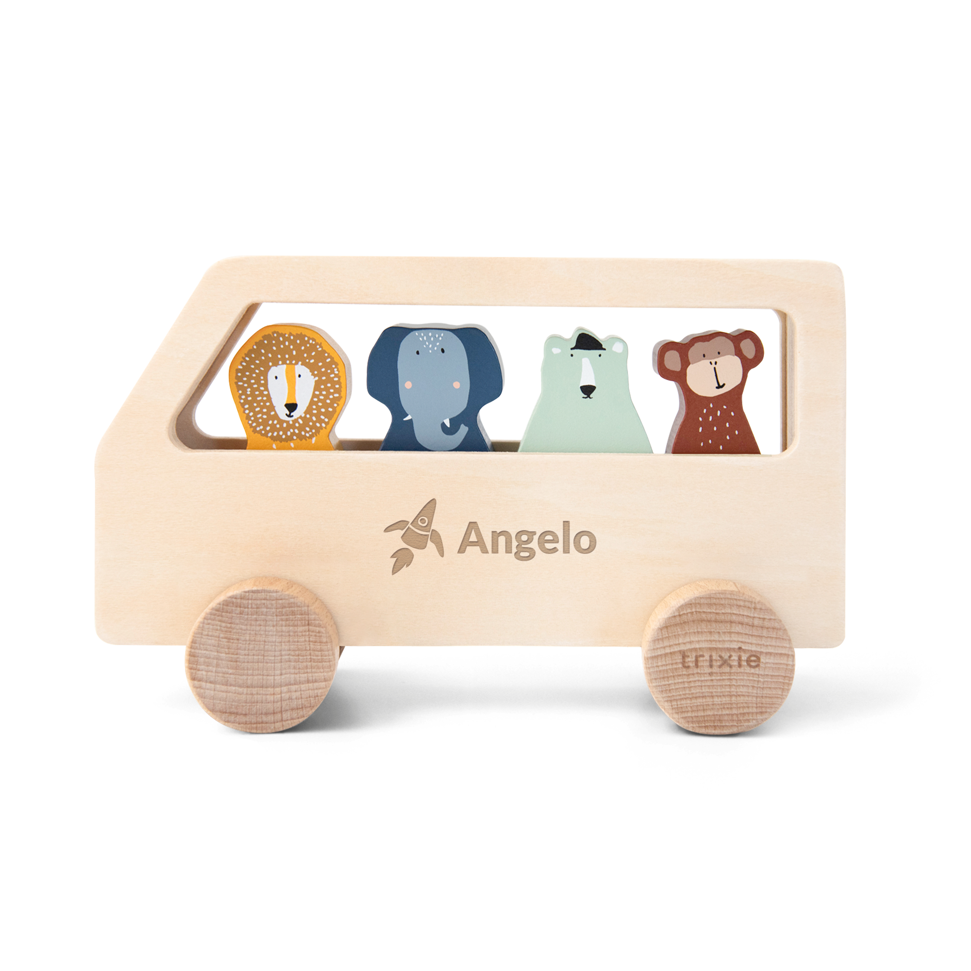 Милый деревянный игрушечный автобус Trixie с выгравированным именем получателя. В комплекте четыре съемных деревянных зверюшки.