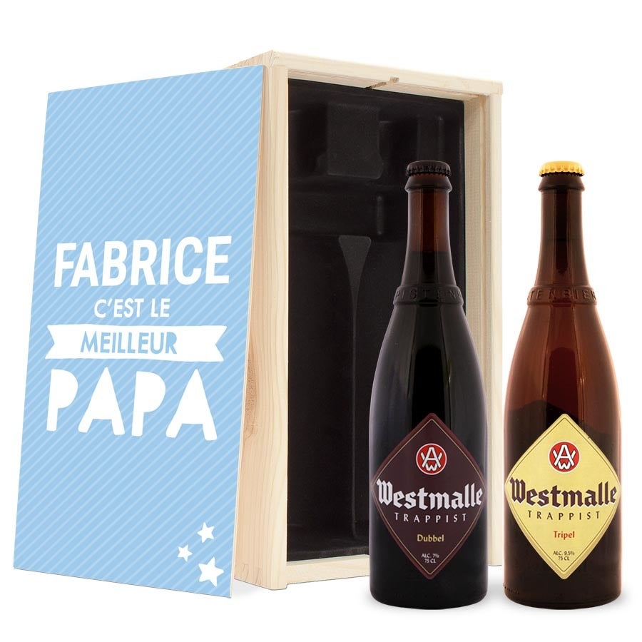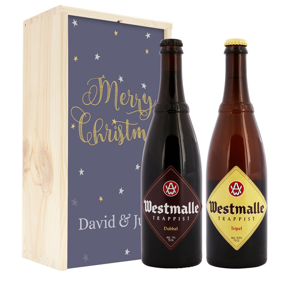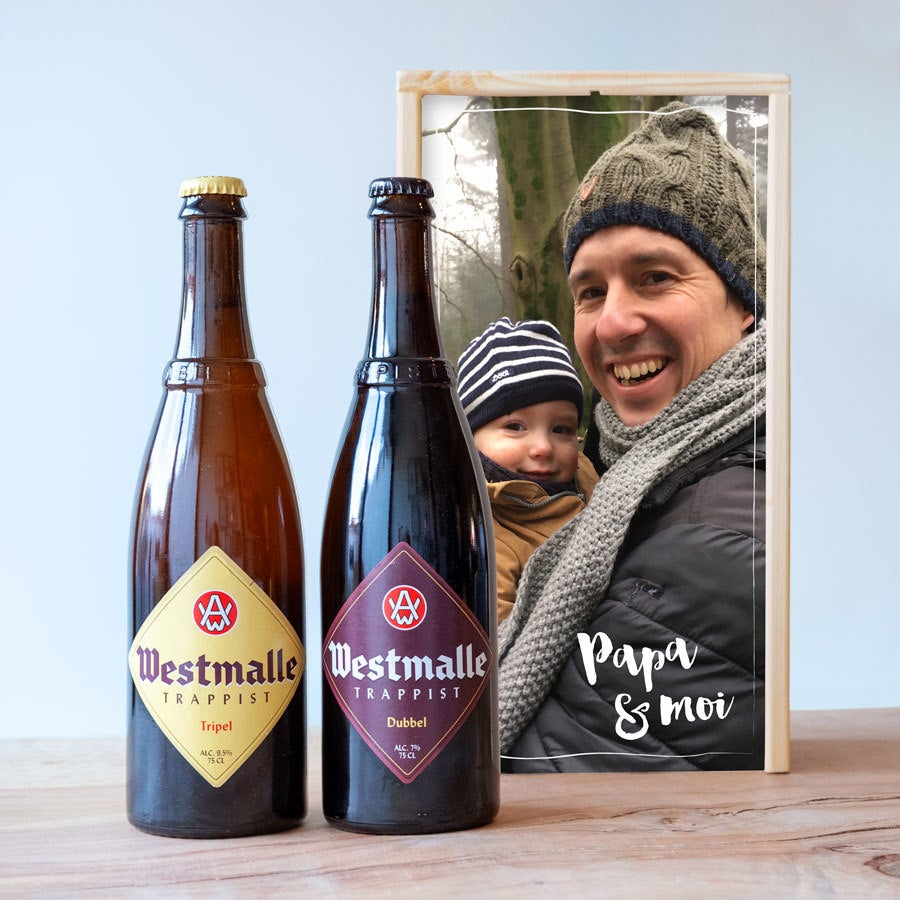 Изысканные бутылки пива Westmalle Double и Tripel в роскошном деревянном футляре, персонализированном фотографией, логотипом и/или текстом на ваш выбор.