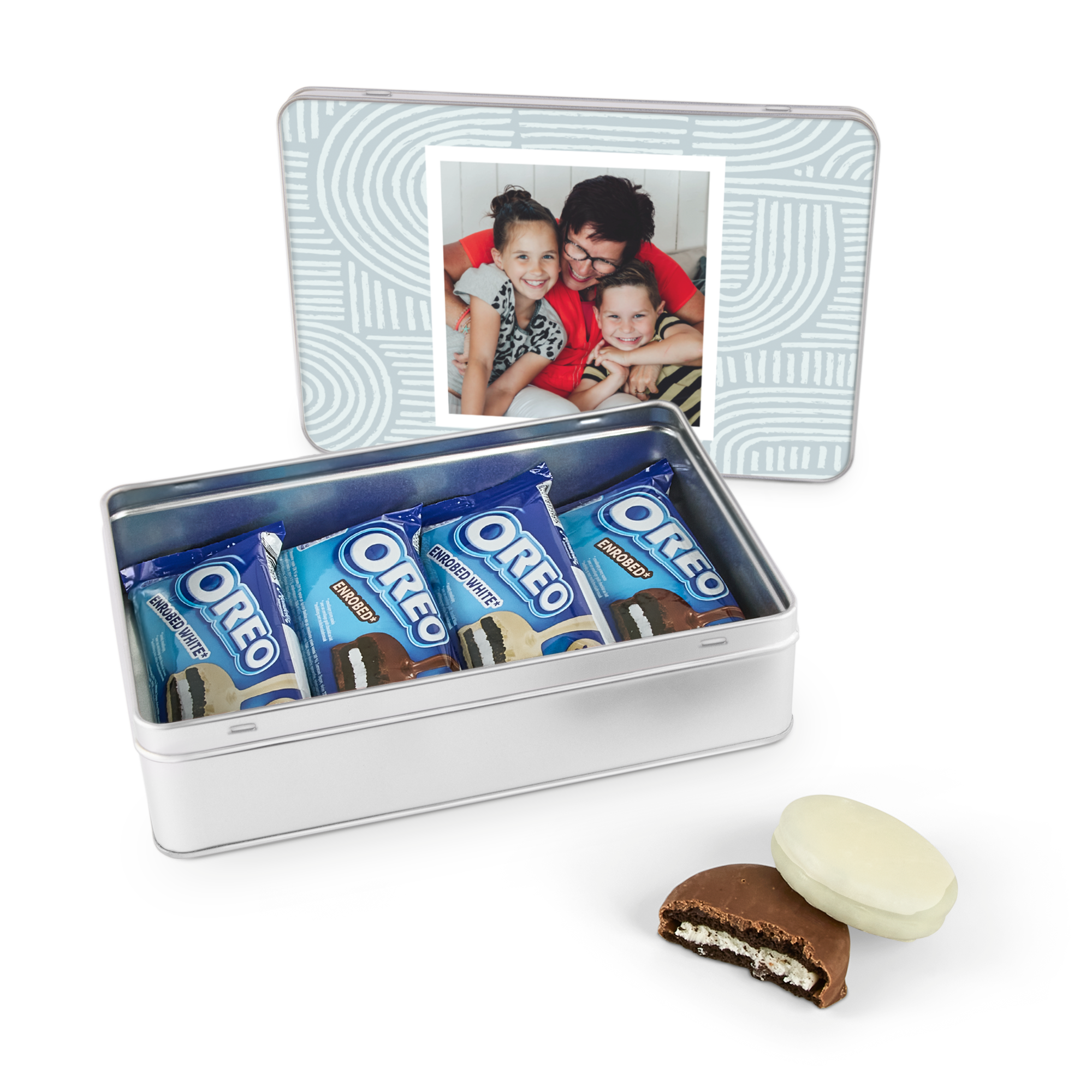Супер крутая жестяная банка для хранения с фотографией и/или именем! Наполнена вкусным печеньем Oreo, покрытым слоем шоколада.