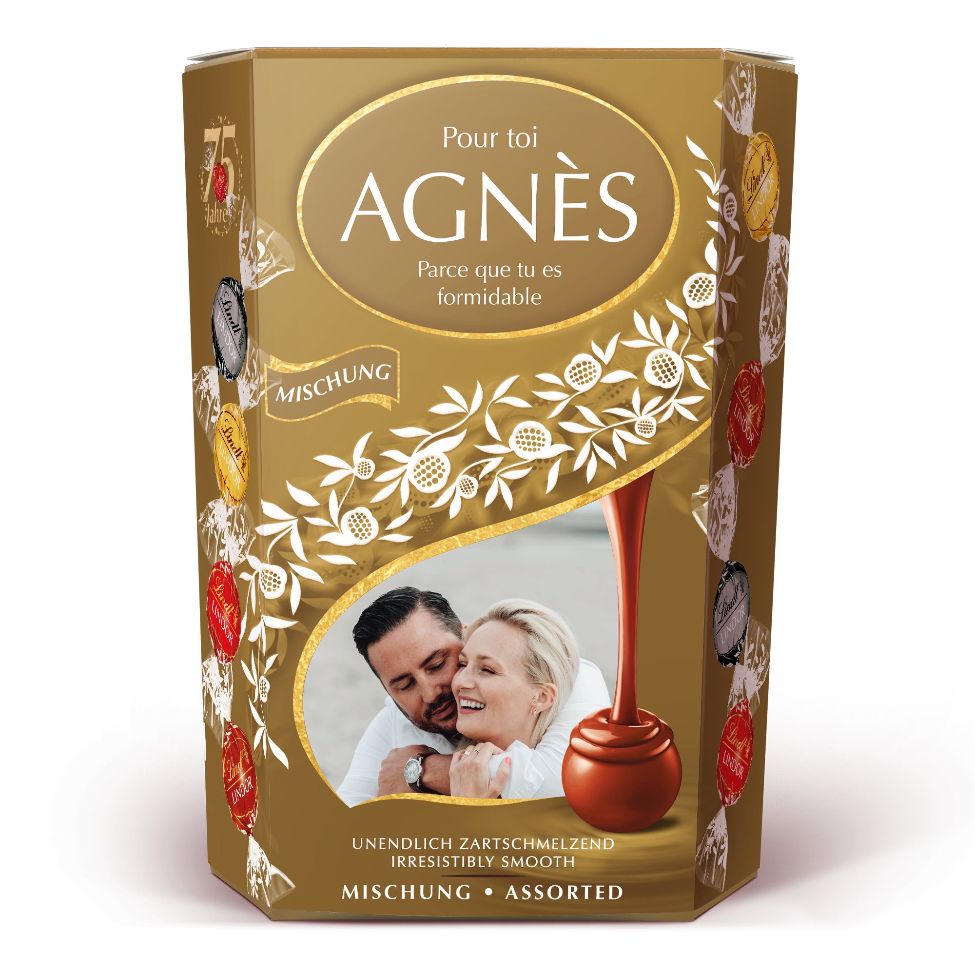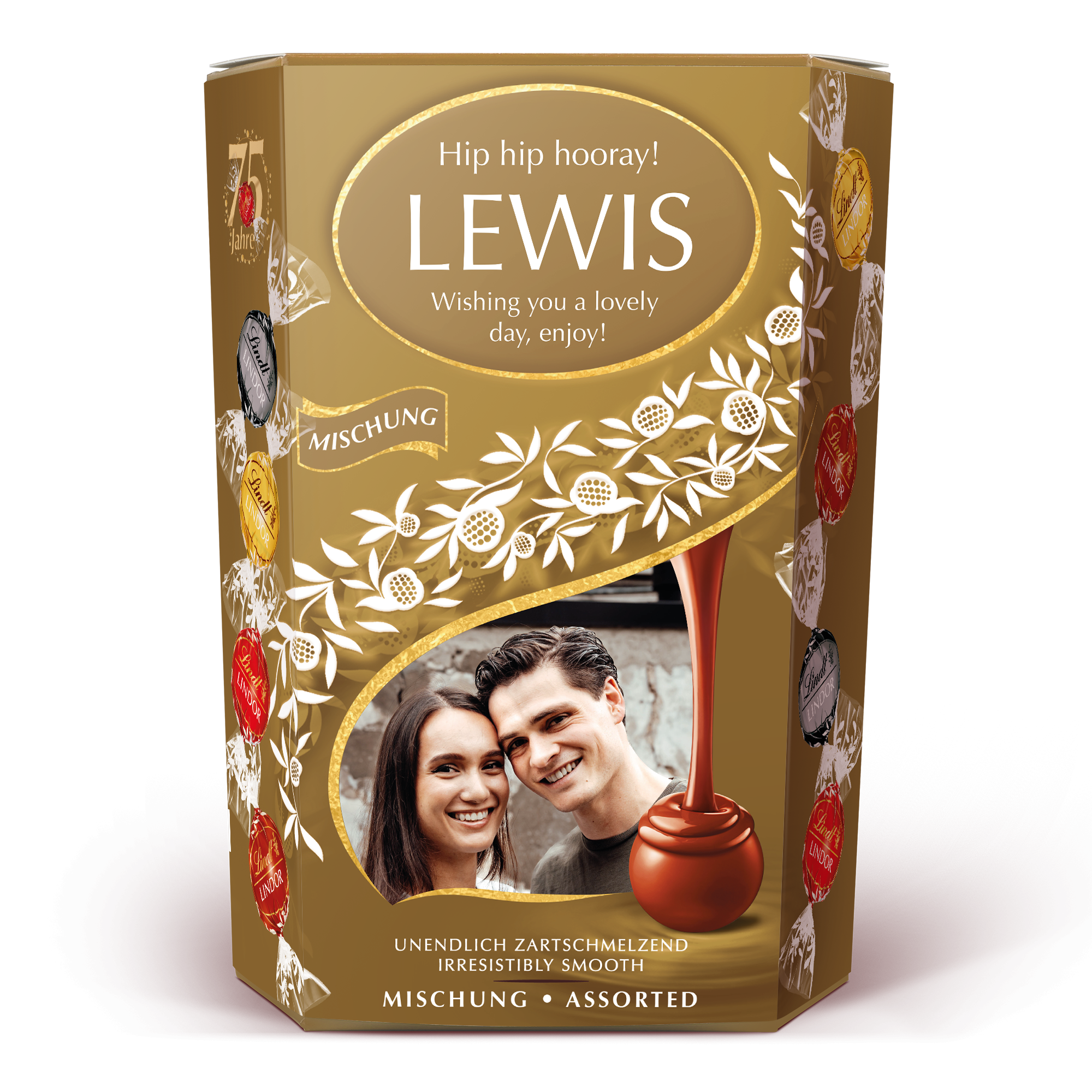 Подробнее о подарочной коробке шоколада Lindt: Шоколад: молочный шоколад Lindor, молочный с лесным орехом, белый и очень темный шоколад с мягкой и тающей начинкой Вес: 500 грамм Размеры: 14,4 x 8,3 x 19,5 см Персонализация: с фотографией, именем и личным посланием Печать: идеальная и полноцветная По техническим причинам, к сожалению, невозможно добавить кириллицу, арабские или специальные символы. При температуре наружного воздуха 25 градусов Цельсия или выше мы не можем гарантировать качество шоколада. Состав: сахар, растительные жиры (кокос, пальмоядровое), какао-масло, какао-масса, сухое цельное молоко, лактоза, сливочное масло, сухое обезжиренное молоко, безводный молочный жир, фундук, эмульгатор (соевый лецитин), экстракт ячменного солода, натуральные ароматизаторы, стручки ванили. Содержание какао: темный шоколад содержит не менее 45% какао. Аллергены: могут содержать другие ОРЕХИ