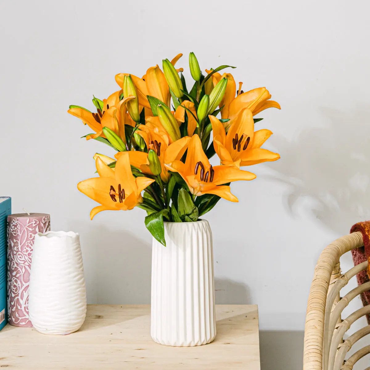 Яркий оранжевый цвет этих лилий символизирует энергию, страсть и позитив, делая их прекрасным способом отметить важные достижения и моменты в жизни.