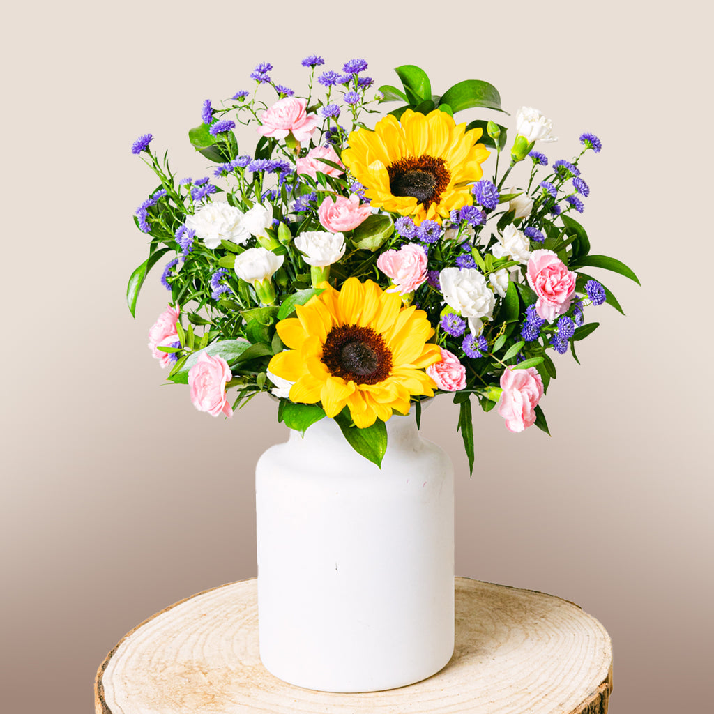 Яркие подсолнухи, нежный лимониум и легкий лентискус создают гармоничный и жизнерадостный букет.