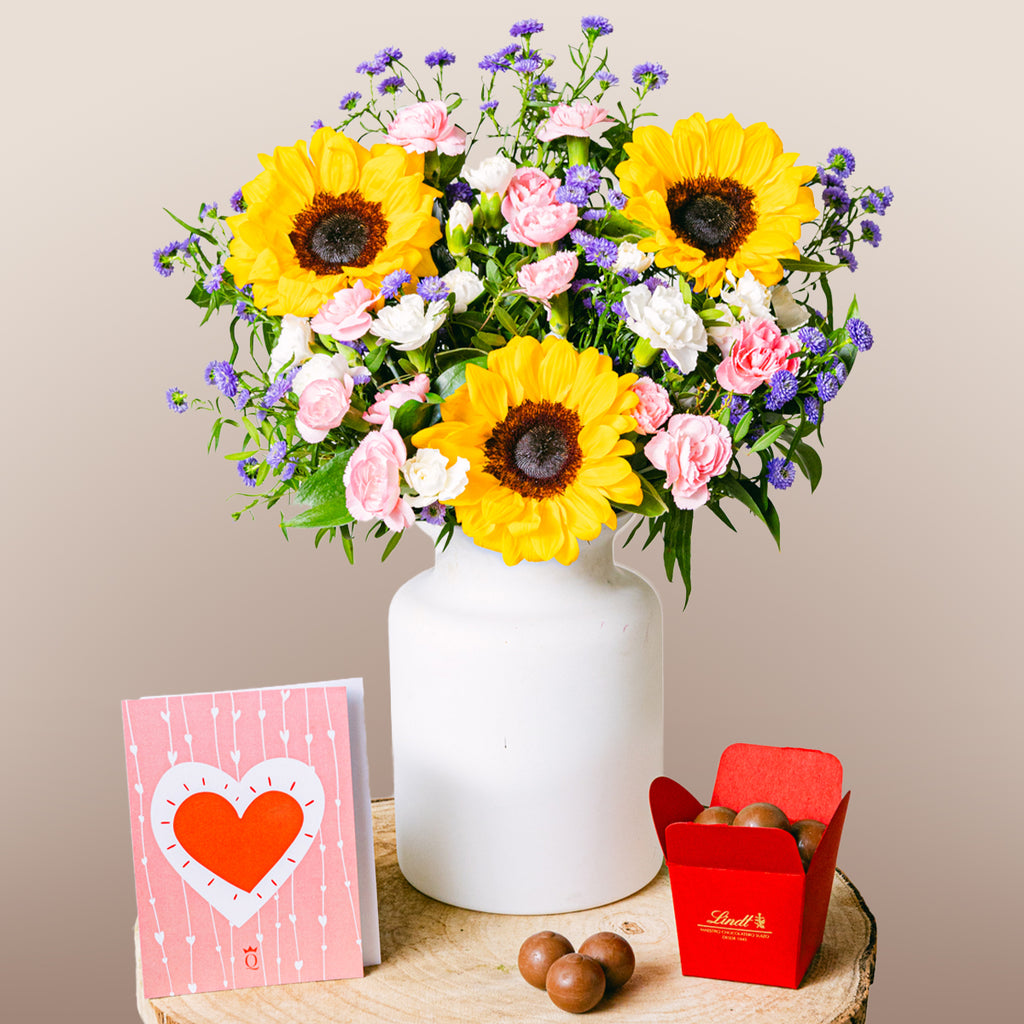 Пригласите этого особенного человека насладиться красочным закатом в своей гостиной. Благодаря желтому цвету подсолнуха, пурпурному цвету лимониума и красноватому оттенку лентискуса наш букет «Яркий закат» напоминает о чудесном летнем закате.